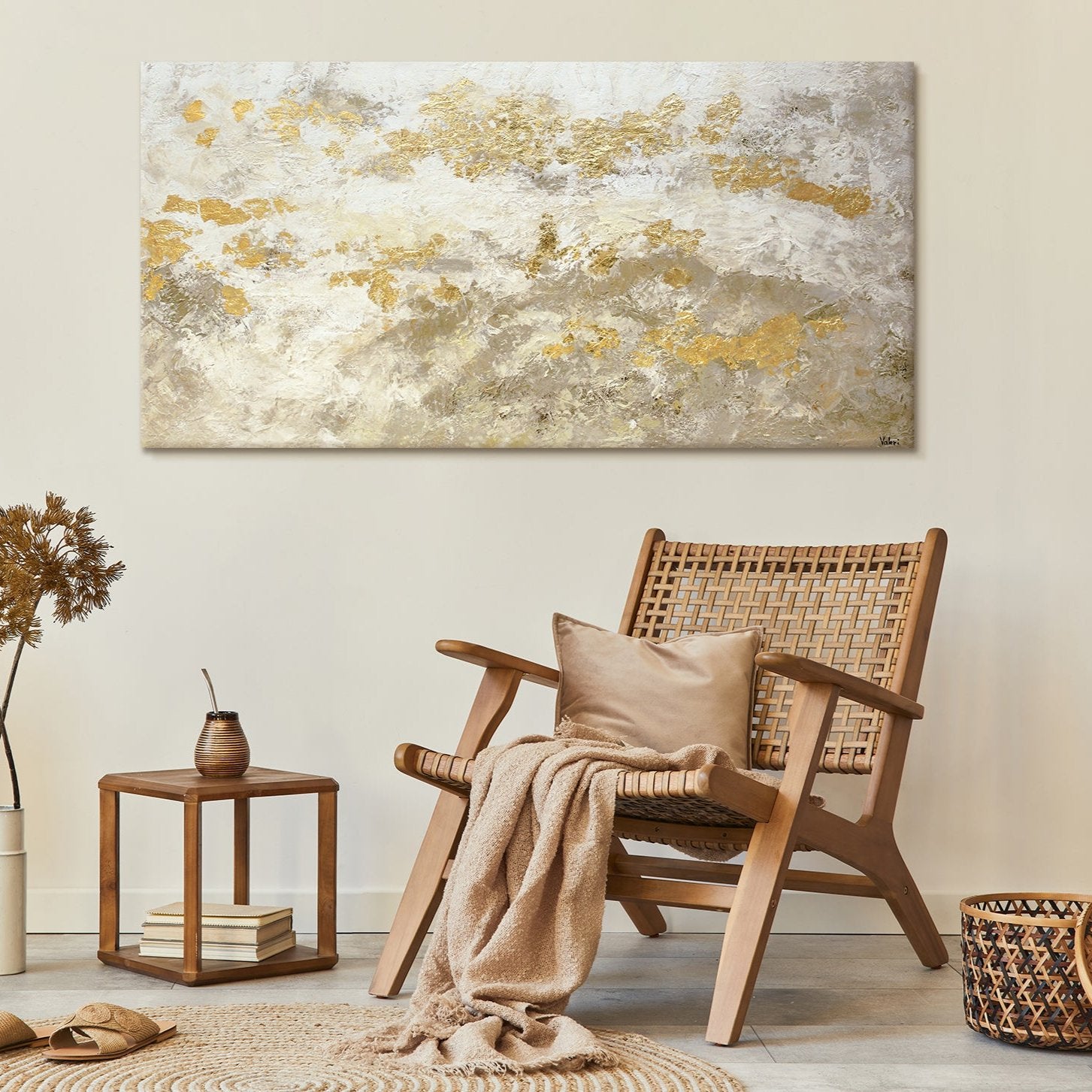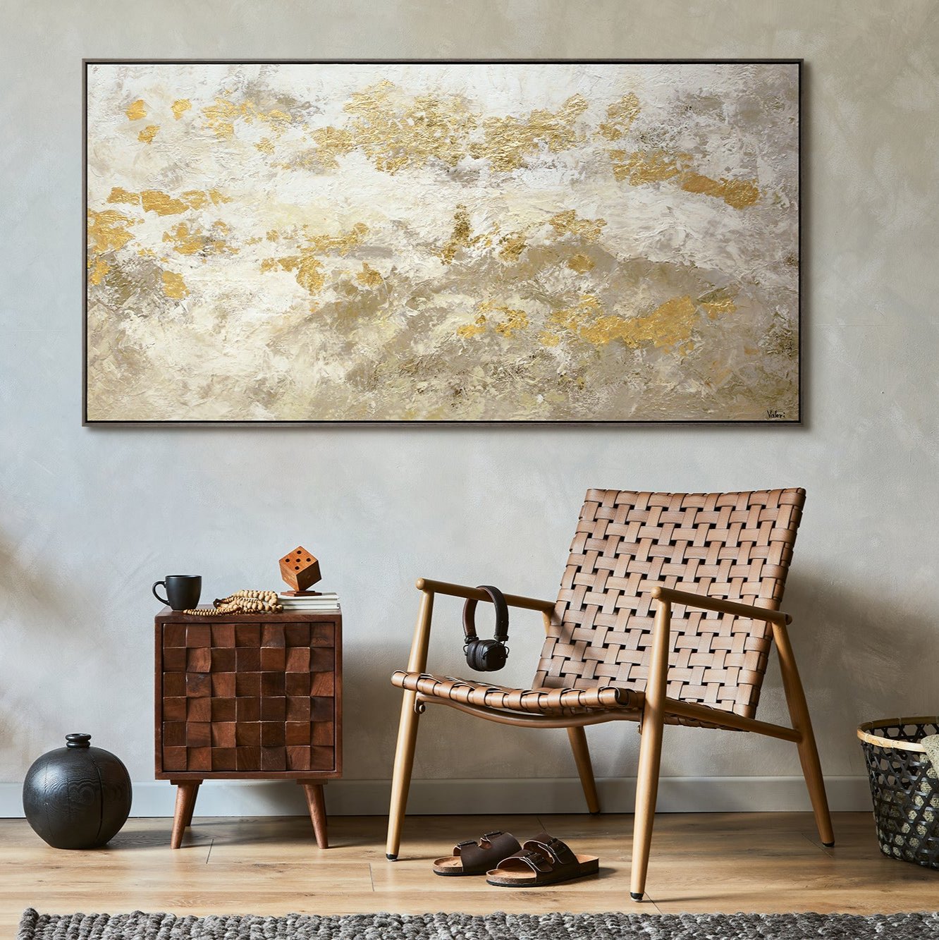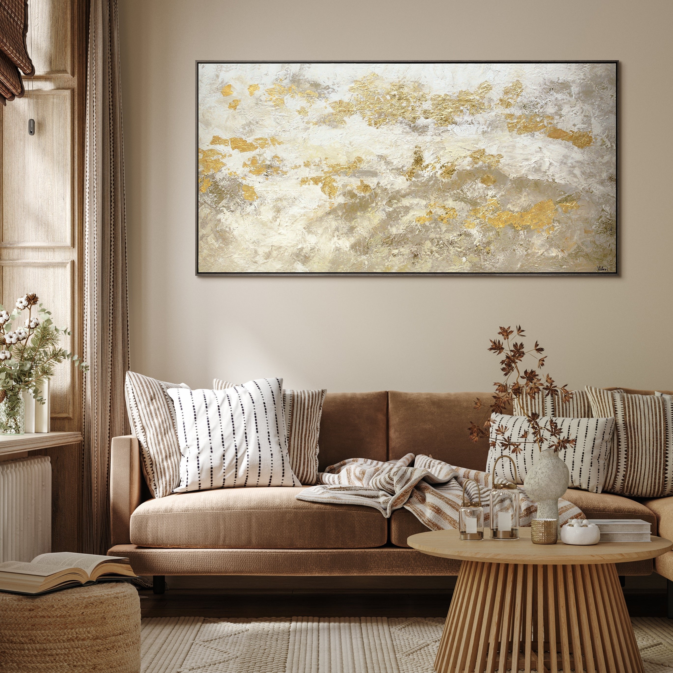 Este impresionante cuadro es una obra maestra del arte abstracto moderno, enriquecida con lujosos acentos dorados. La combinación armoniosa de tonos crema y dorados aporta al cuadro una estética elegante y atemporal, perfecta para interiores contemporáneos.