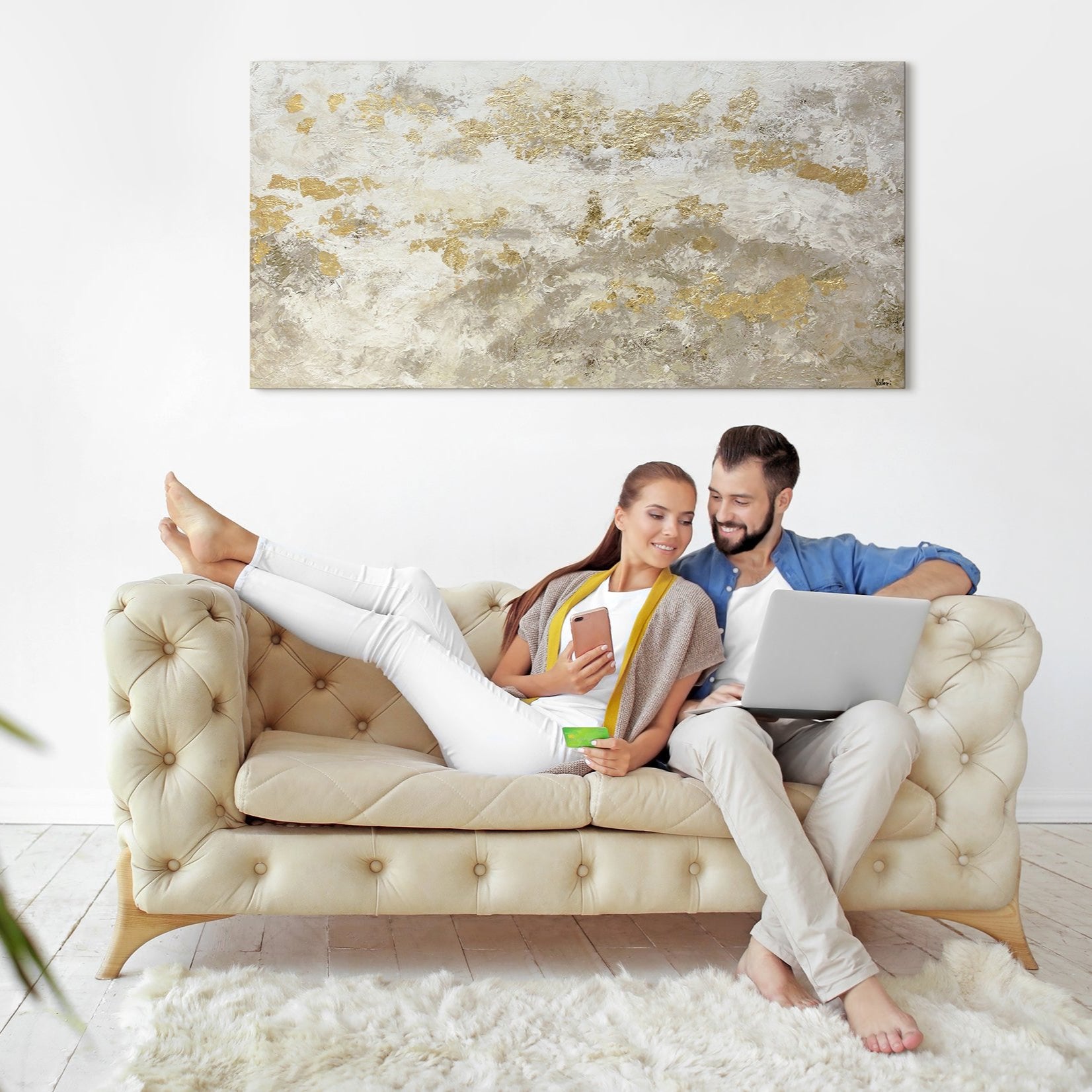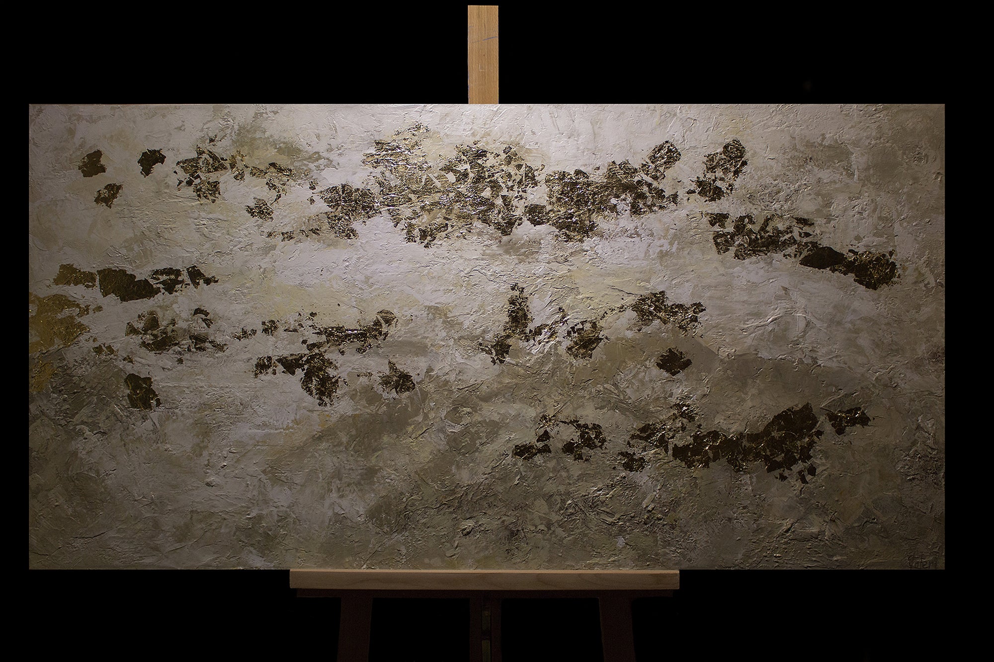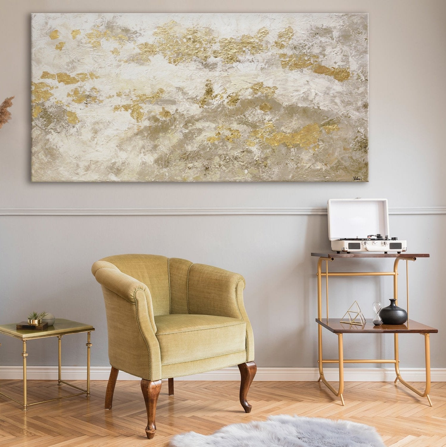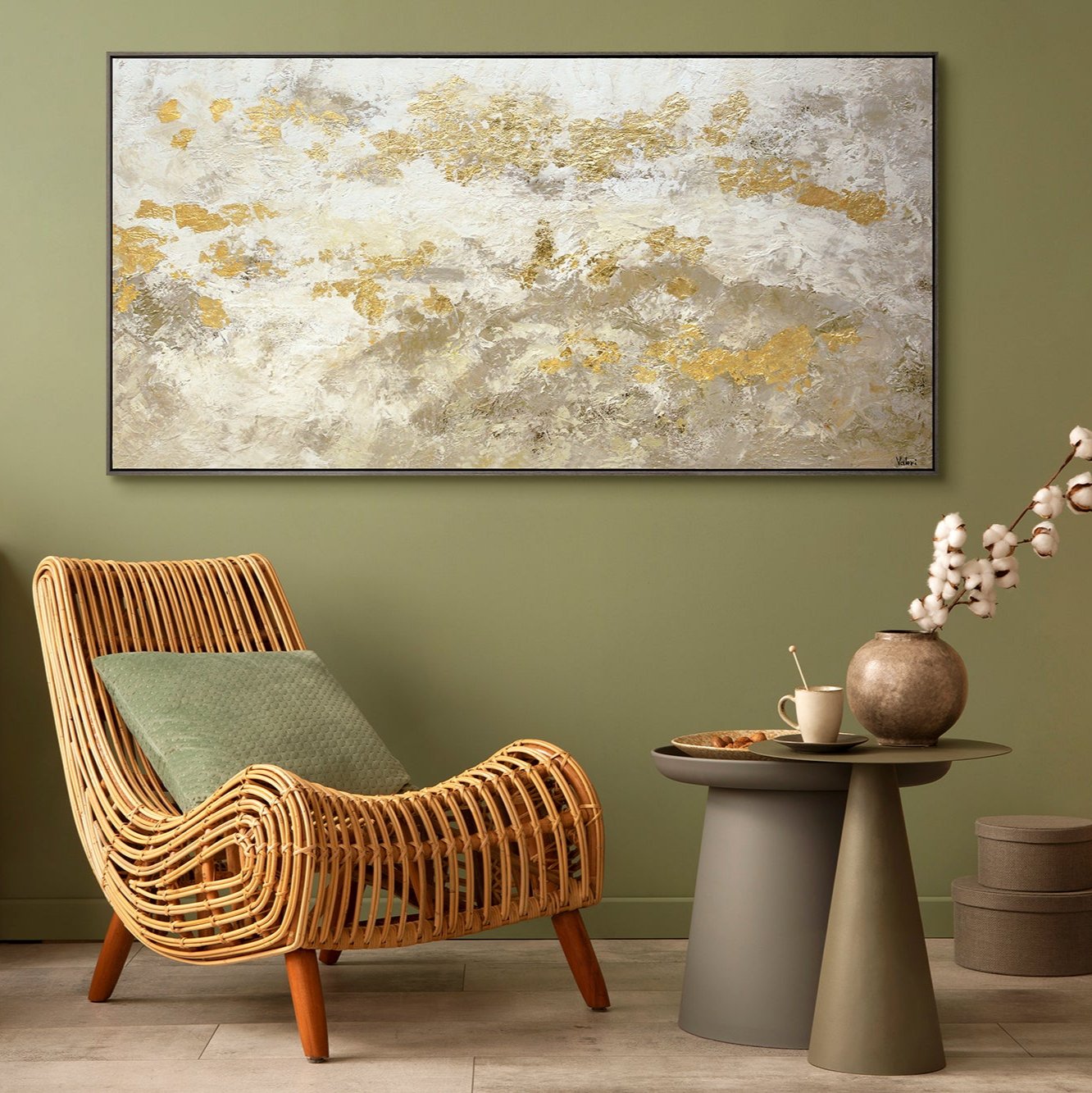 Este impresionante cuadro es una obra maestra del arte abstracto moderno, enriquecida con lujosos acentos dorados. La combinación armoniosa de tonos crema y dorados aporta al cuadro una estética elegante y atemporal, perfecta para interiores contemporáneos.