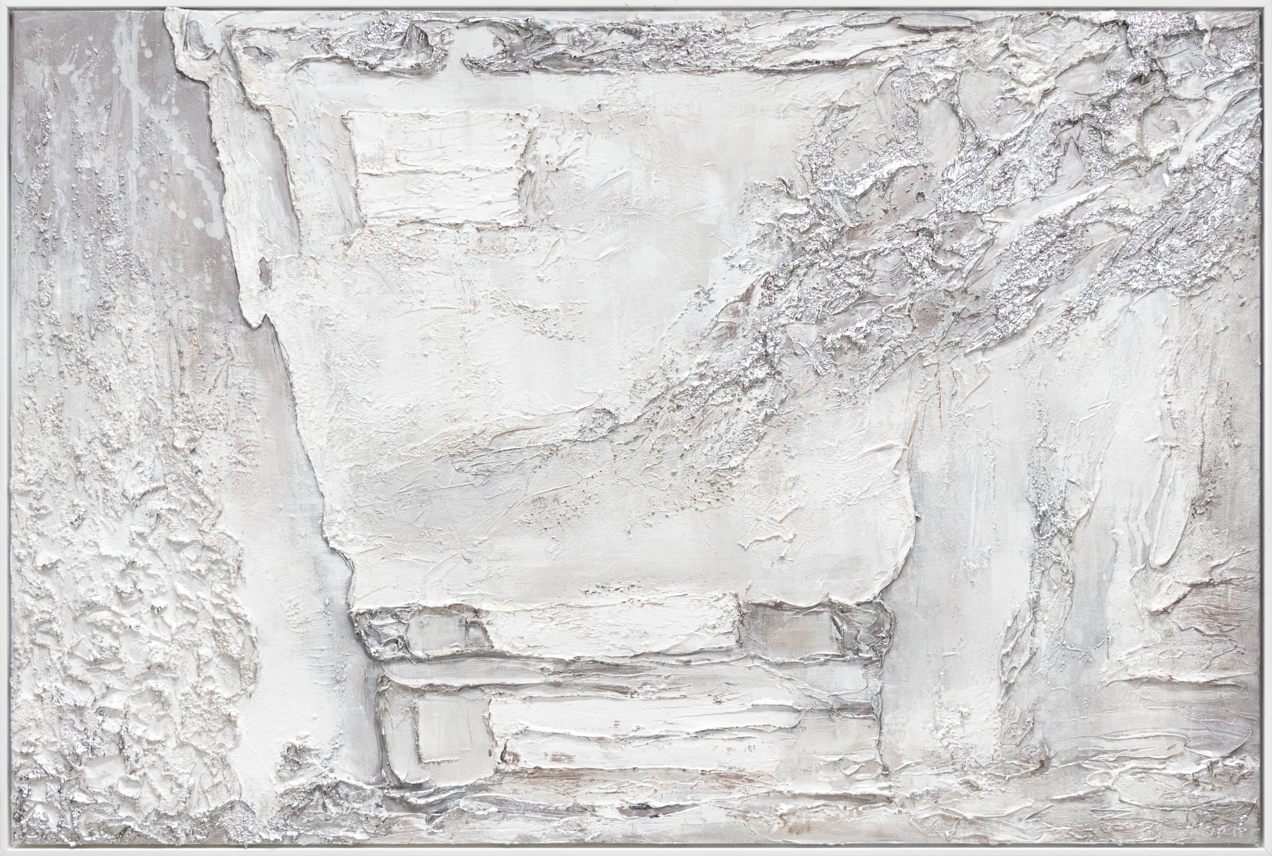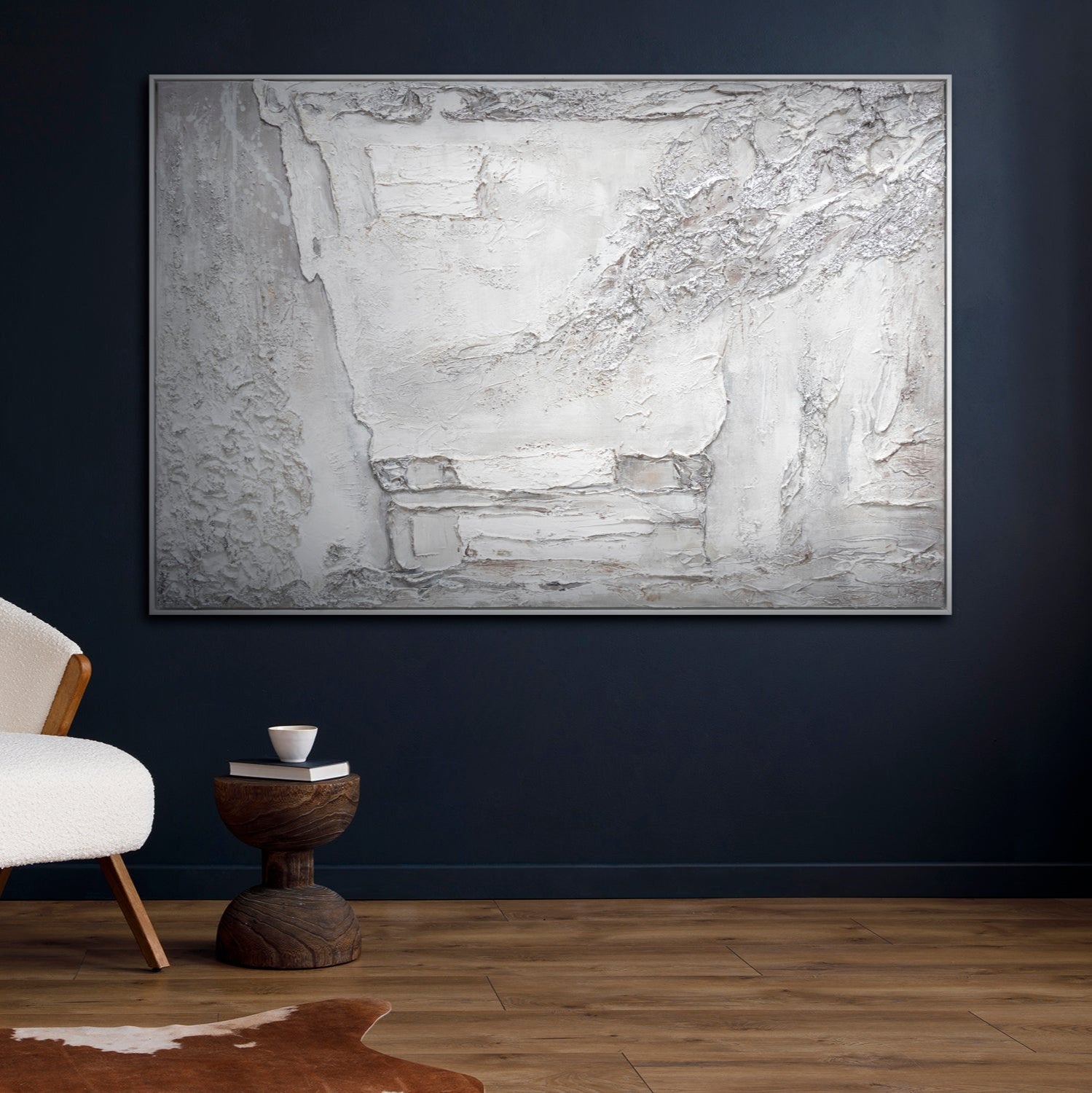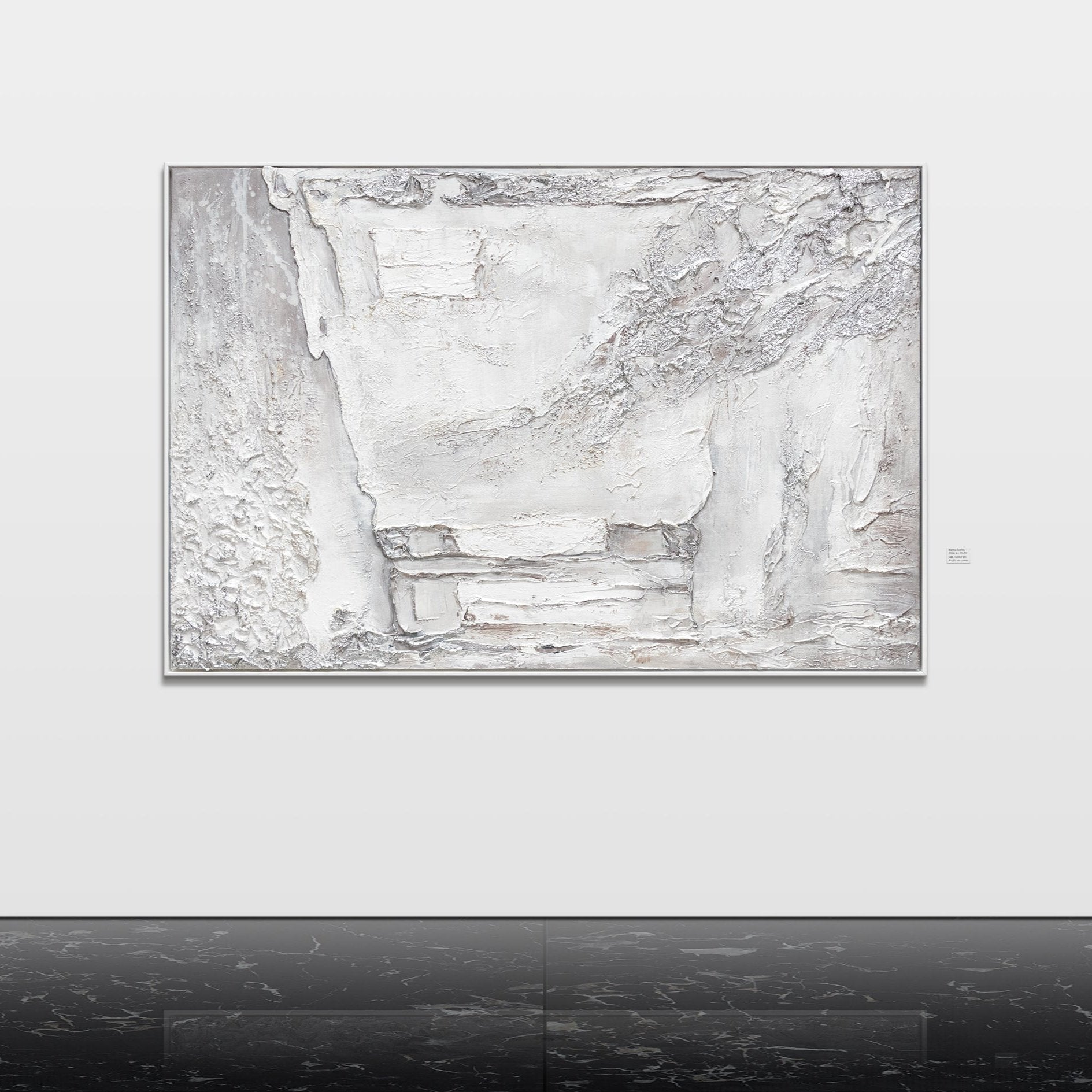 Esta obra de arte única pintada a mano destaca por su composición estructural y su sutil combinación de blanco y plata. La representación abstracta aporta un toque elegante y contemporáneo a cualquier espacio interior.