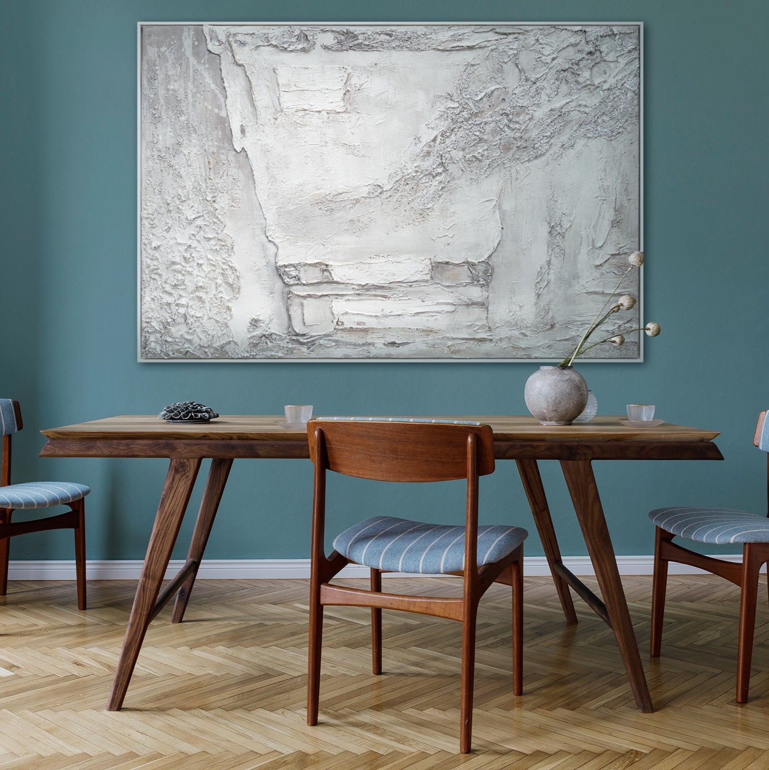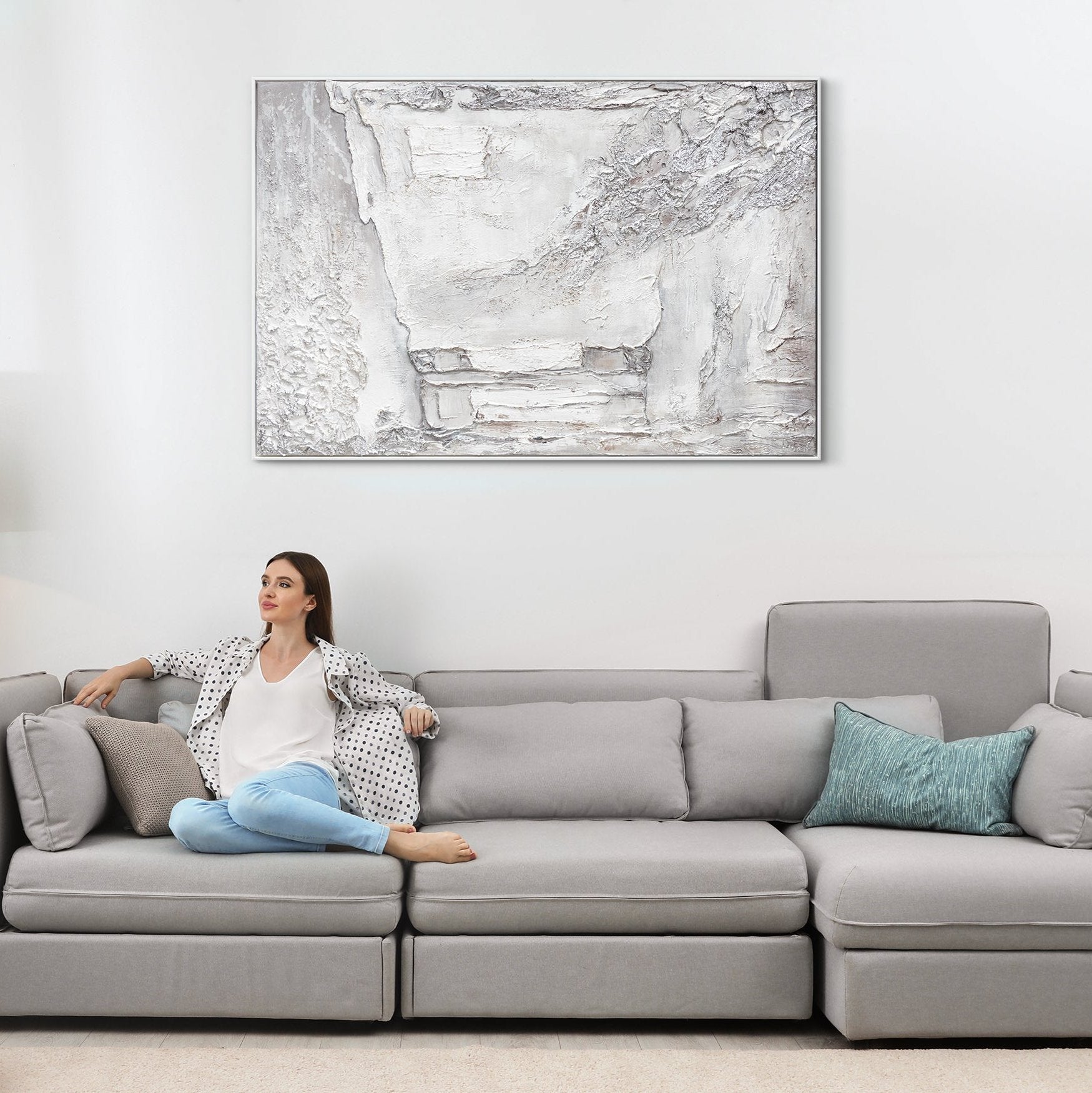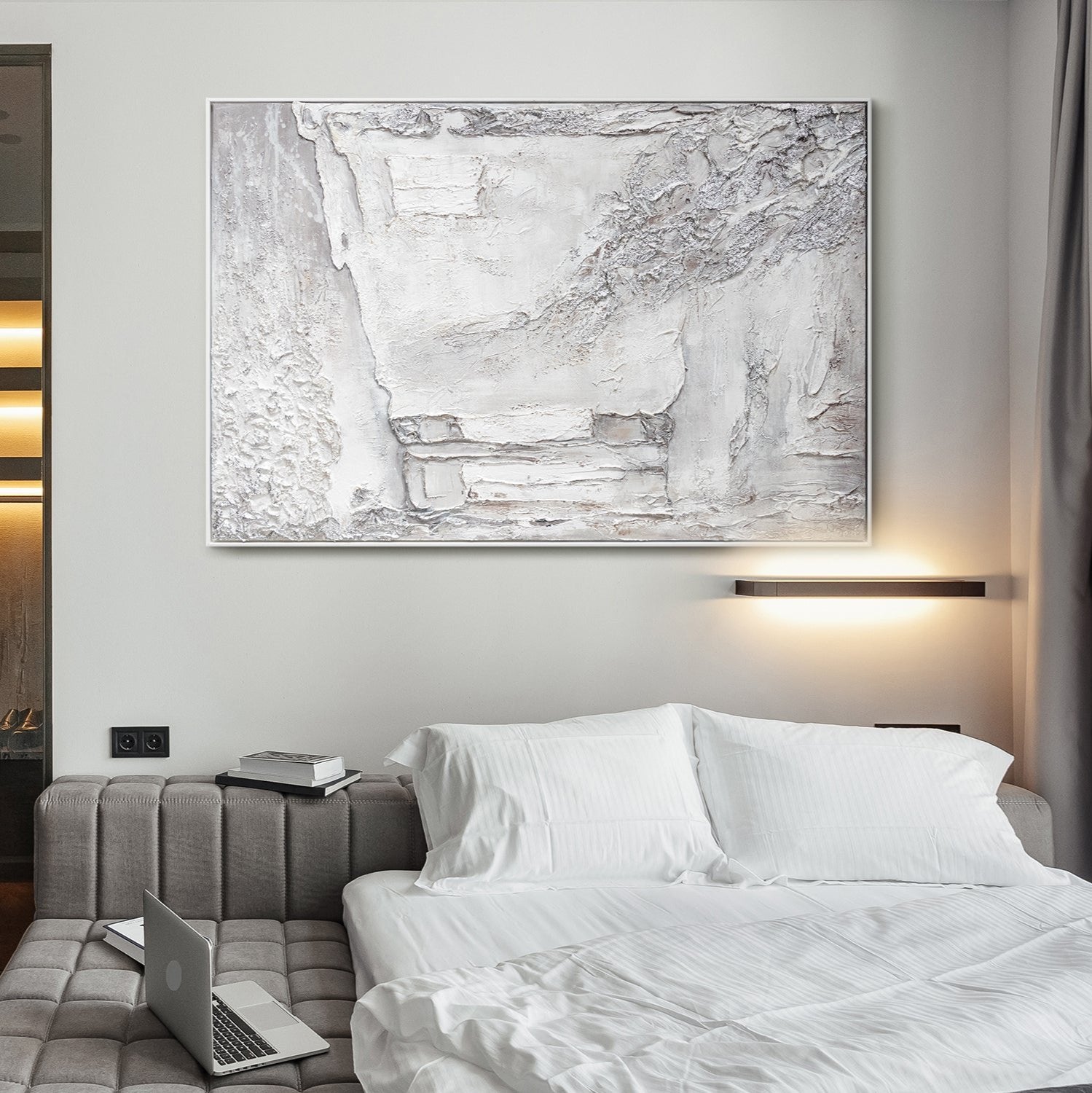 Esta obra de arte única pintada a mano destaca por su composición estructural y su sutil combinación de blanco y plata. La representación abstracta aporta un toque elegante y contemporáneo a cualquier espacio interior.