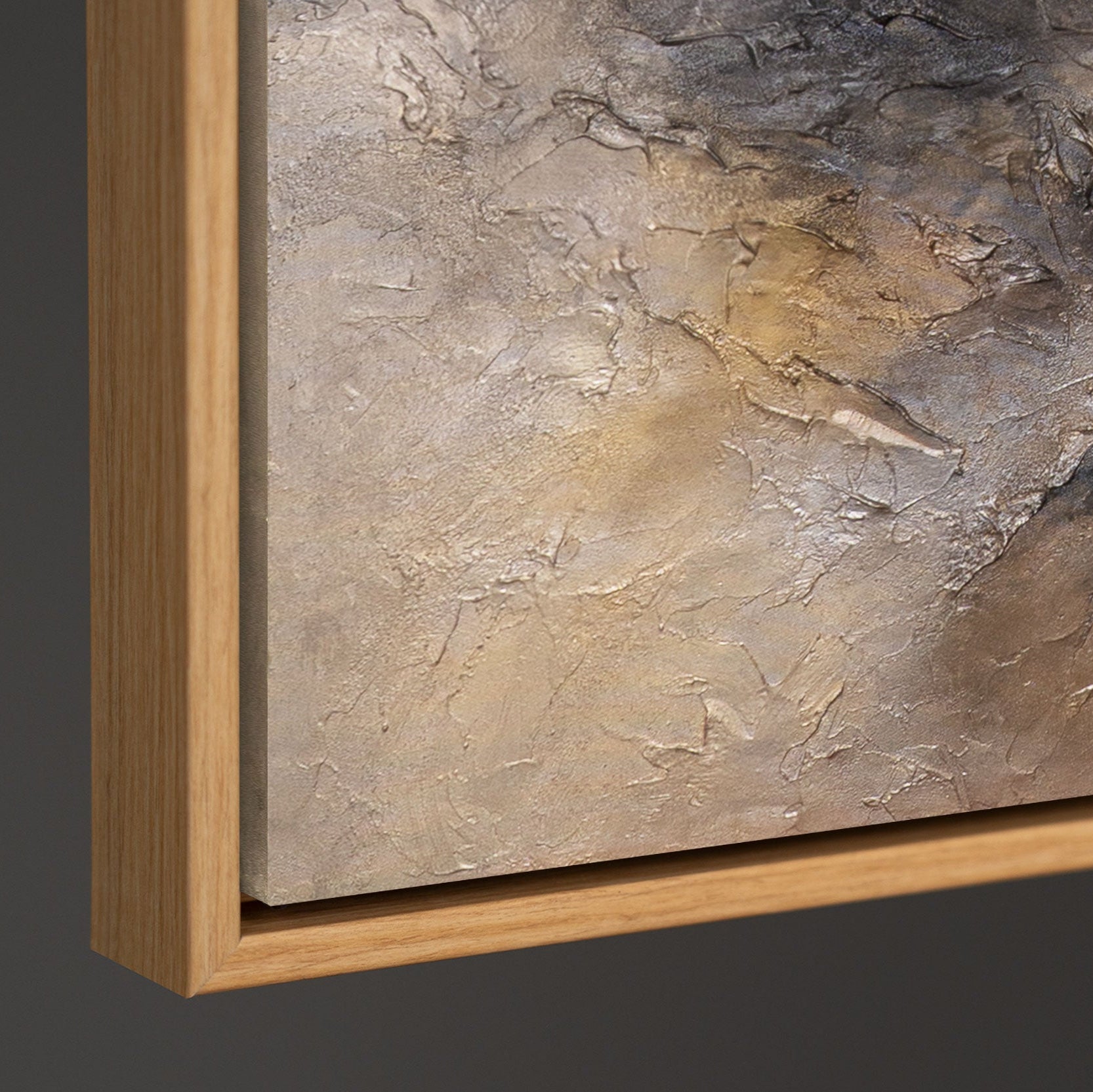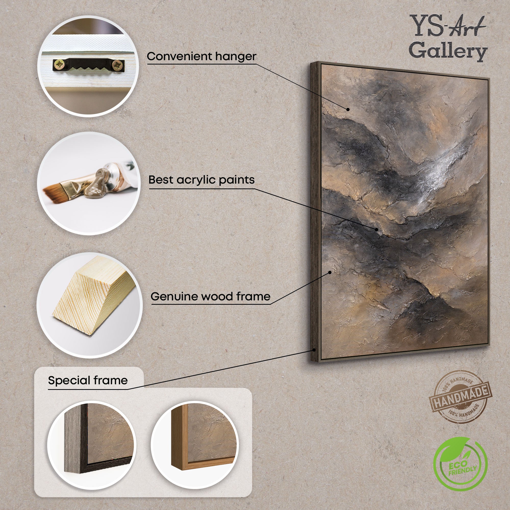 La pintura abstracta “Oscuridad y Amanecer” muestra una poderosa interacción entre el negro profundo, el marrón terrenal y los acentos metálicos brillantes. Con su superficie en relieve, la obra crea una vibrante sensación de movimiento, evocando la transición de la noche al día.