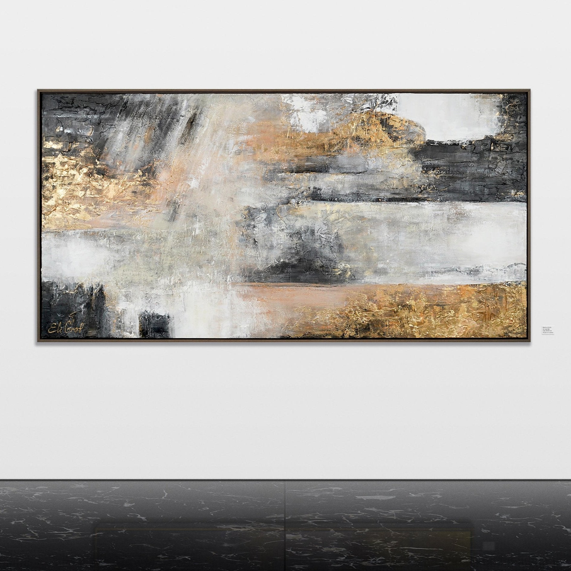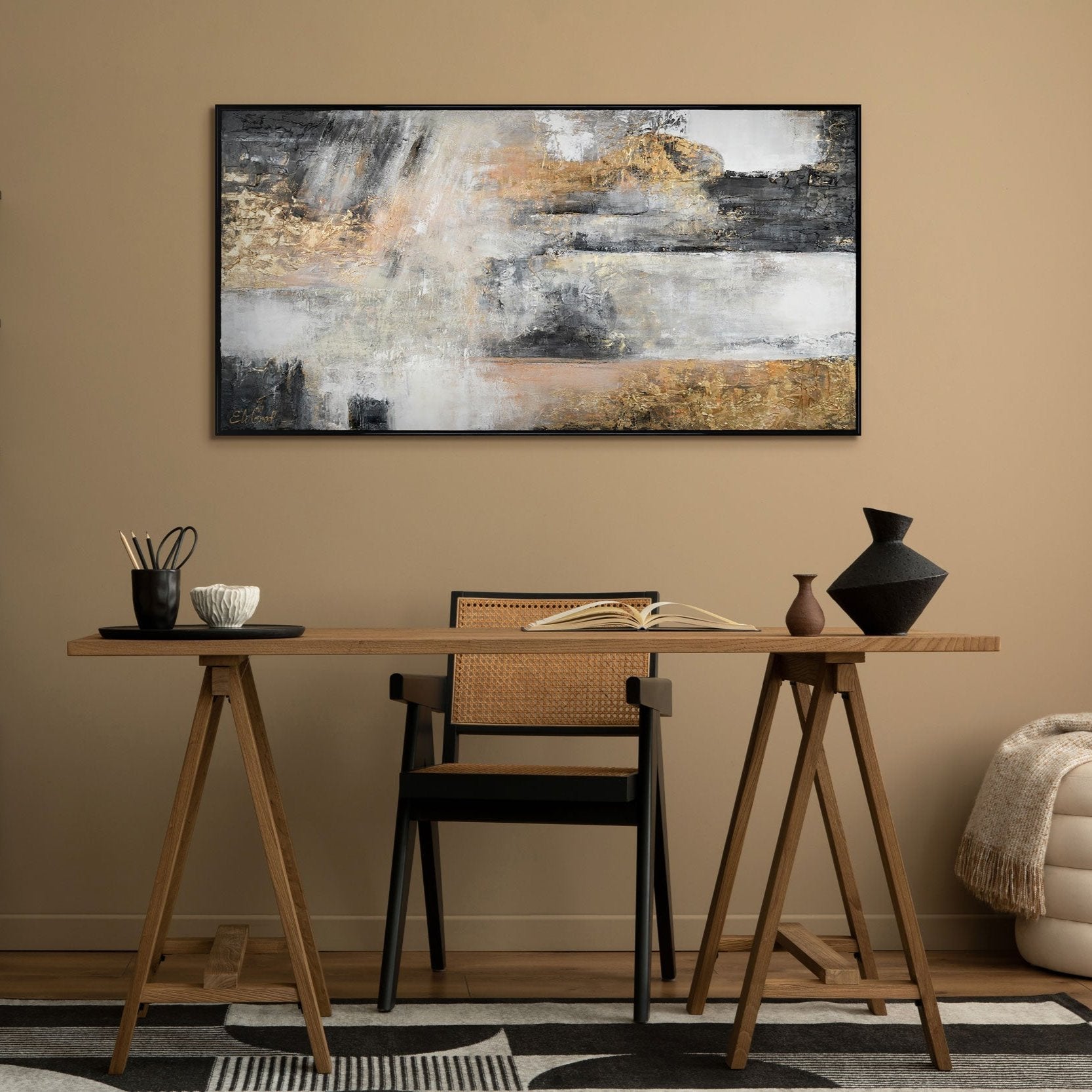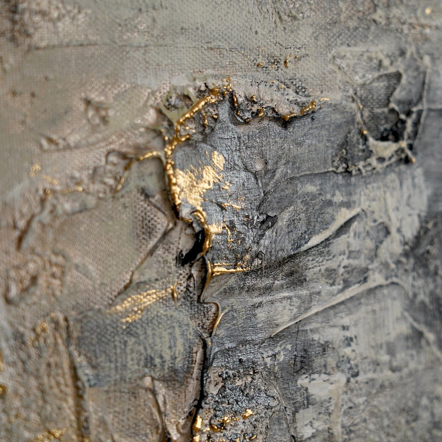 Esta pintura abstracta hecha a mano sobre lienzo destaca por su textura intensa y la armoniosa combinación de tonos neutros con acentos dorados.