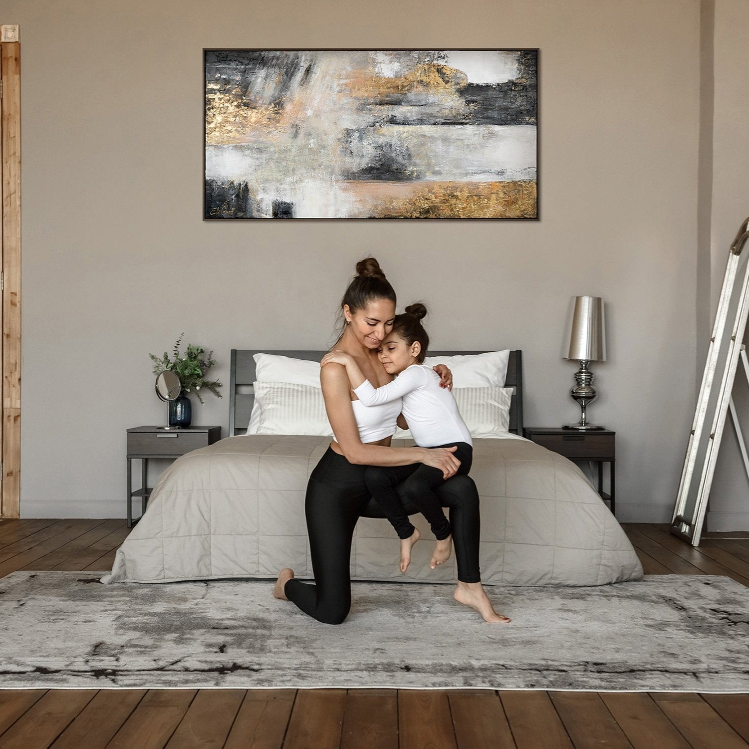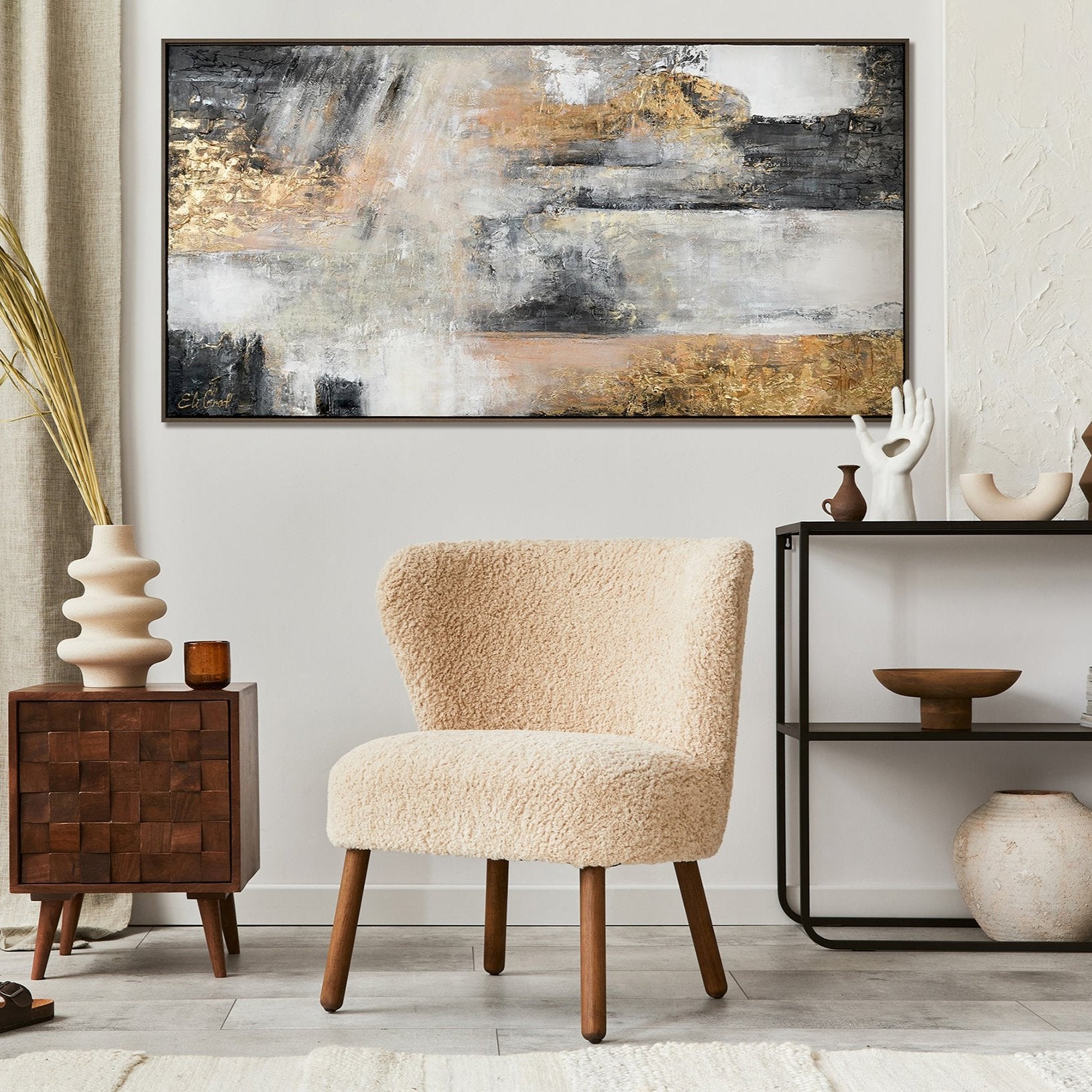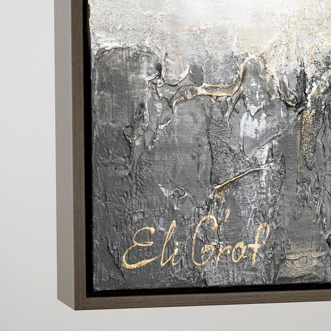 Esta pintura abstracta hecha a mano sobre lienzo destaca por su textura intensa y la armoniosa combinación de tonos neutros con acentos dorados.
