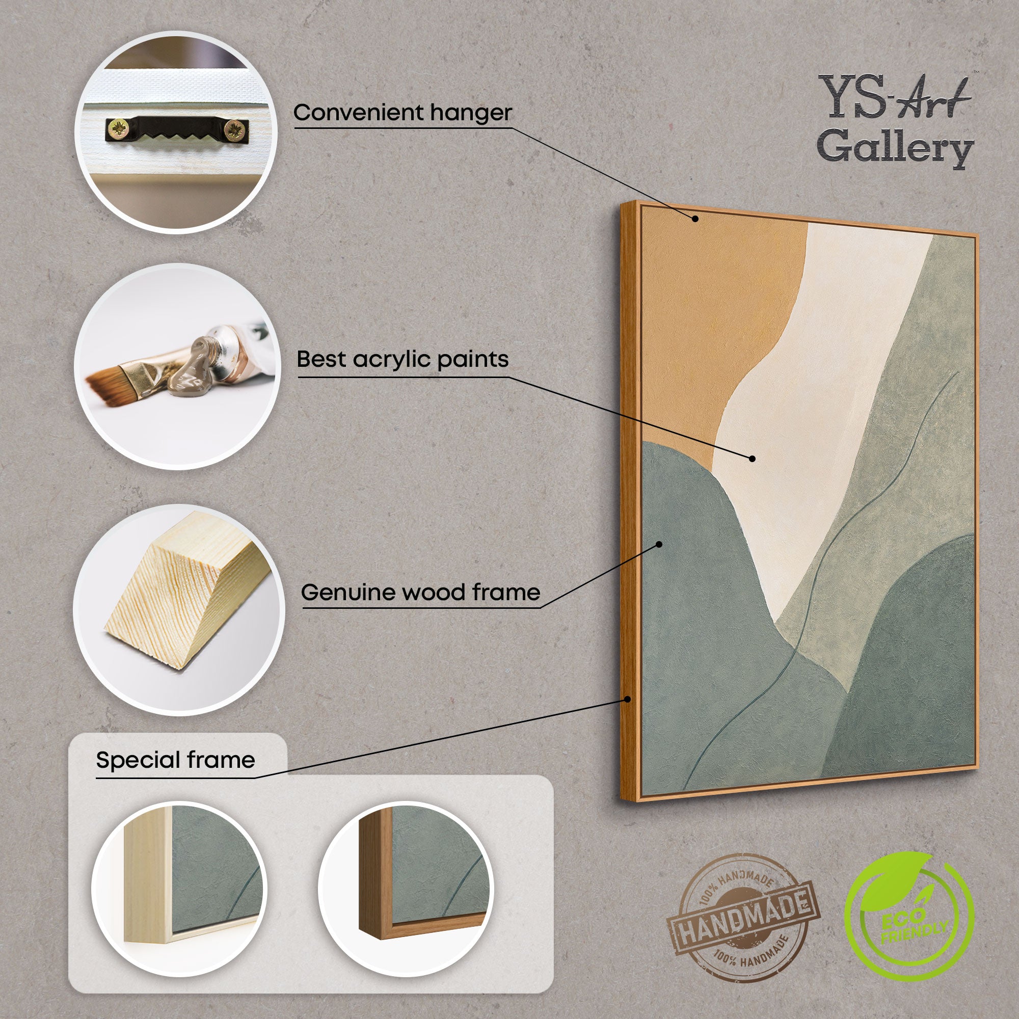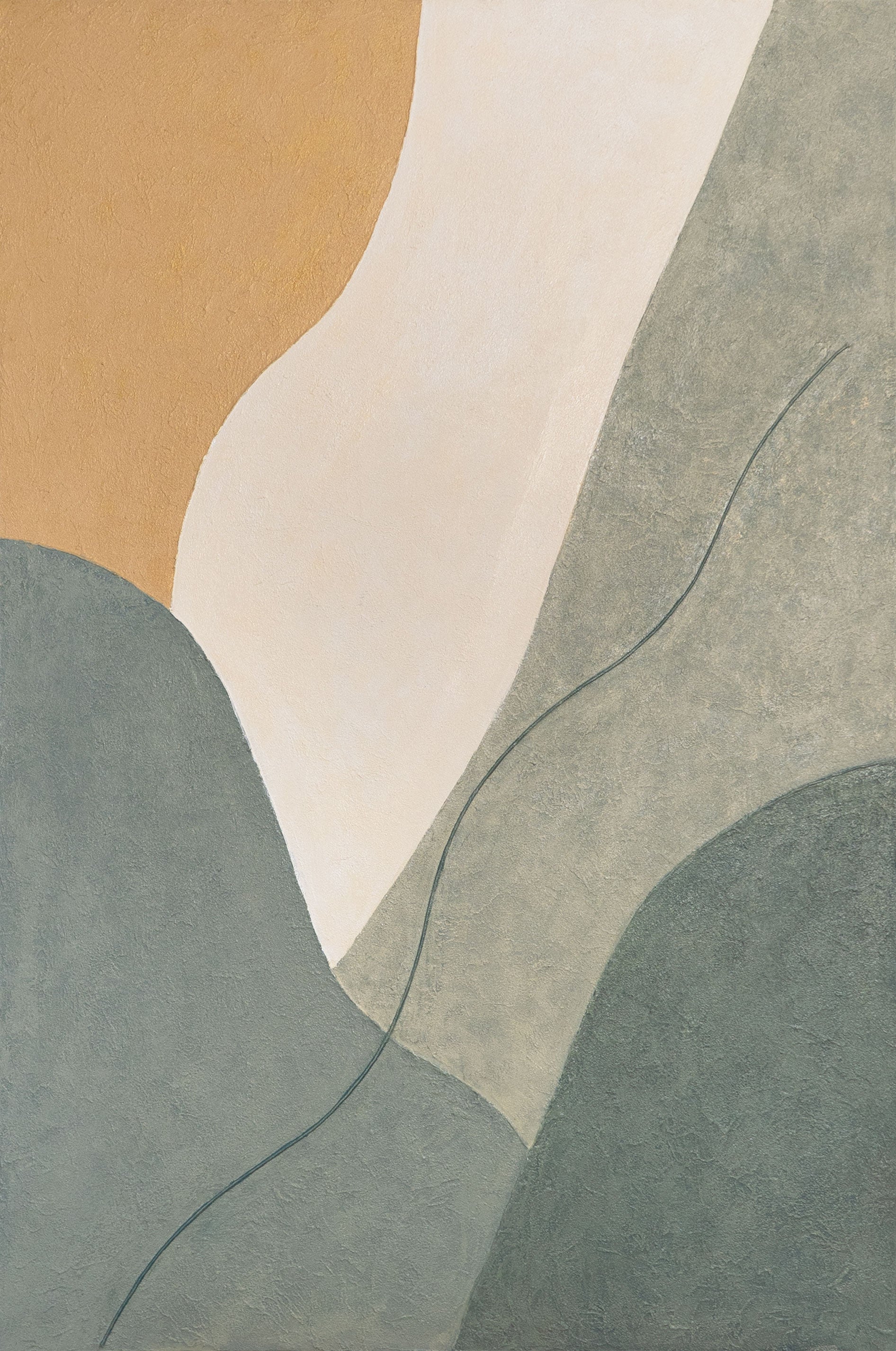 «Línea Eterna» personifica el movimiento fluido y la armonía natural. Delicados tonos de verde, beige y crema se funden en una suave composición de líneas y formas. La fina textura de la superficie aporta profundidad y viveza a la pintura acrílica, mientras que la obra irradia tranquilidad y equilibrio.
