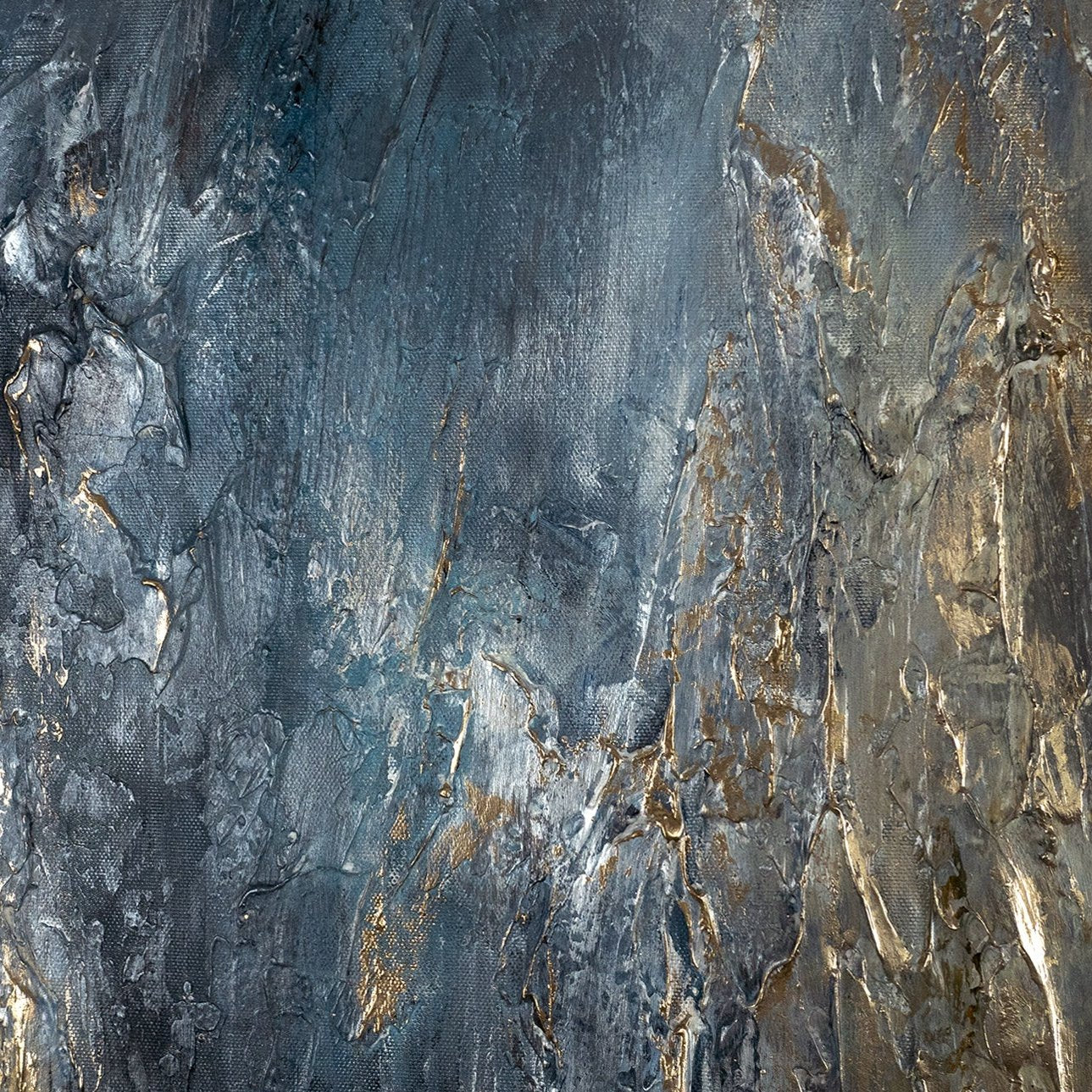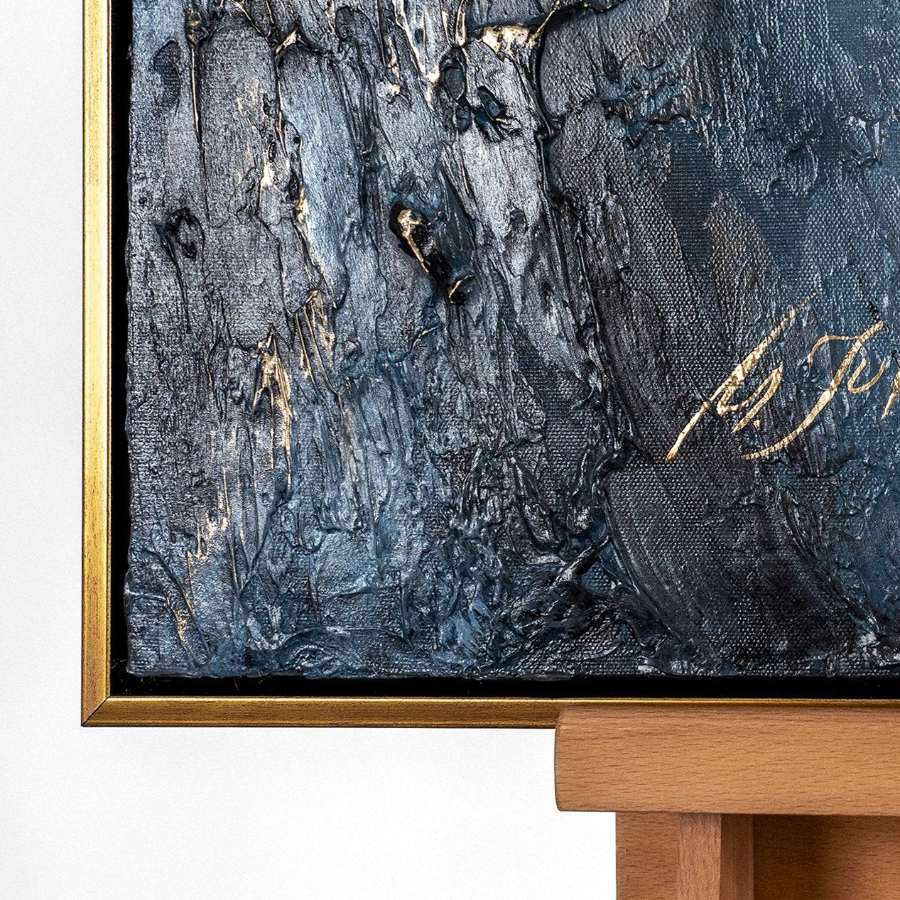 "Océano Dorado" es una cautivadora pintura acrílica que captura la profundidad e imprevisibilidad del mar con una combinación única de tonos azules intensos y vibrantes detalles dorados.