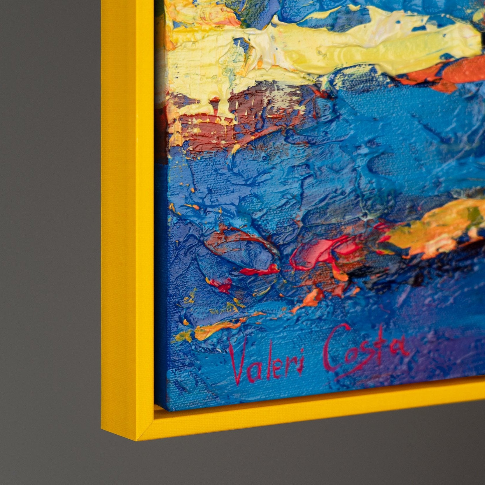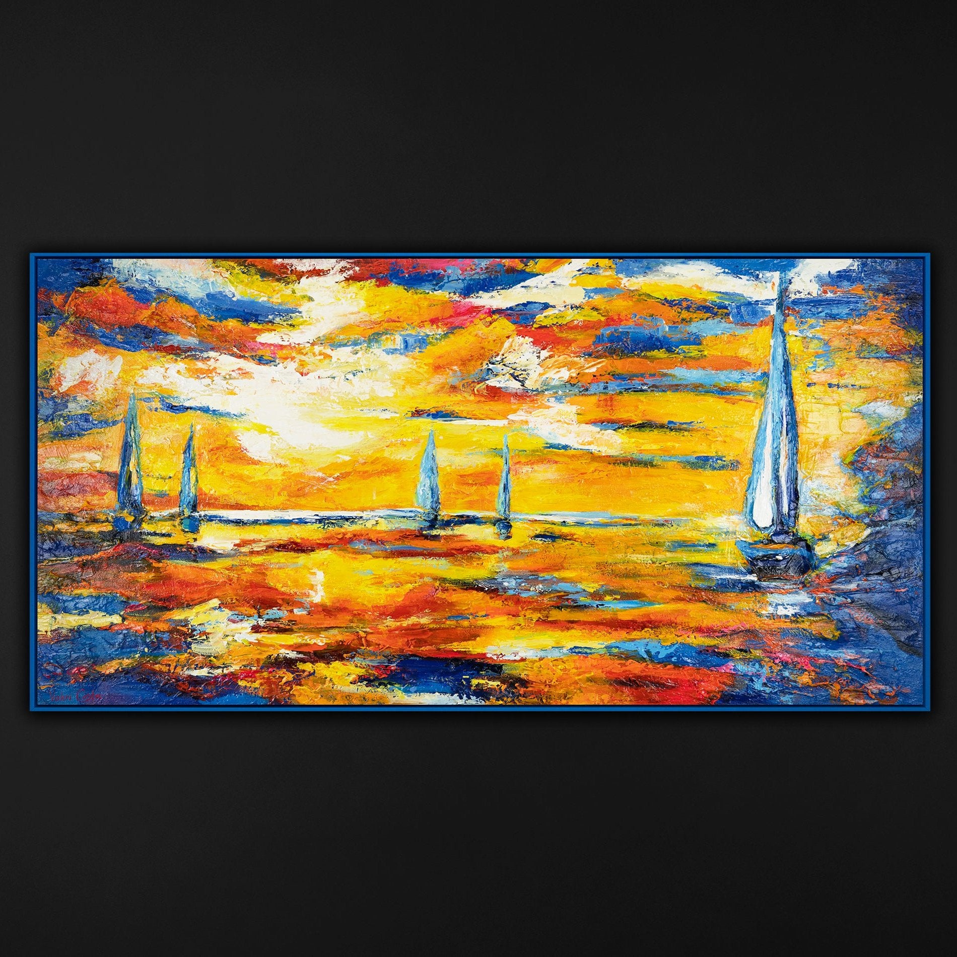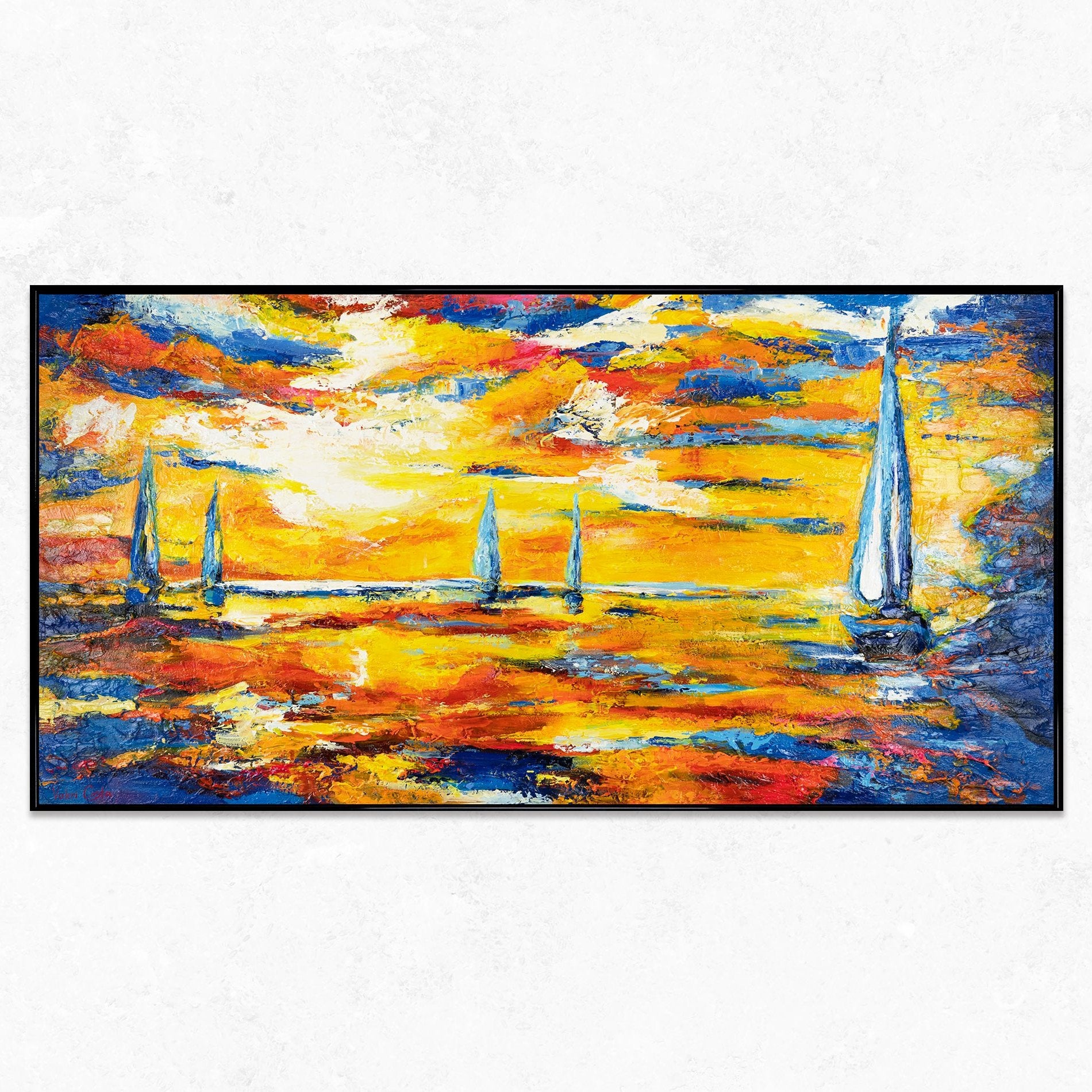 Una obra de arte poderosa y vibrante que captura la magia del atardecer sobre el mar. Los tonos brillantes de amarillo, naranja y azul se combinan en perfecta armonía, creando una atmósfera llena de calidez y energía.
