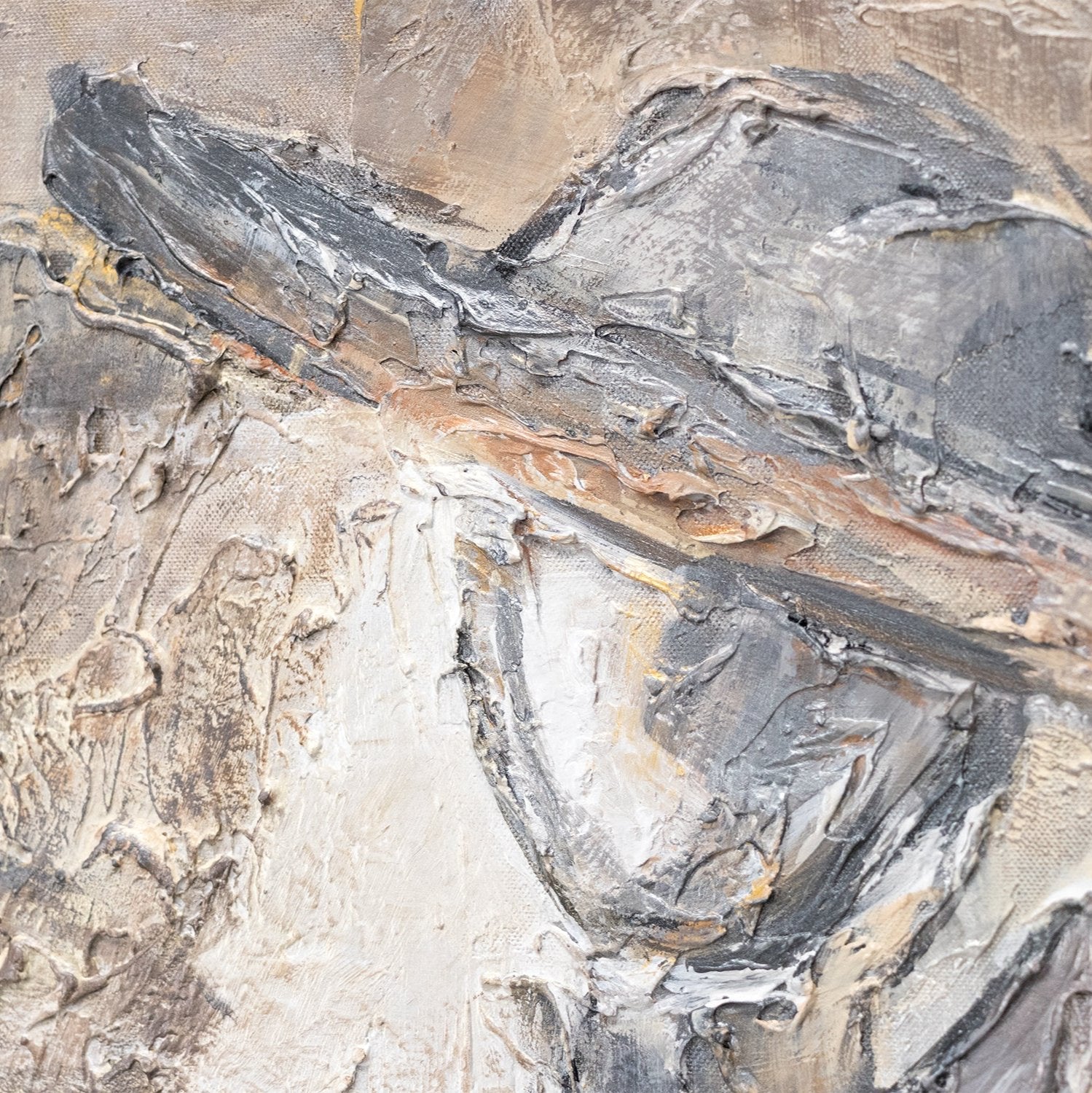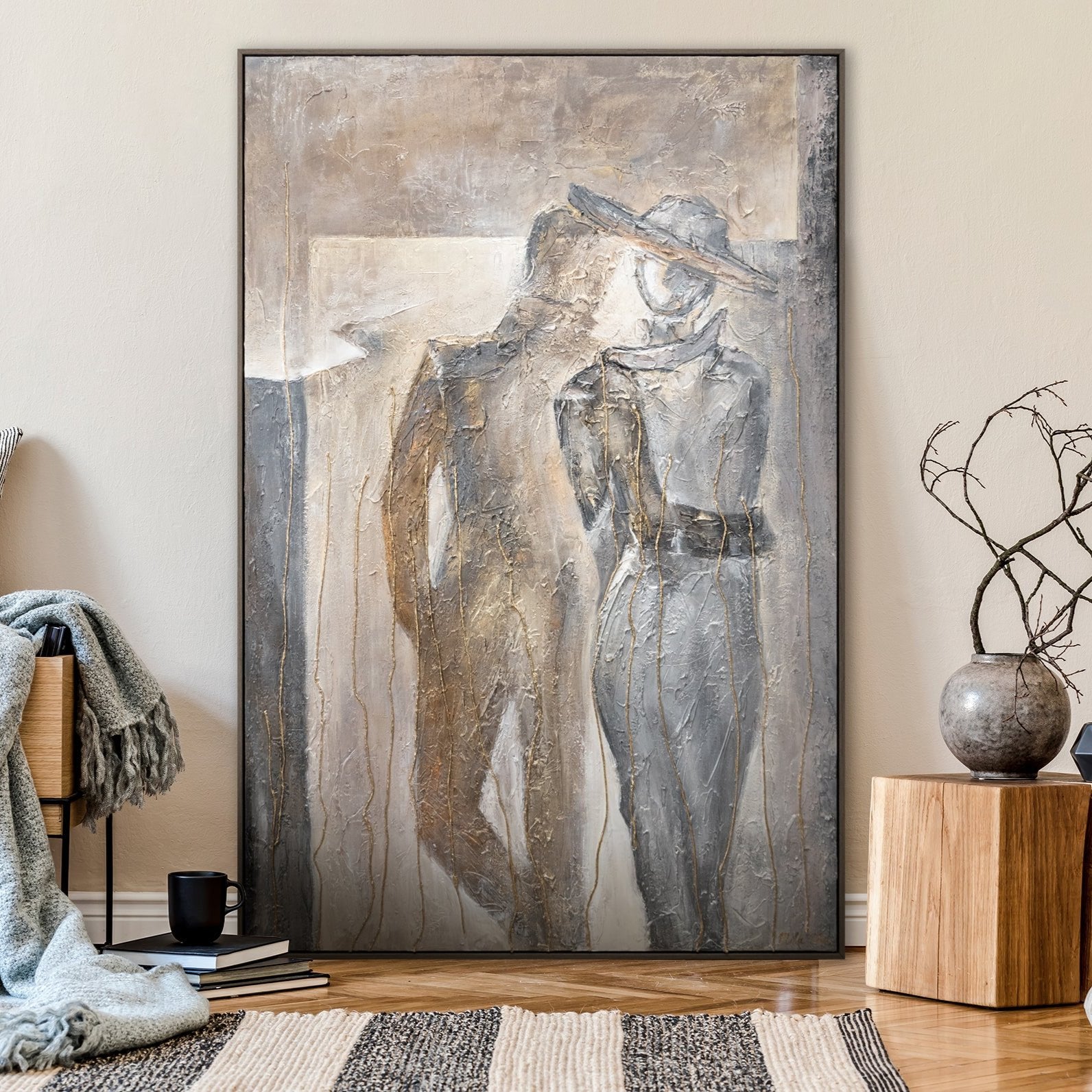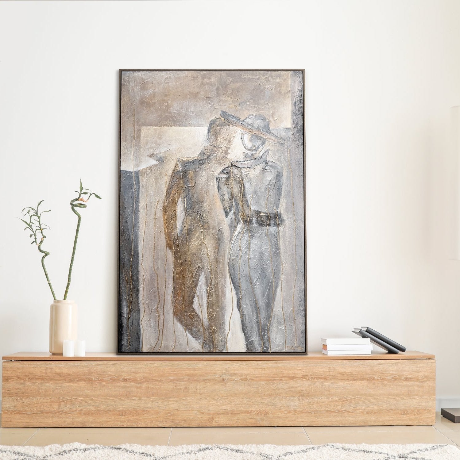 Esta obra moderna pintada a mano presenta dos figuras estilizadas en suaves tonos beige y gris. La composición abstracta, junto con los delicados acentos dorados, aporta a la pieza una estética elegante y atemporal que encaja perfectamente en espacios contemporáneos.