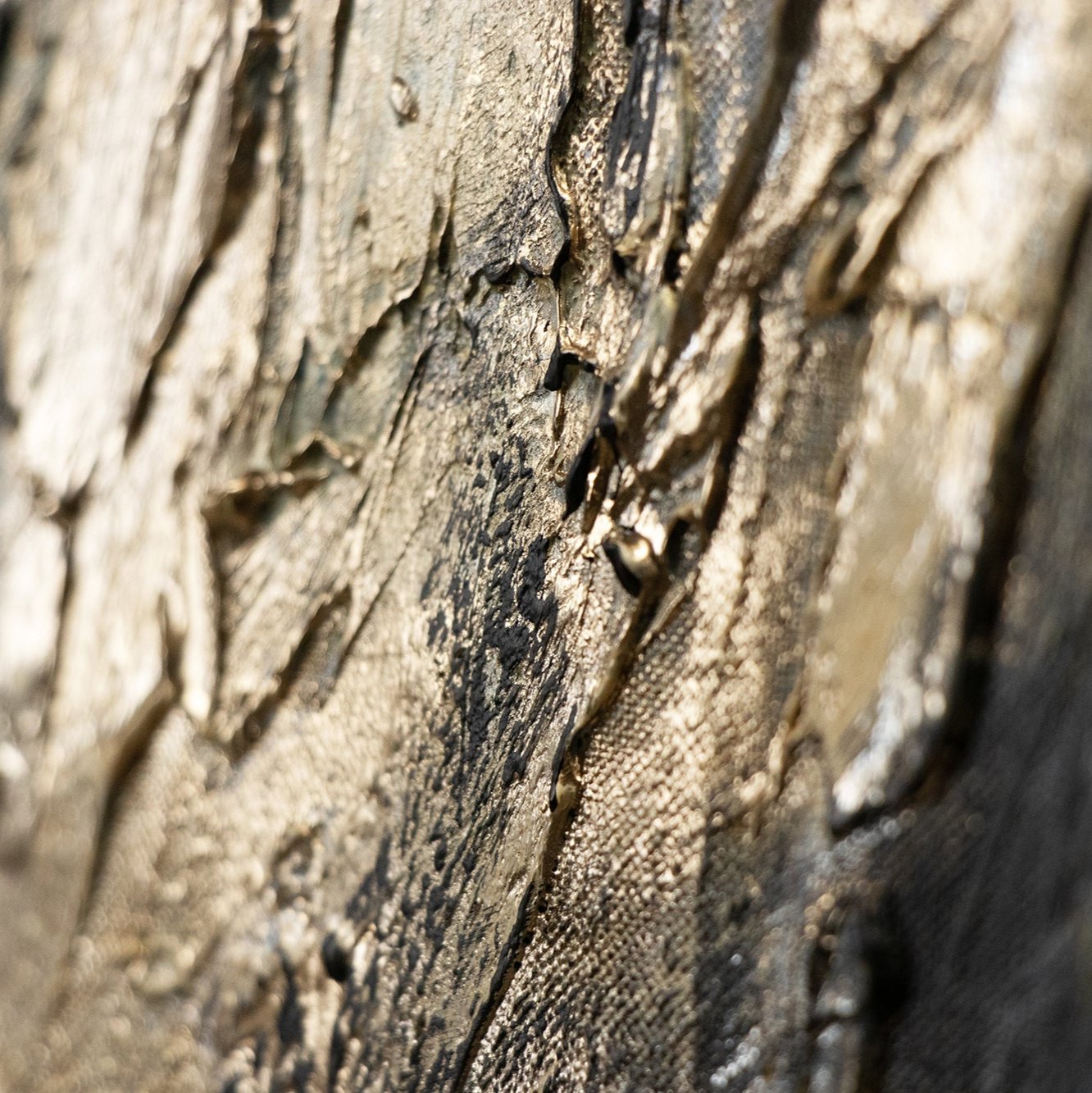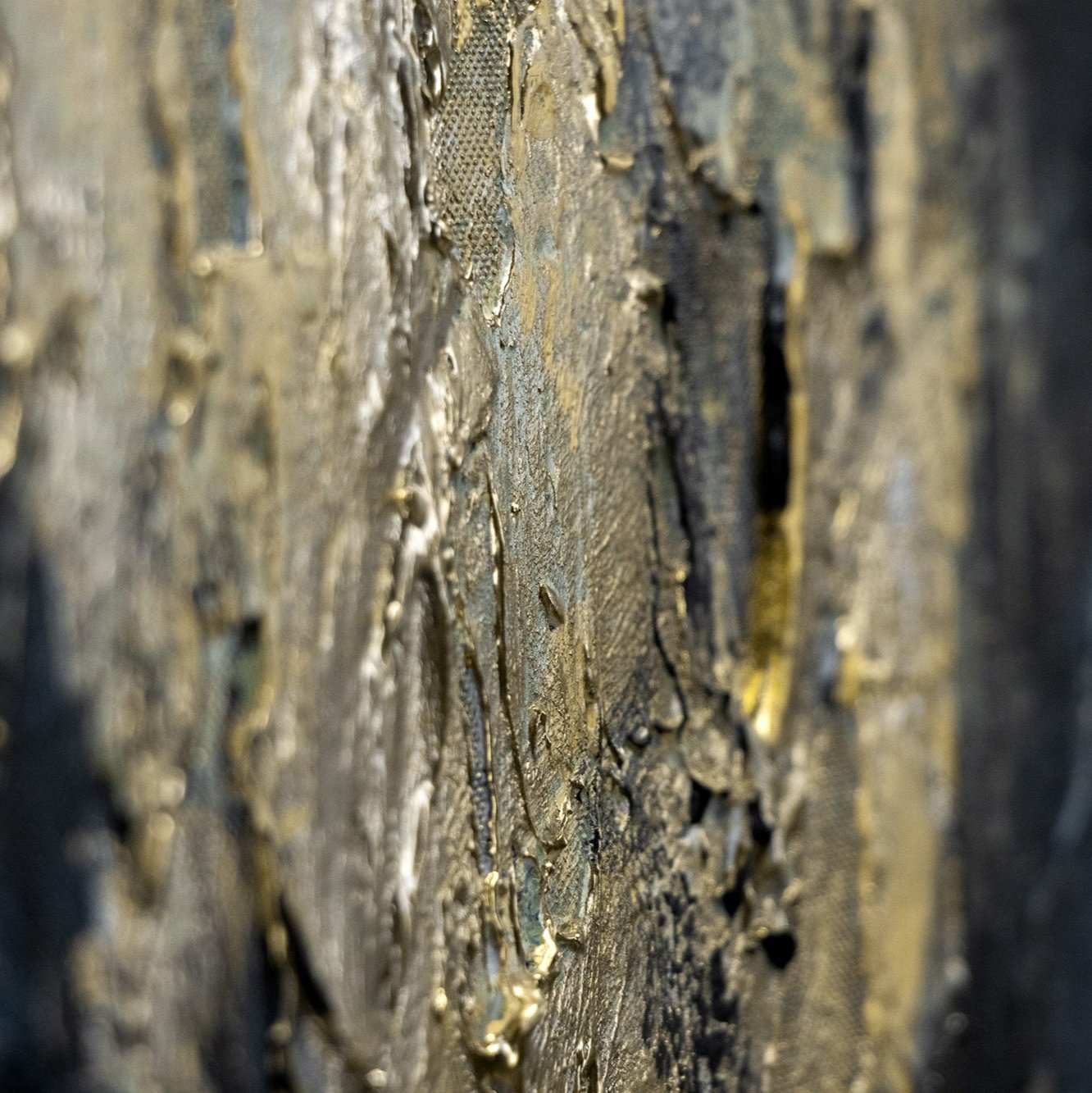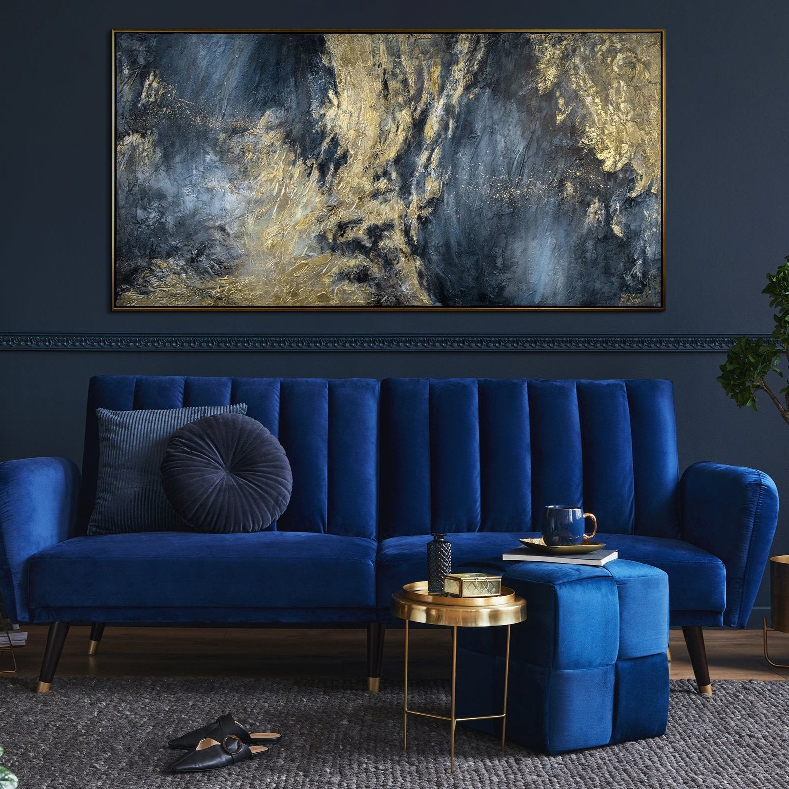 Esta pintura abstracta hecha a mano sobre lienzo destaca por sus poderosos contrastes entre los profundos tonos azul oscuro y negro, realzados por elegantes acentos dorados.