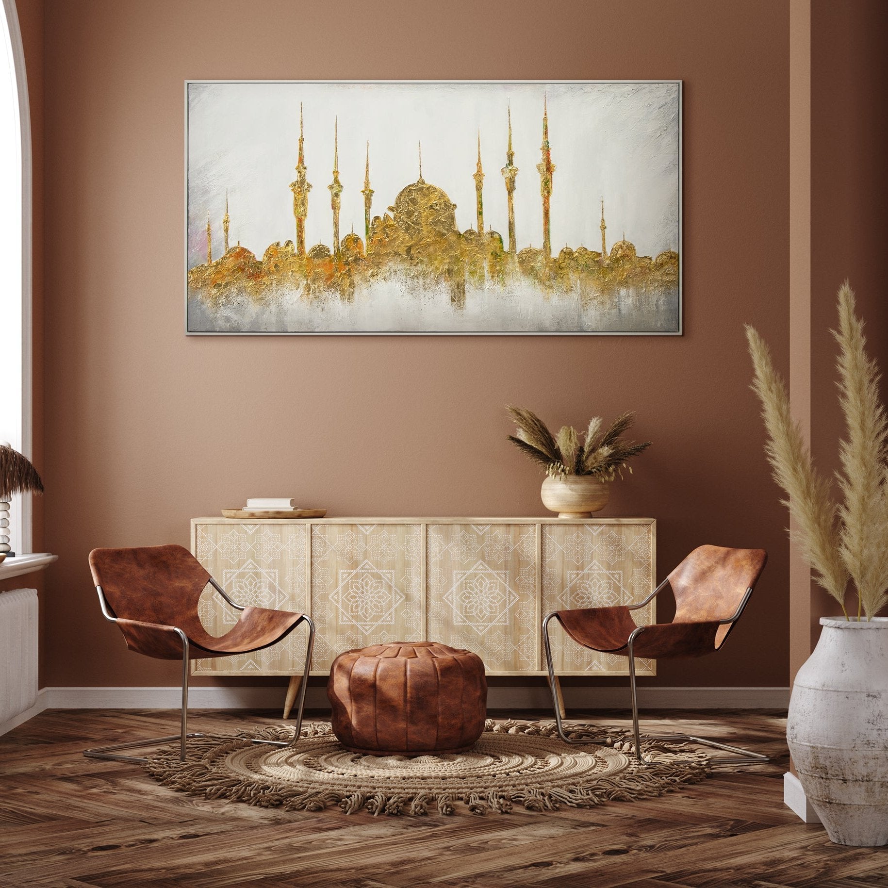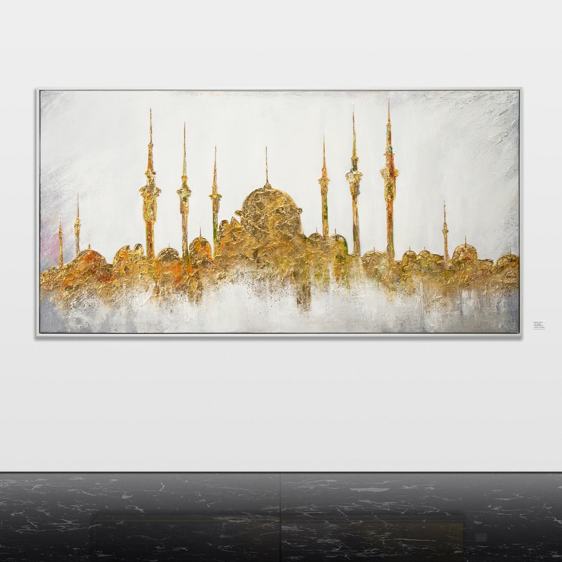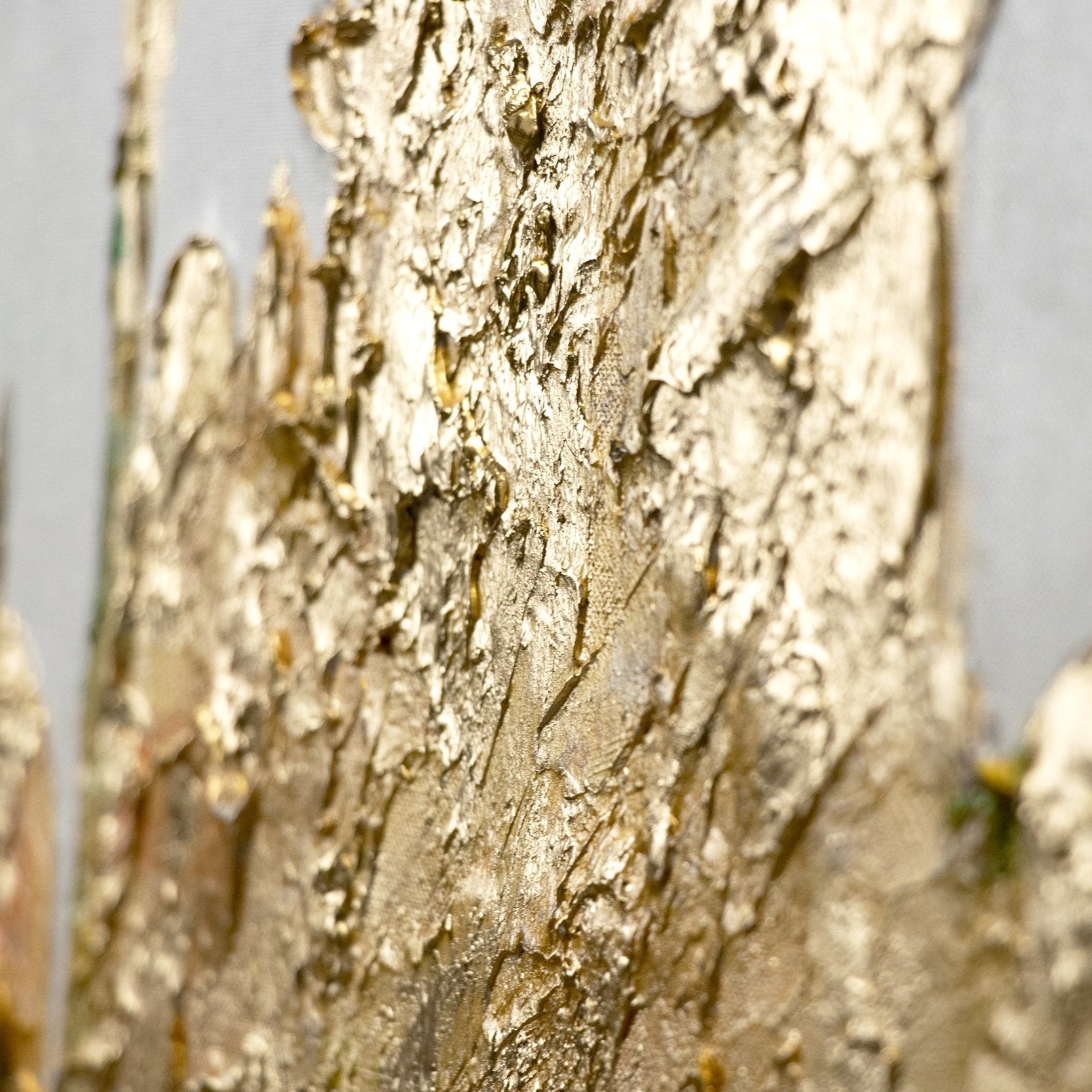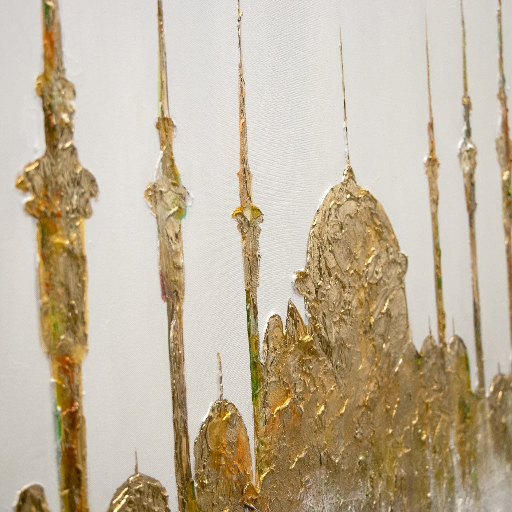 Esta impresionante obra de arte abstracto sobre lienzo presenta una combinación armoniosa de tonos dorados y neutros, formando una silueta majestuosa y equilibrada. La textura aplicada con maestría y los delicados acentos dorados convierten esta pieza en un elemento elegante y sofisticado para interiores modernos o espacios profesionales.