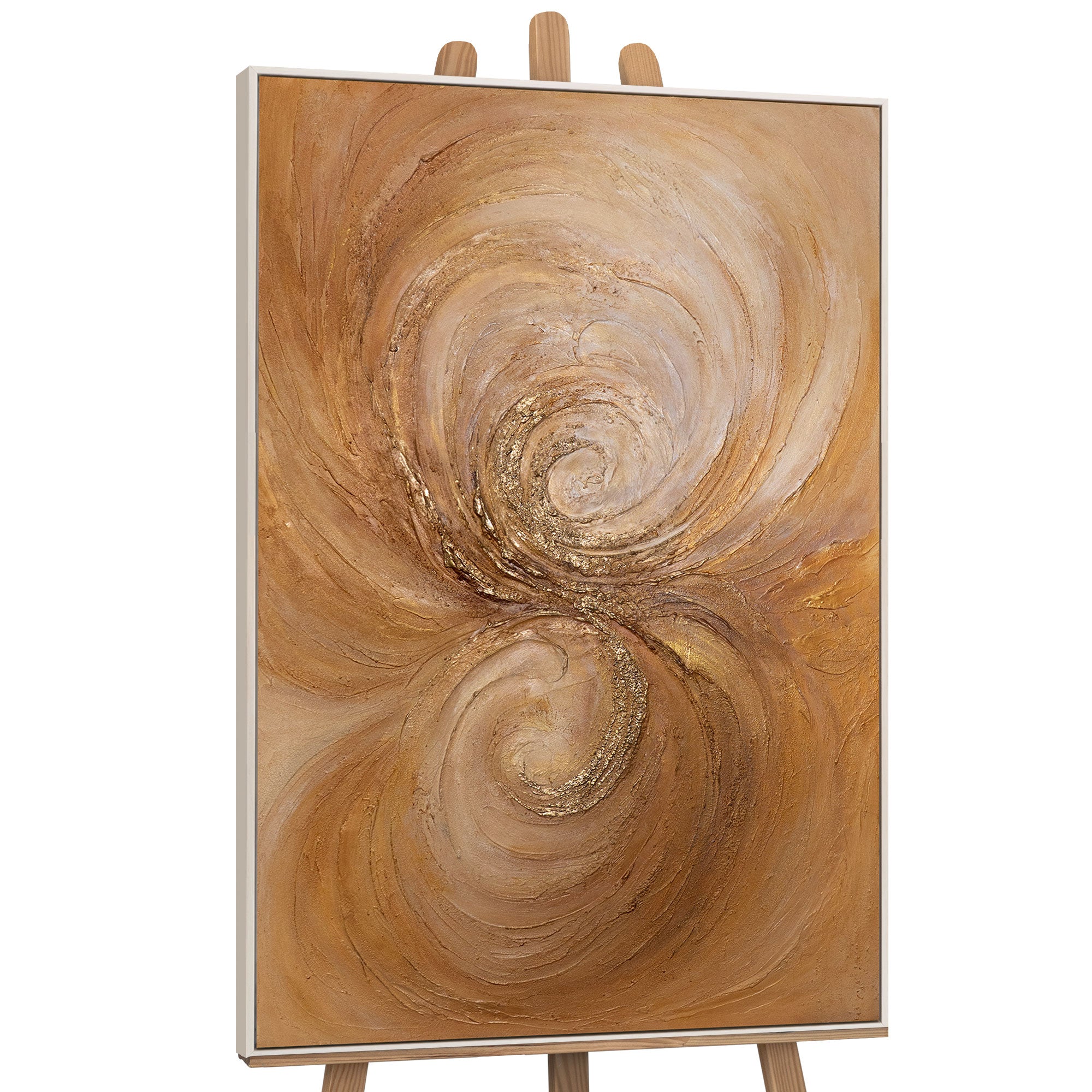 La pintura acrílica “Límites de la Ilusión” juega con estructuras claras y transiciones suaves. Las formas rectangulares ascienden como escalones, mientras que los suaves tonos beige y marrón se funden en amplias áreas. La composición transmite la sensación de un paisaje urbano que se pierde en la distancia, una mezcla de arquitectura e ilusión.