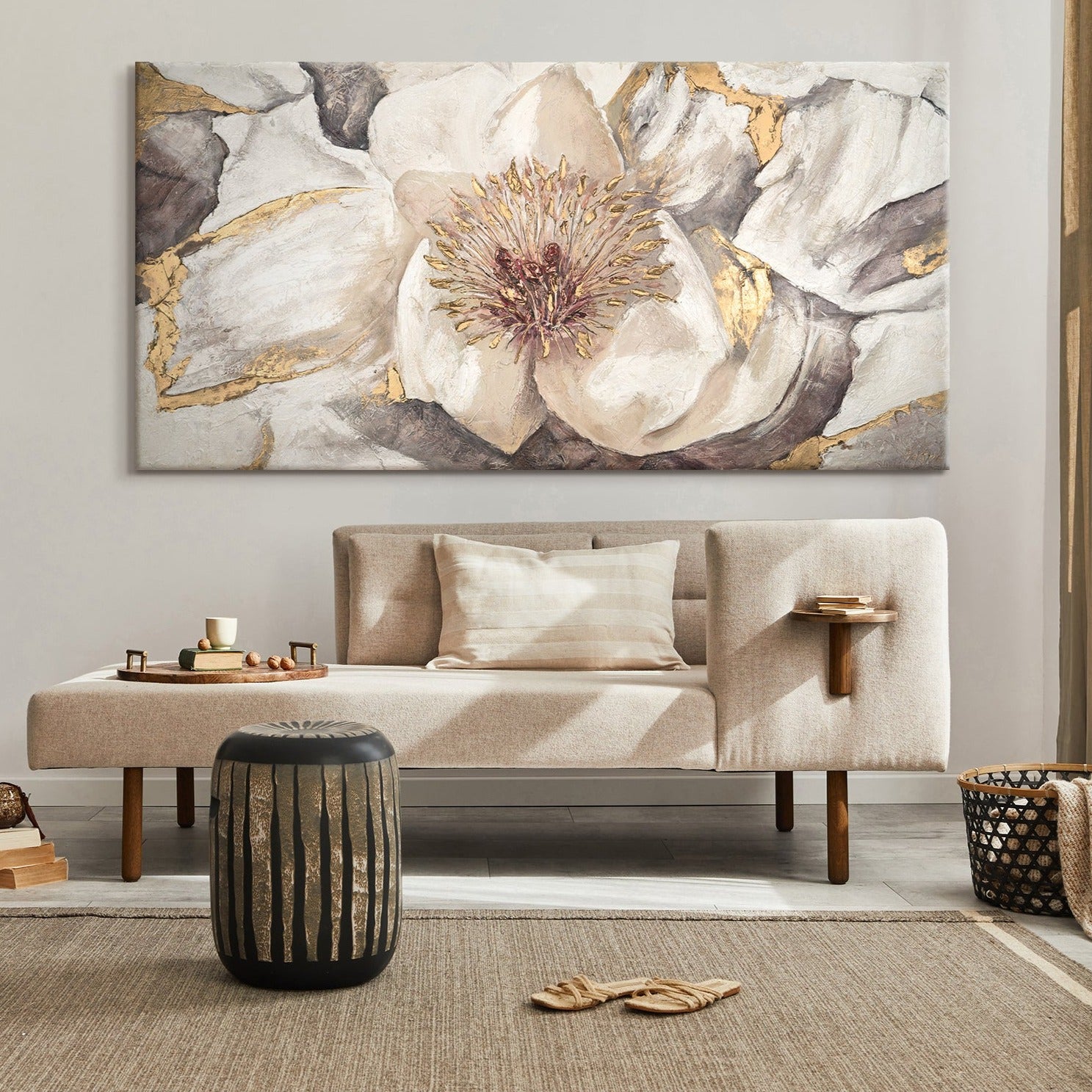 Aporte un toque distinguido a su hogar con este cuadro de flores pintado a mano sobre lienzo. Los delicados detalles y los acentos dorados crean una atmósfera elegante y relajante. Cada trazo de esta obra es 100% hecho a mano, lo que la convierte en una pieza única e irrepetible. Le ofrecemos la entrega gratuita directamente en su casa.