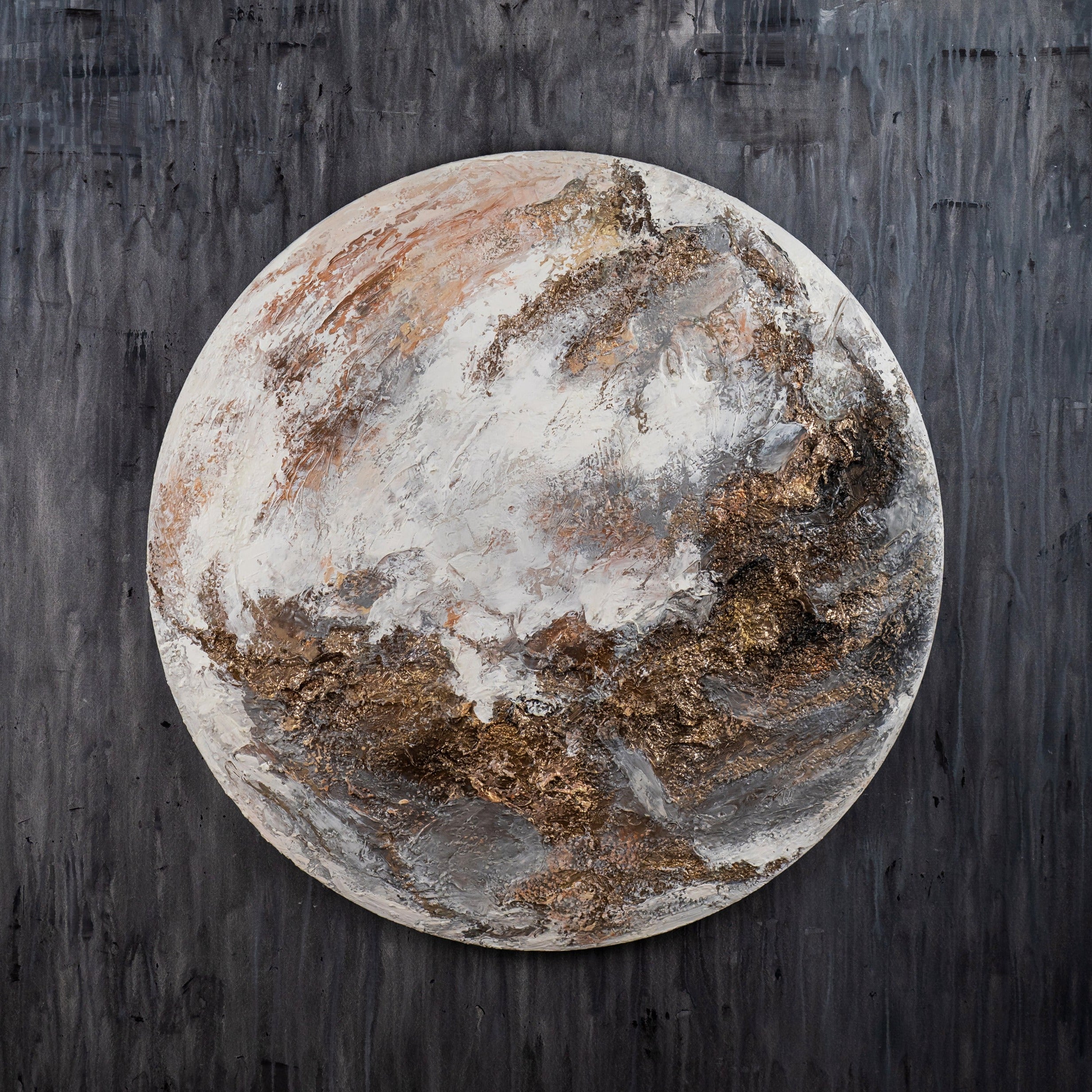 Decora tu hogar u oficina con la elegante "Venus", una pintura acrílica redonda en forma de planeta que brilla en la oscuridad gracias a pigmentos luminosos especiales. Esta obra de arte moderna combina texturas blancas, marrones y doradas, creando una atmósfera cálida y dinámica. El cuadro está pintado 100% a mano y enmarcado con un diseño elegante.