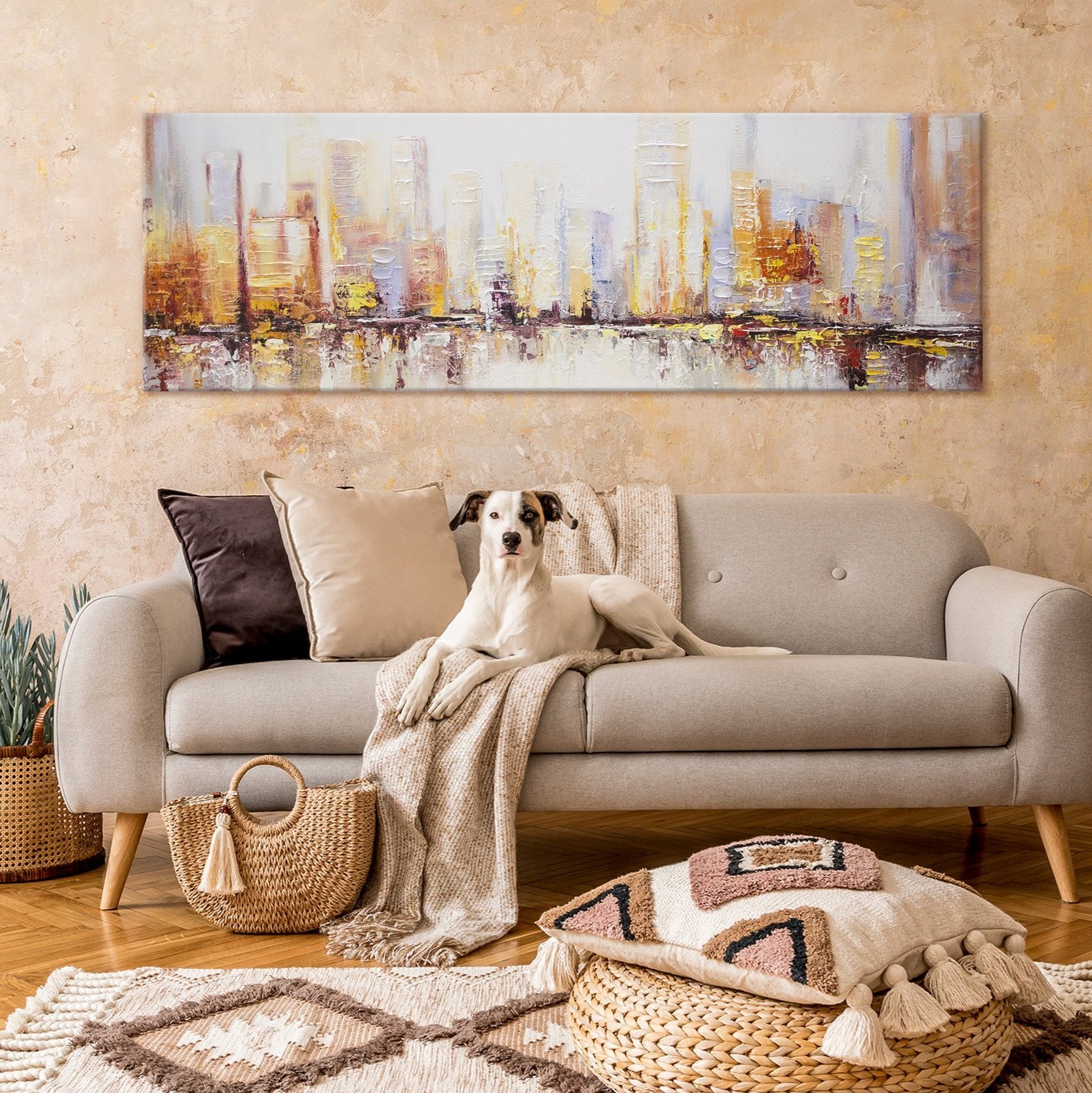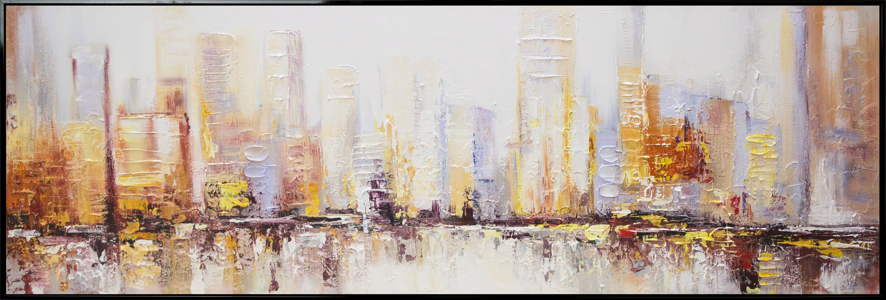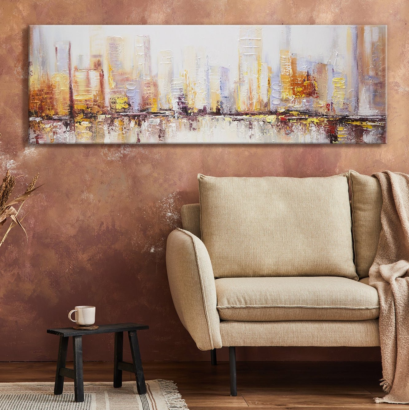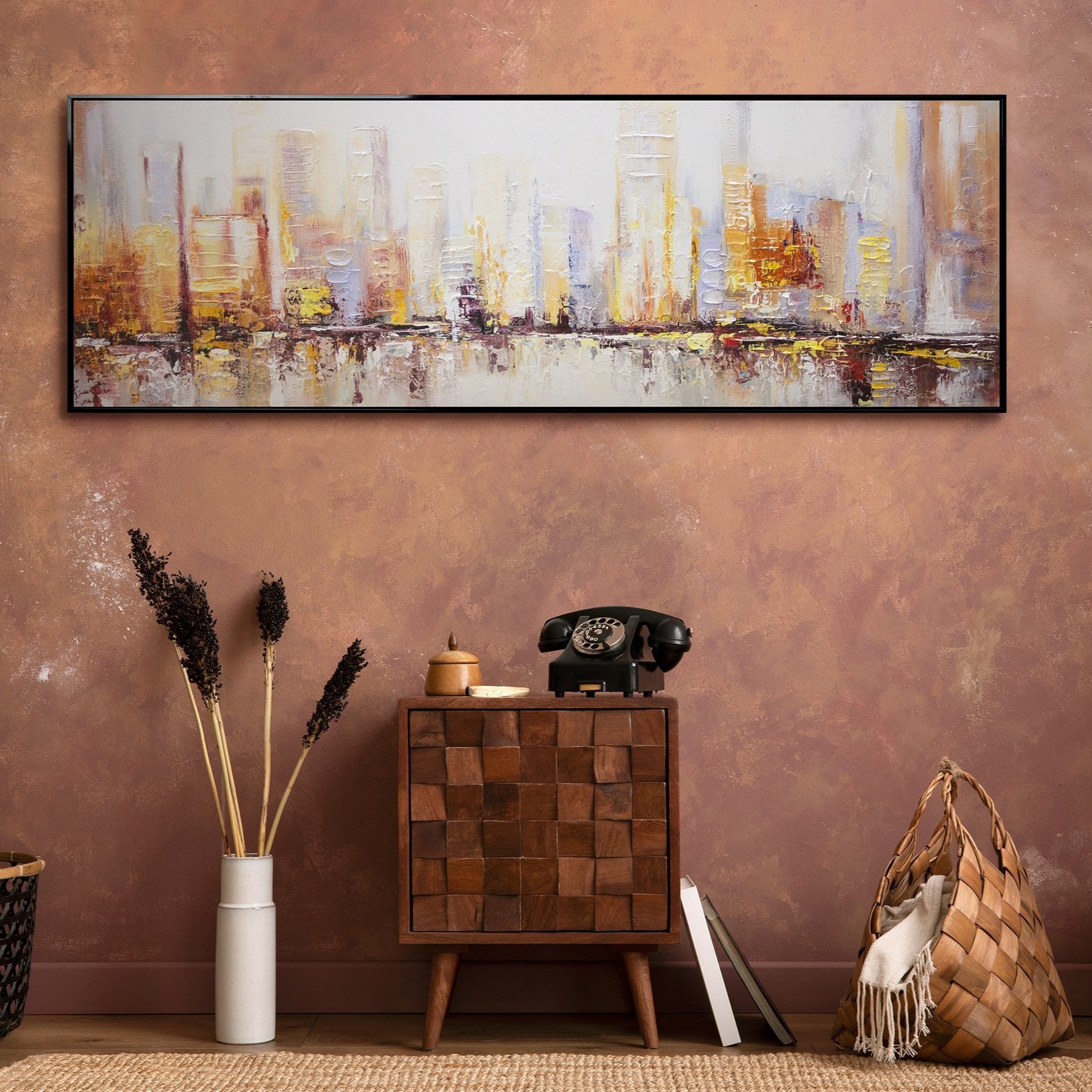 Esta pintura acrílica hecha a mano sobre lienzo representa una ciudad moderna en tonos cálidos de amarillo y naranja, aportando luz y vitalidad a cualquier espacio. Su textura vibrante y su paleta cromática equilibrada transmiten energía, dinamismo y elegancia contemporánea.