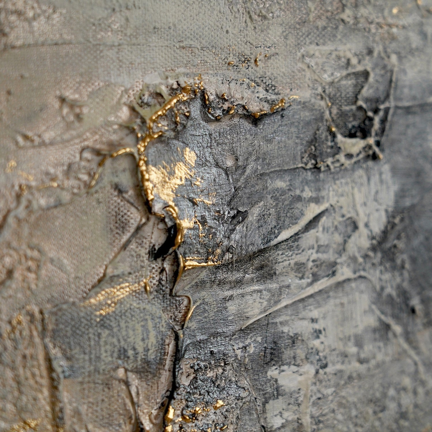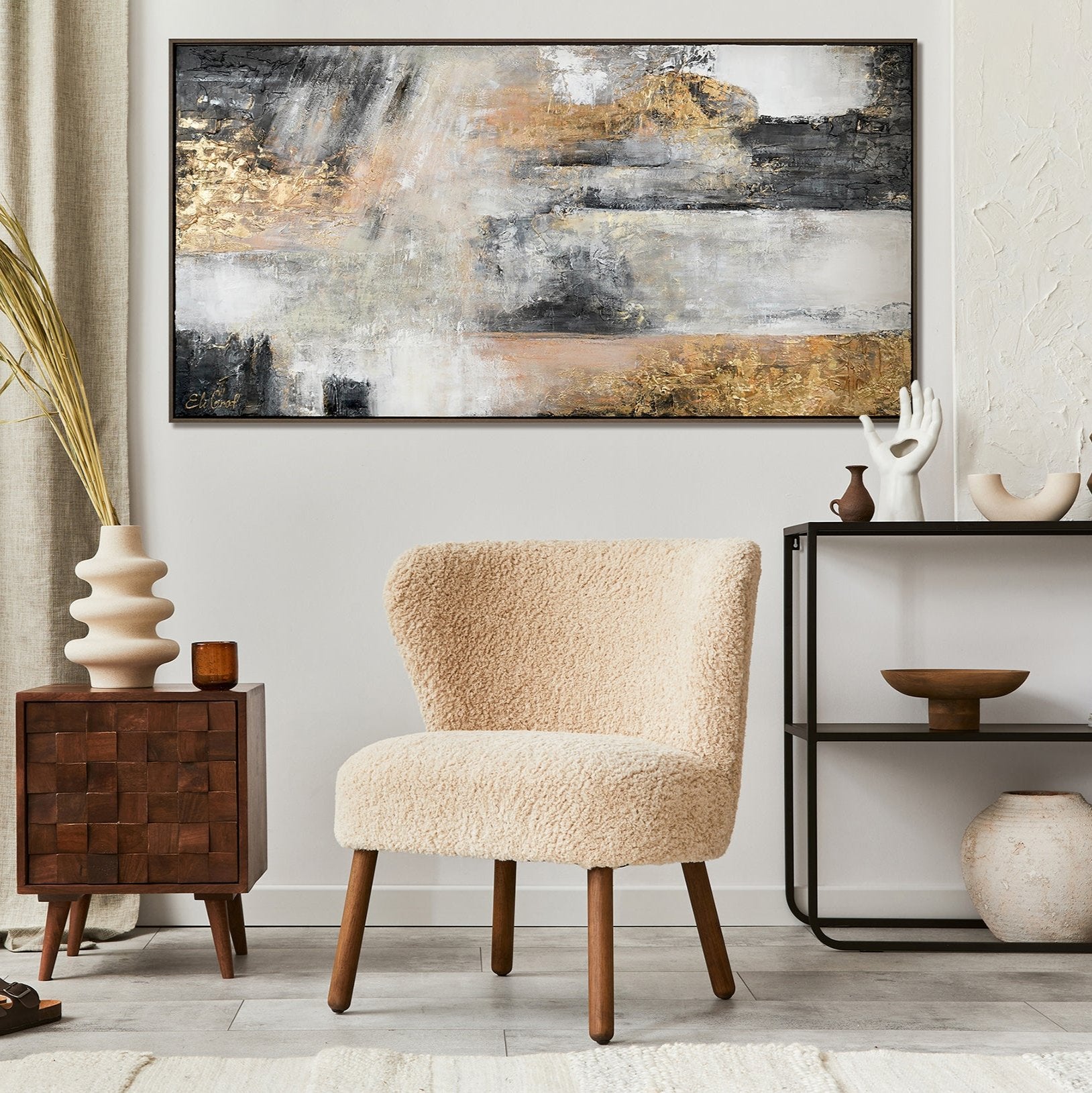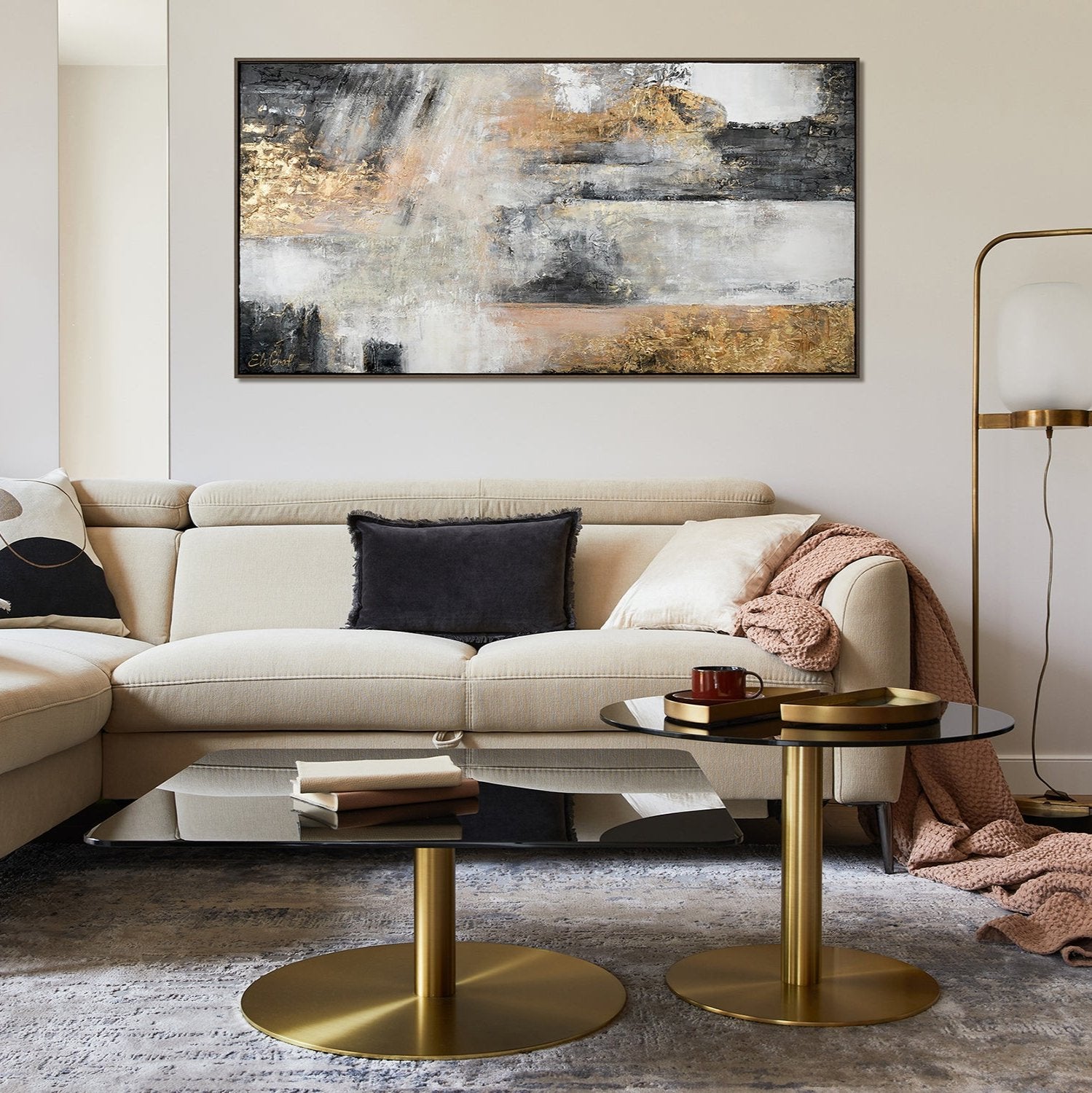 Esta pintura abstracta hecha a mano sobre lienzo destaca por su mezcla elegante de tonos suaves y acentos dorados llamativos.