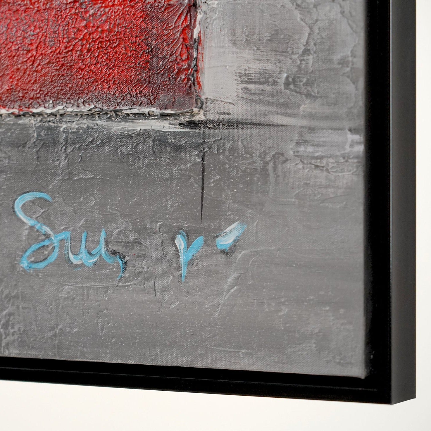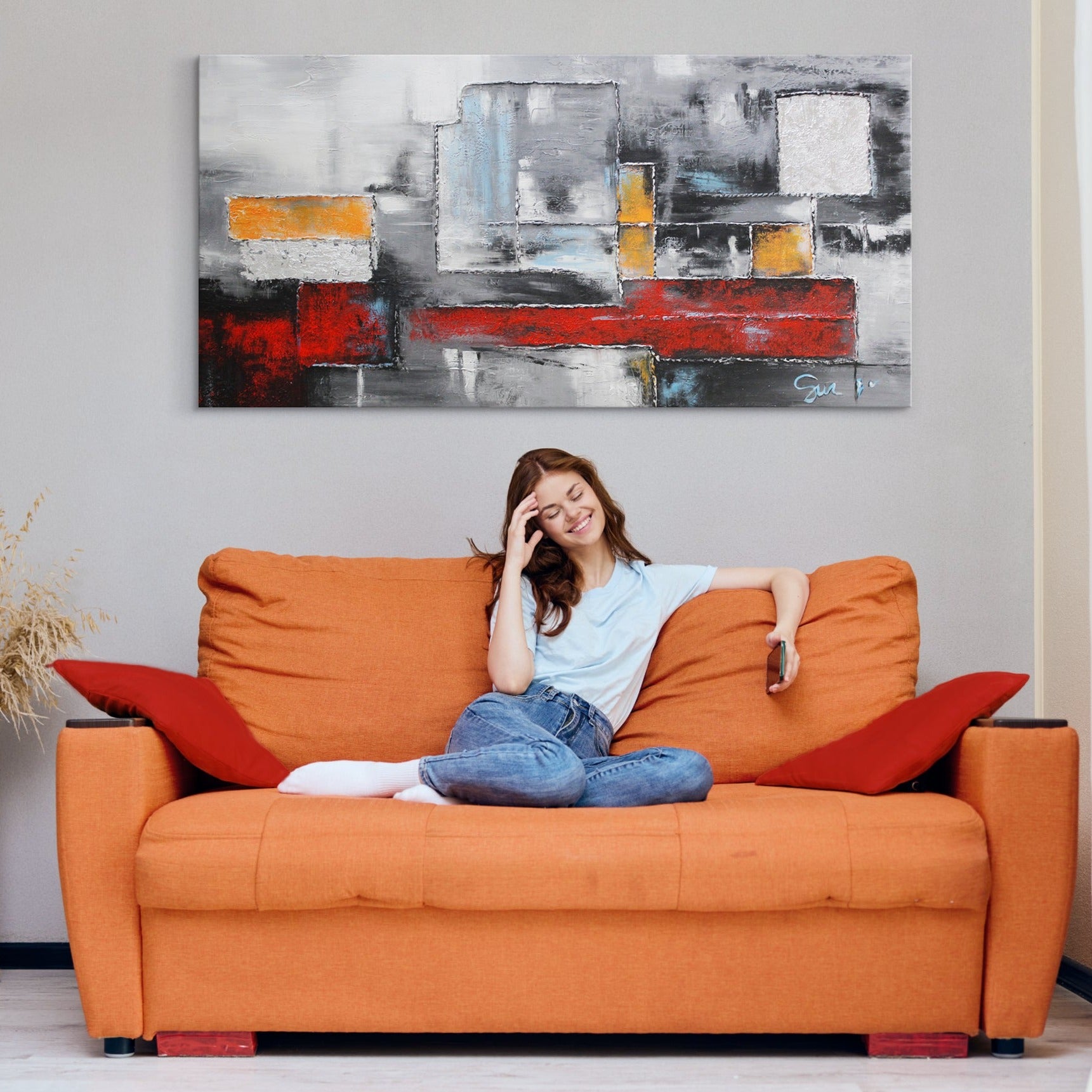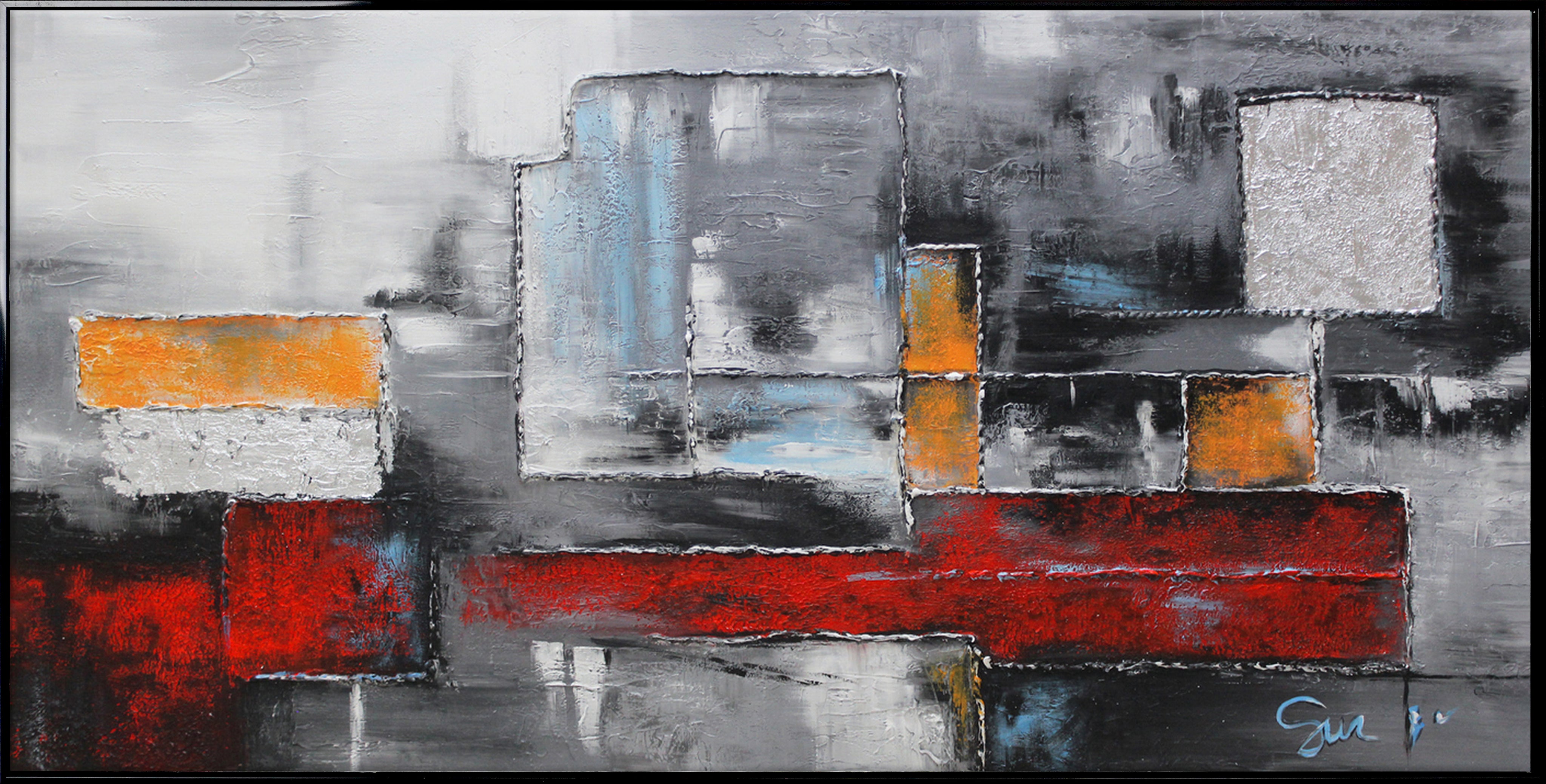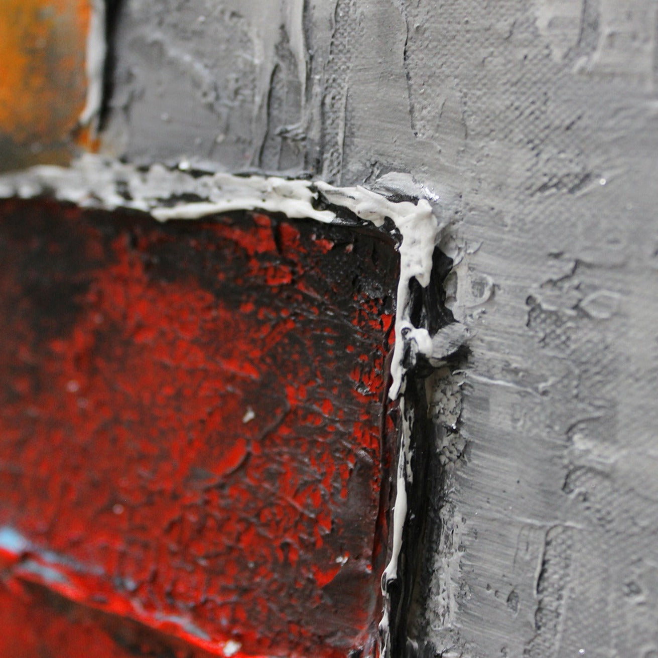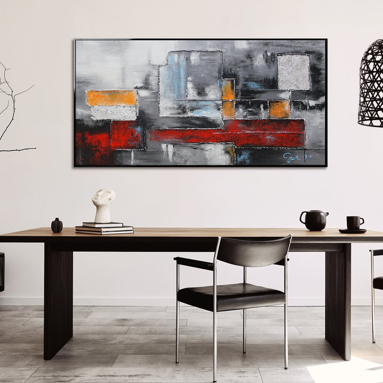 Enriquece tu hogar u oficina con esta obra de arte abstracta moderna, que combina tonos intensos de rojo, naranja y gris para crear una composición geométrica y dinámica. El cuadro destaca por sus formas claras, contrastes potentes y pinceladas expresivas, aportando energía y modernidad a cualquier espacio. Está 100% pintado a mano y realzado con un marco negro elegante, que refuerza su estilo contemporáneo.
