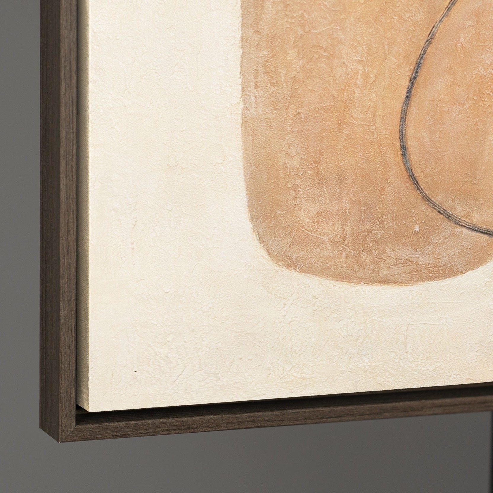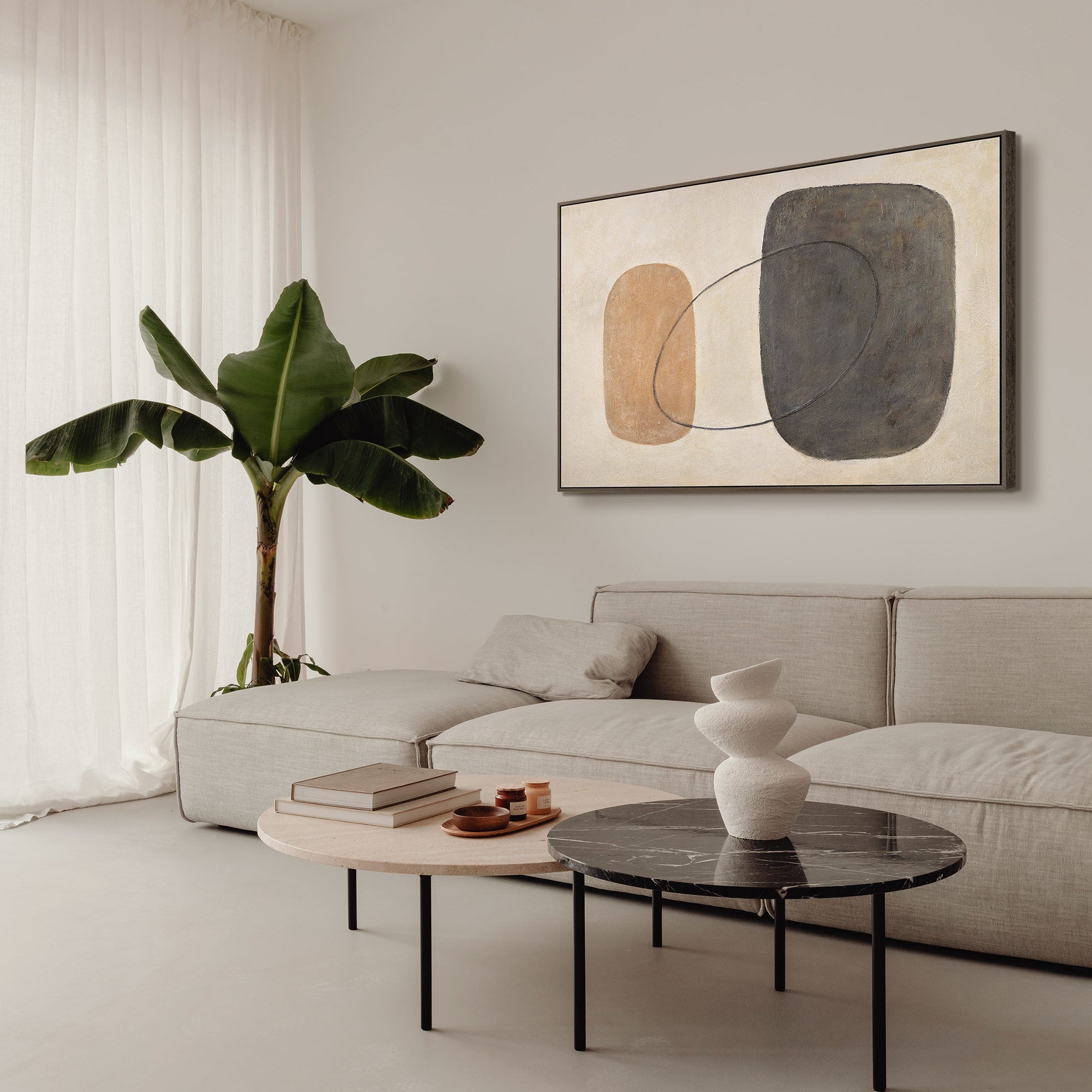 «Equilibrio de Contrastes» exhibe la sutil interacción de luces y sombras. Dos formas orgánicas —una en un cálido beige y la otra en un profundo antracita— conviven en serena armonía, unidas por una fina línea. La textura de la superficie aporta profundidad, mientras que la suave paleta de colores irradia tranquilidad y equilibrio.