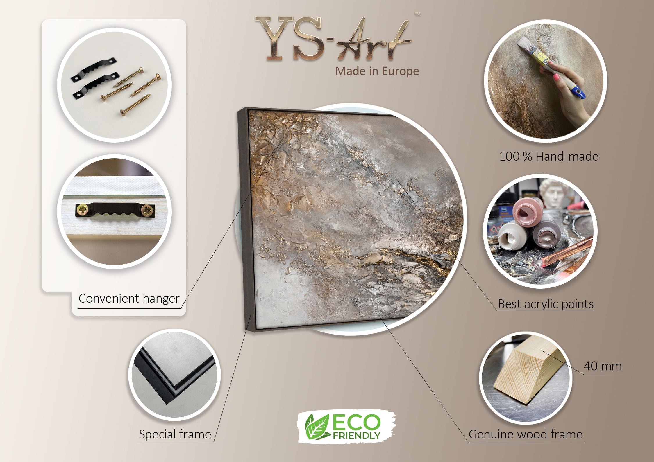 • Hecha a mano: Cada pintura es cuidadosamente realizada a mano utilizando materiales de alta calidad y un enfoque único para crear texturas.