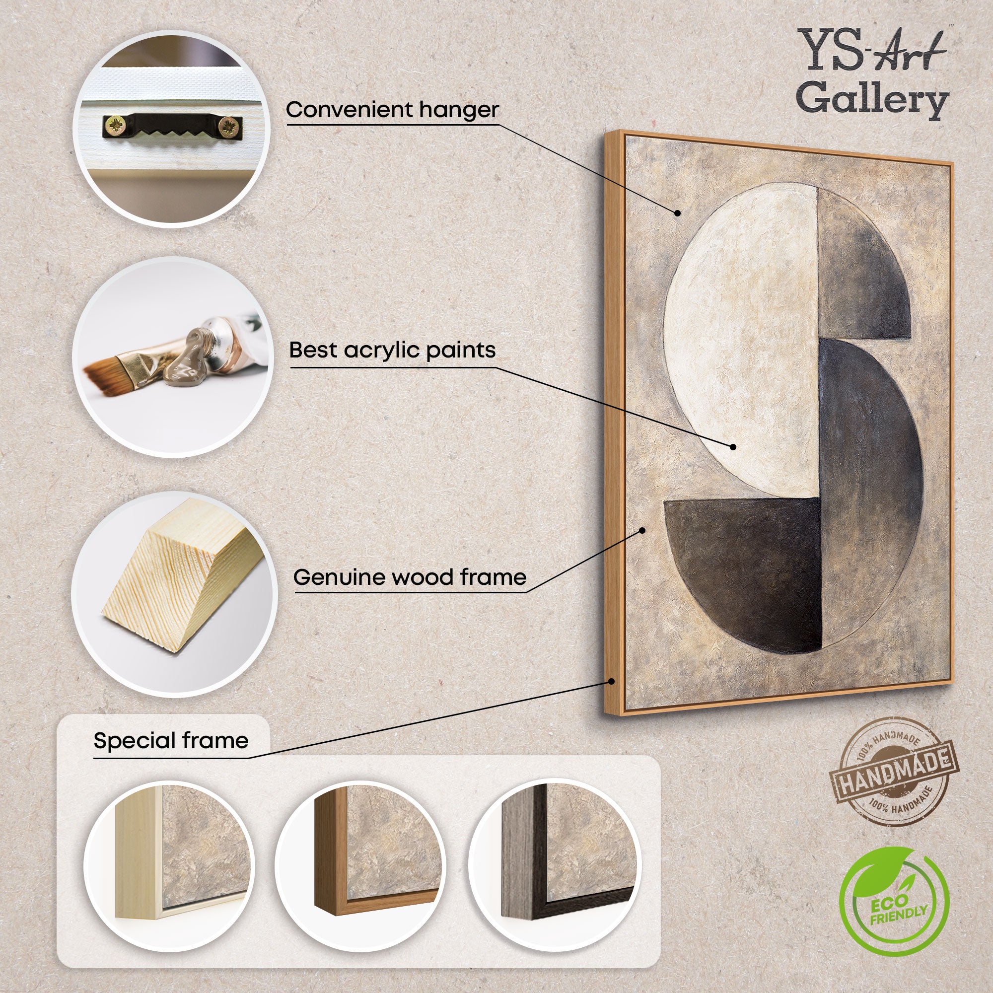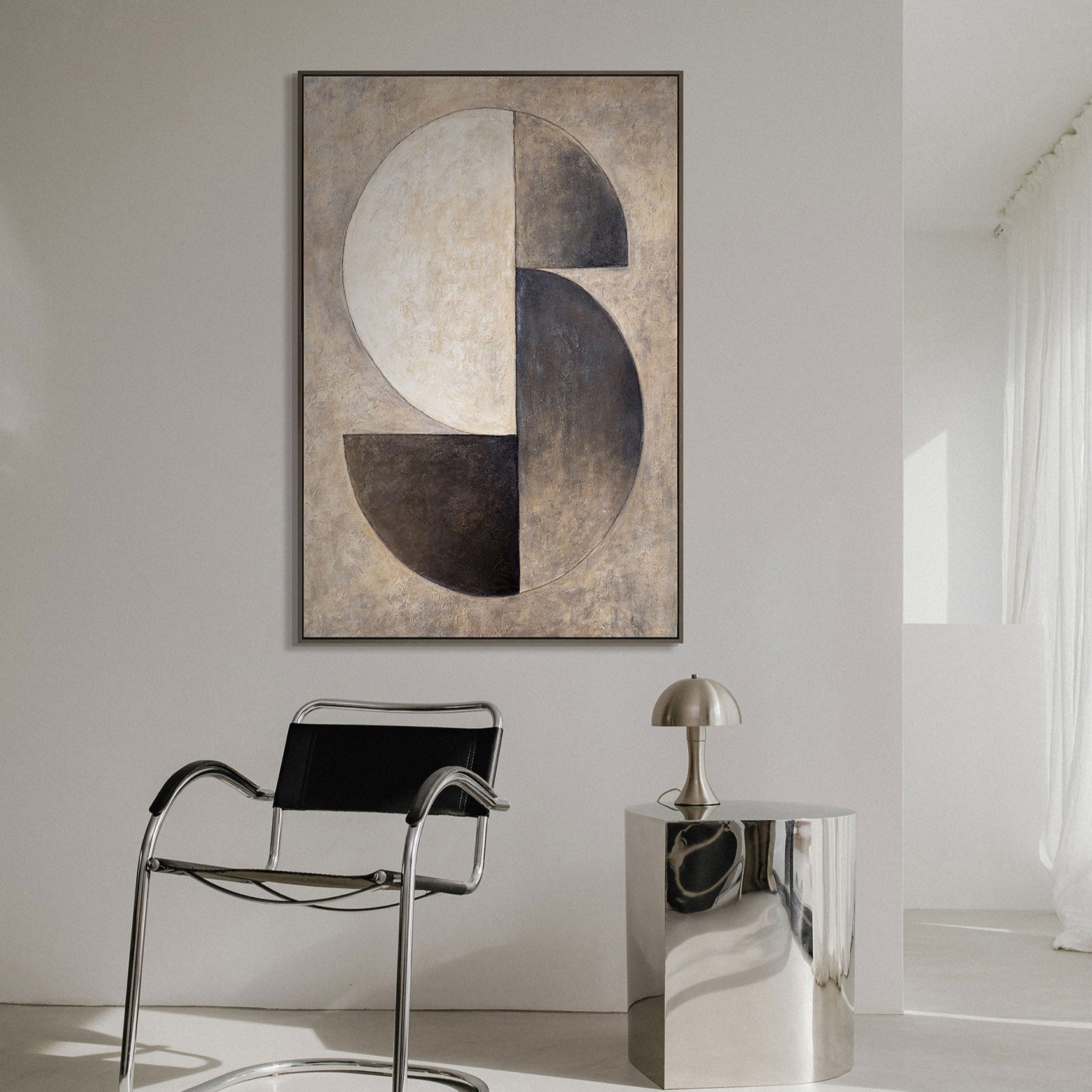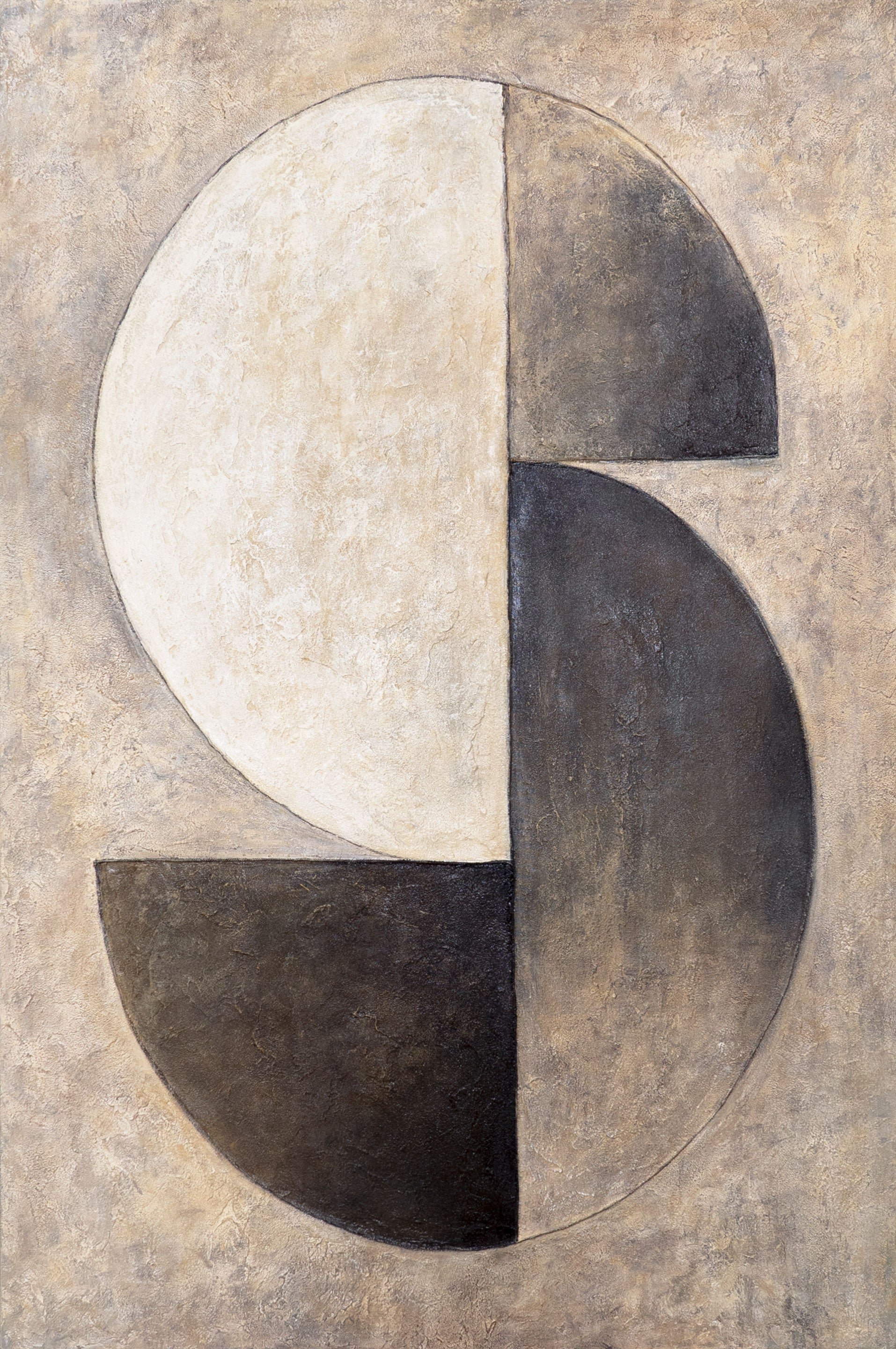 Aporta claridad moderna y elegancia geométrica a tu hogar con esta pintura abstracta hecha a mano. Los semicírculos en negro, blanco y beige crean un fascinante juego de simetría y contraste, una obra llena de equilibrio y expresividad.
