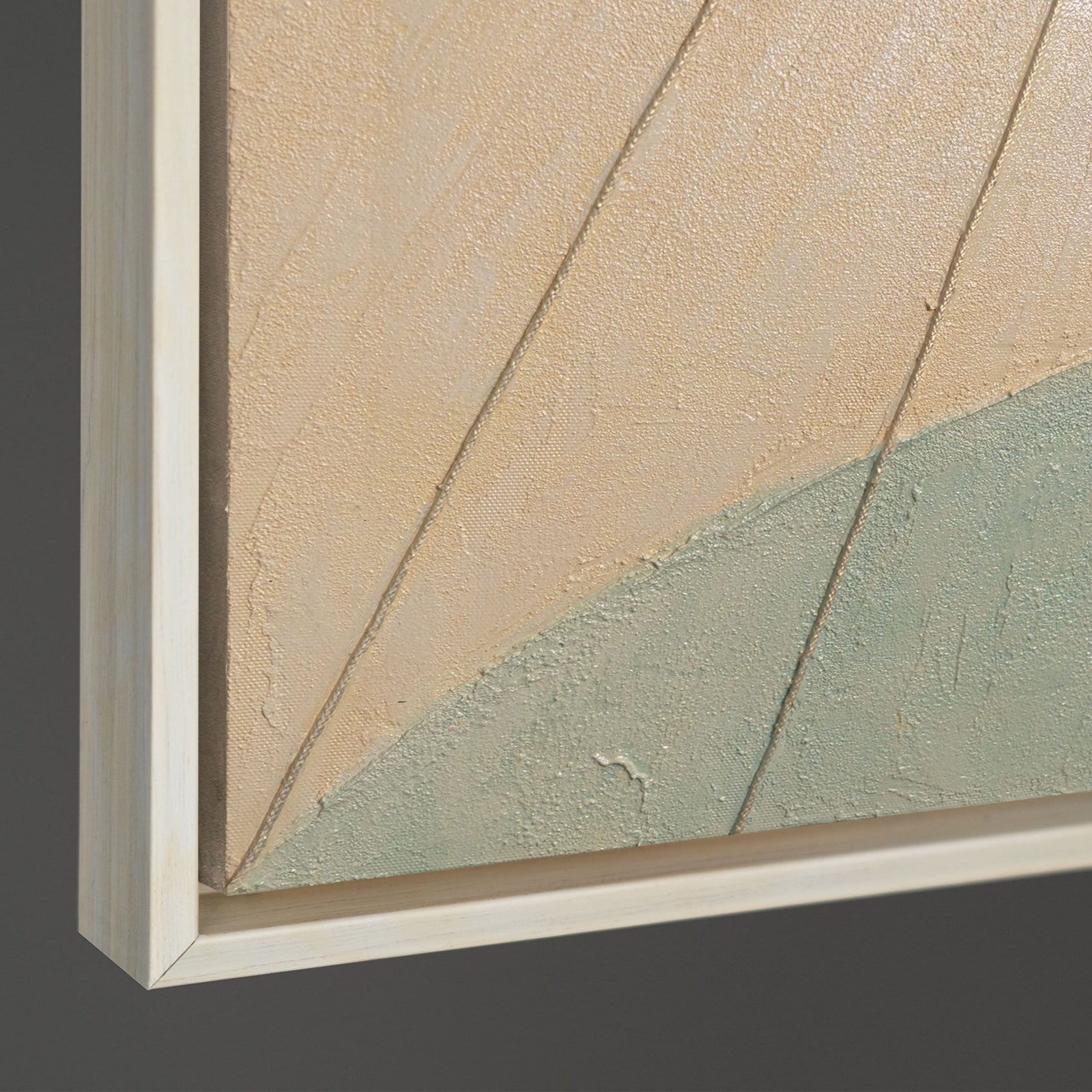 «Amanecer sobre el mar» resplandece con suaves tonos luminosos: una combinación de crema, azul claro y beige que captura el instante entre el día y la noche. La fina textura del lienzo añade profundidad y dinamismo, mientras que las delicadas líneas crean un ritmo meditativo.