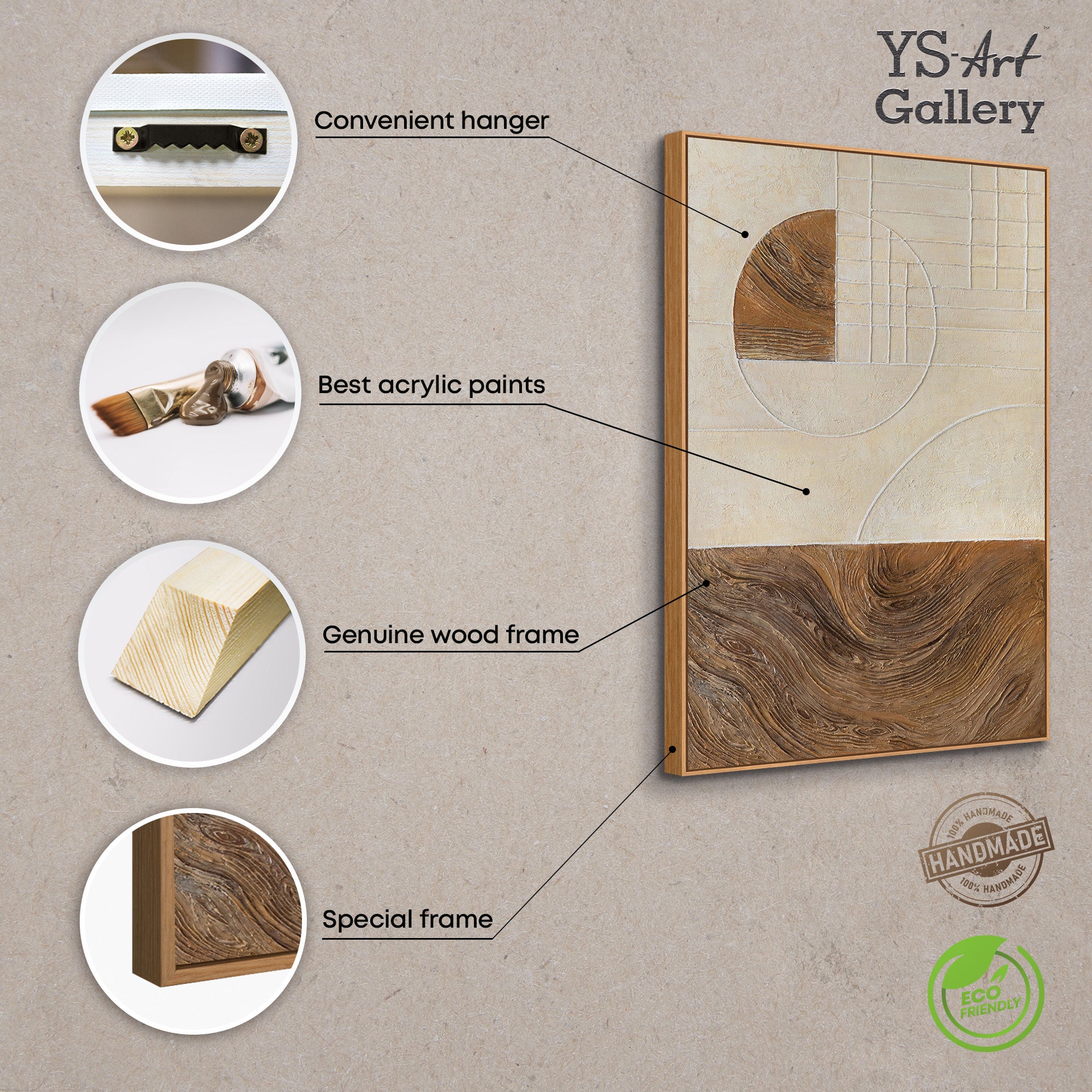 Esta pintura combina estructura, geometría y materialidad en un lenguaje visual tranquilo y moderno y es ideal para cualquiera que aprecie las formas claras y el arte pintado a mano de alta calidad.