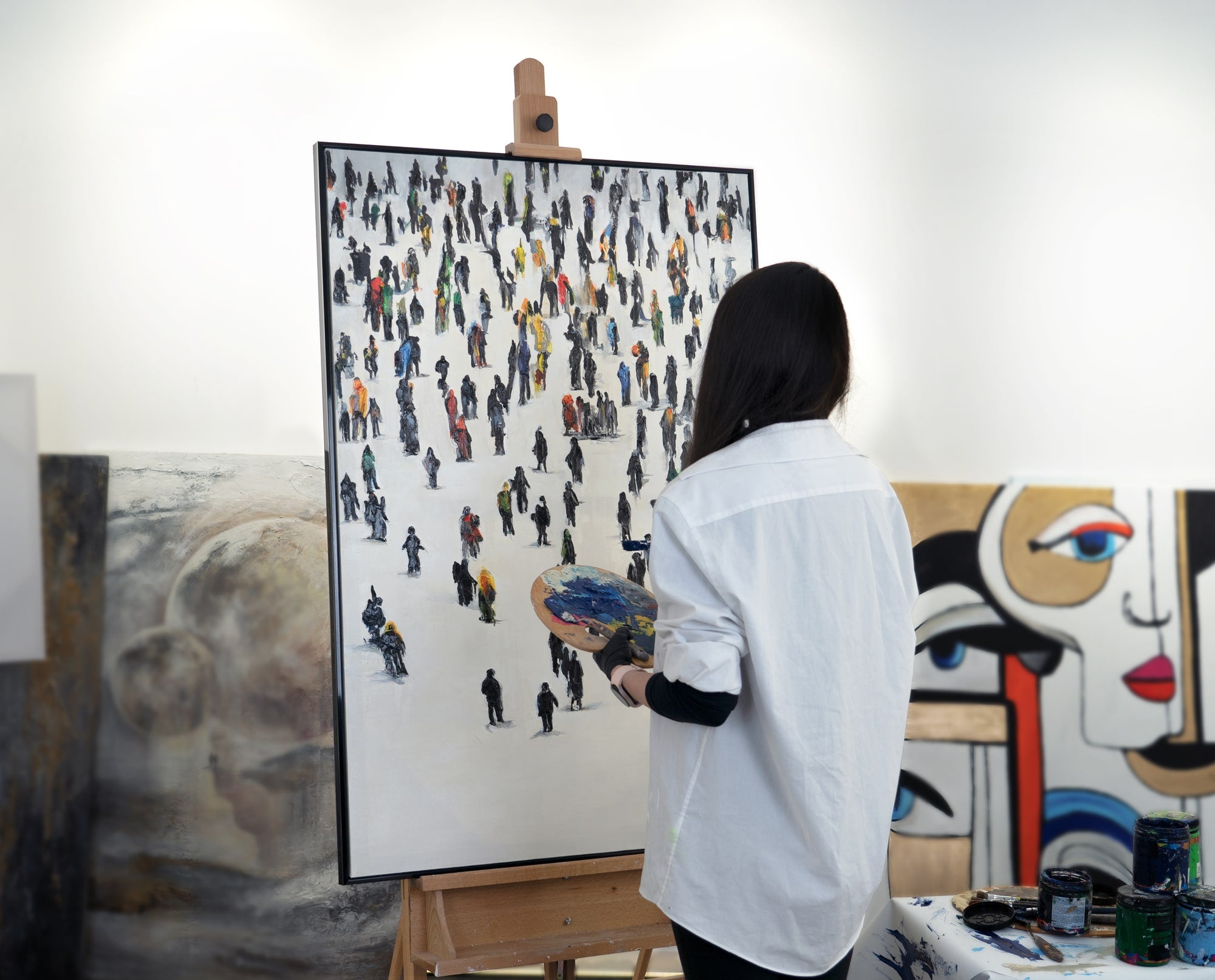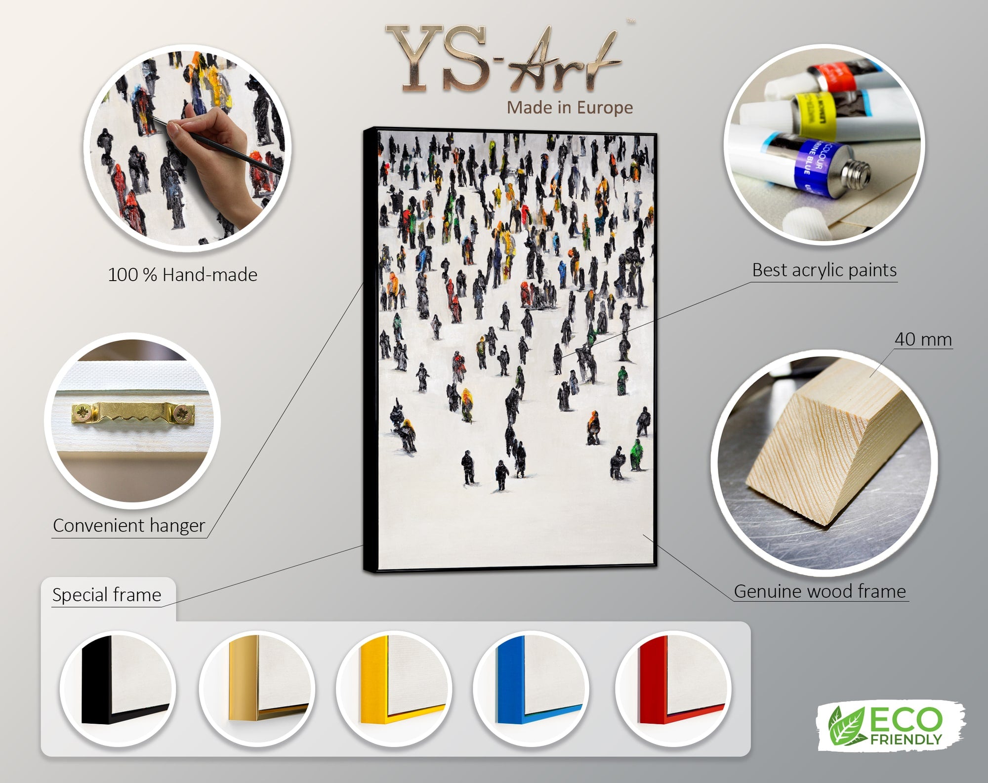 Enriquezca su hogar u oficina con esta pintura abstracta colorida, que representa la dinámica de una multitud. El cuadro destaca por sus tonos intensos y pinceladas expresivas. Está 100% pintado a mano y realzado con un elegante marco negro moderno.
