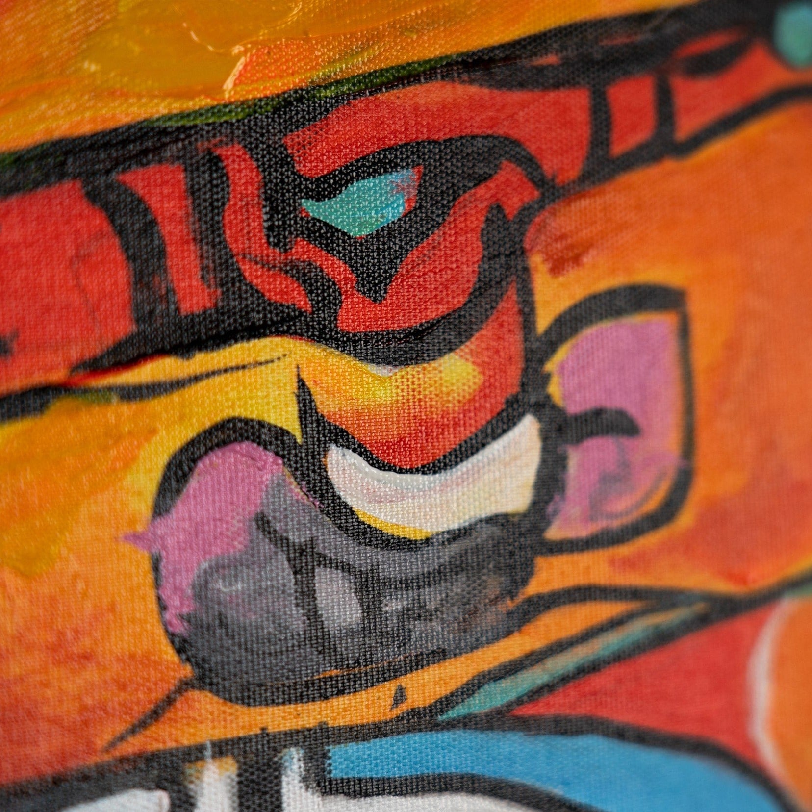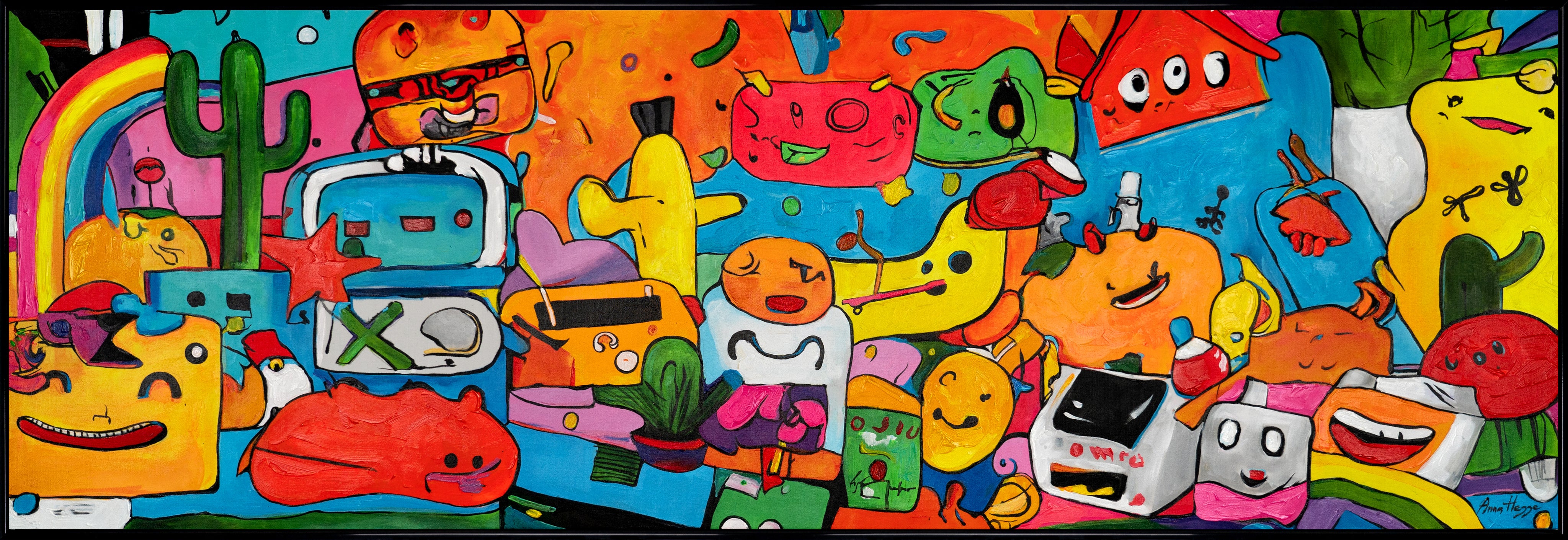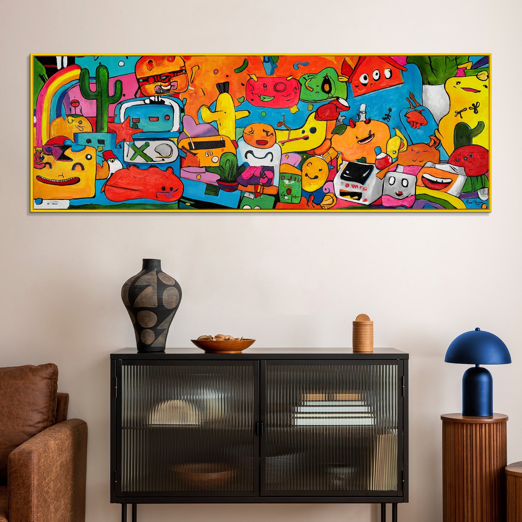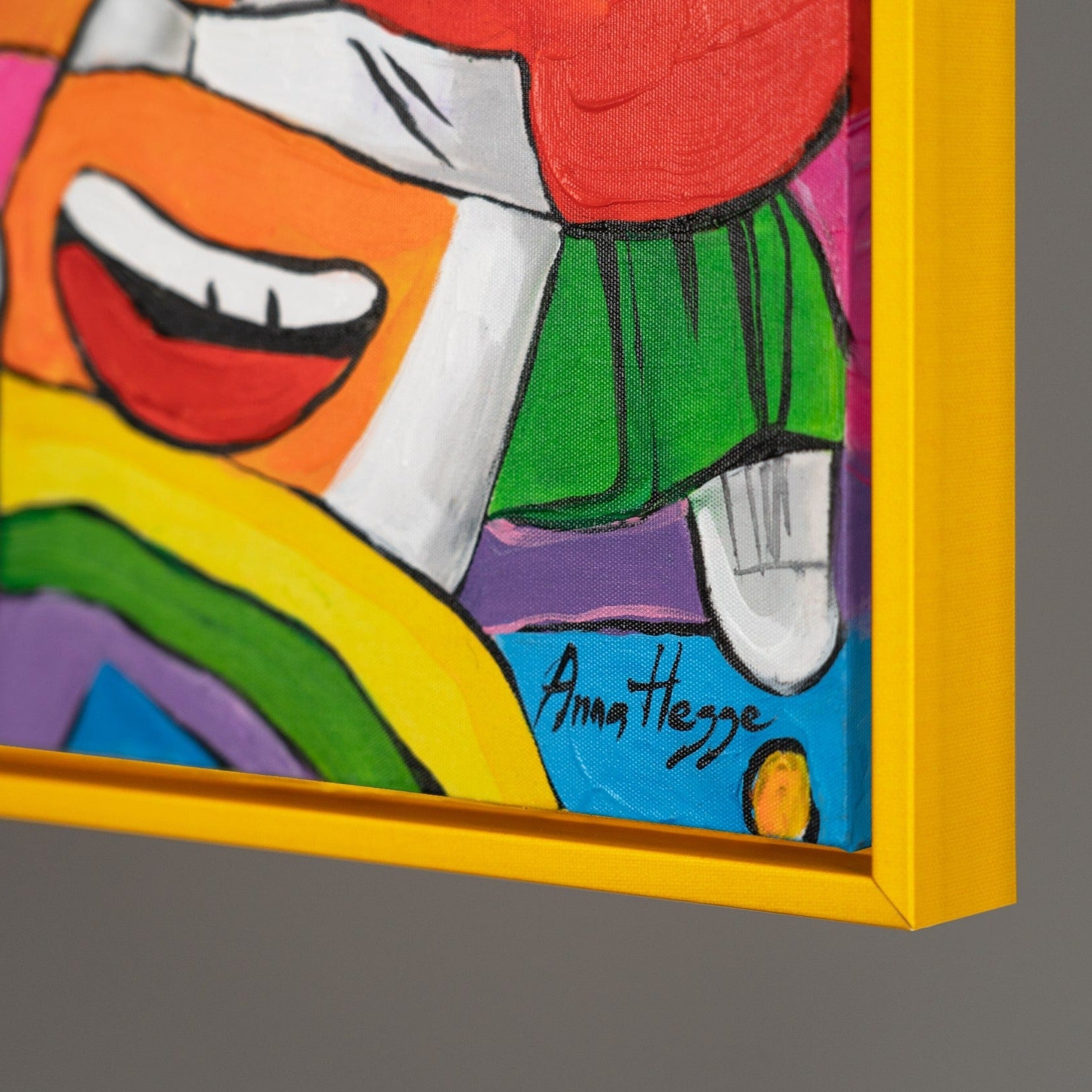 Enriquezca su hogar u oficina con esta pintura abstracta colorida, que representa un mundo animado y lleno de personajes vibrantes. El cuadro destaca por sus tonos intensos y pinceladas expresivas. Está 100% pintado a mano y realzado con un elegante marco amarillo moderno.