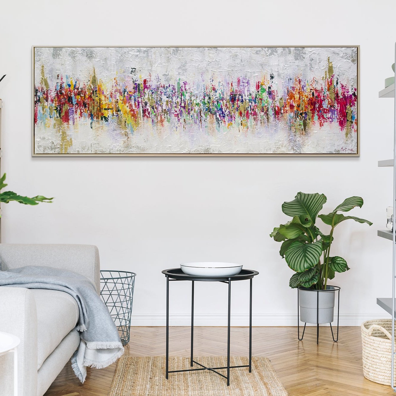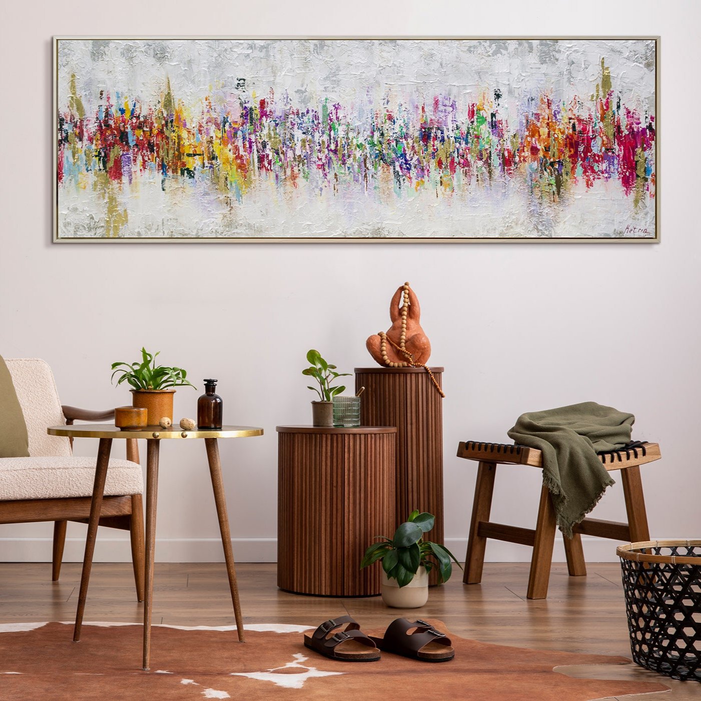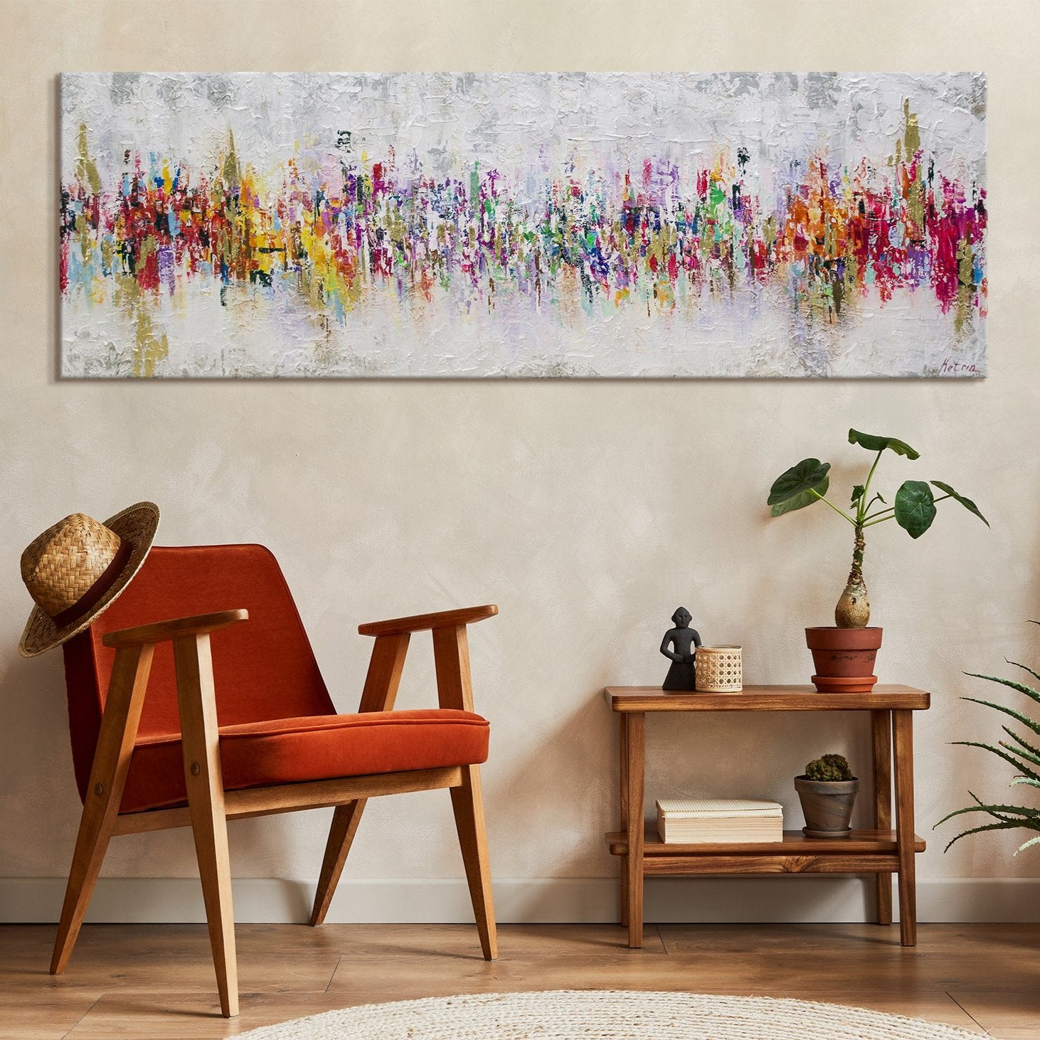 Este cuadro abstracto lleno de color aporta dinamismo y vitalidad a tu hogar. Los tonos vibrantes de la pintura acrílica sobre lienzo capturan la energía y la creatividad de un paisaje urbano moderno. Con toques intensos de rojo, amarillo, verde y azul, esta obra se convierte en el centro de atención en cualquier espacio.