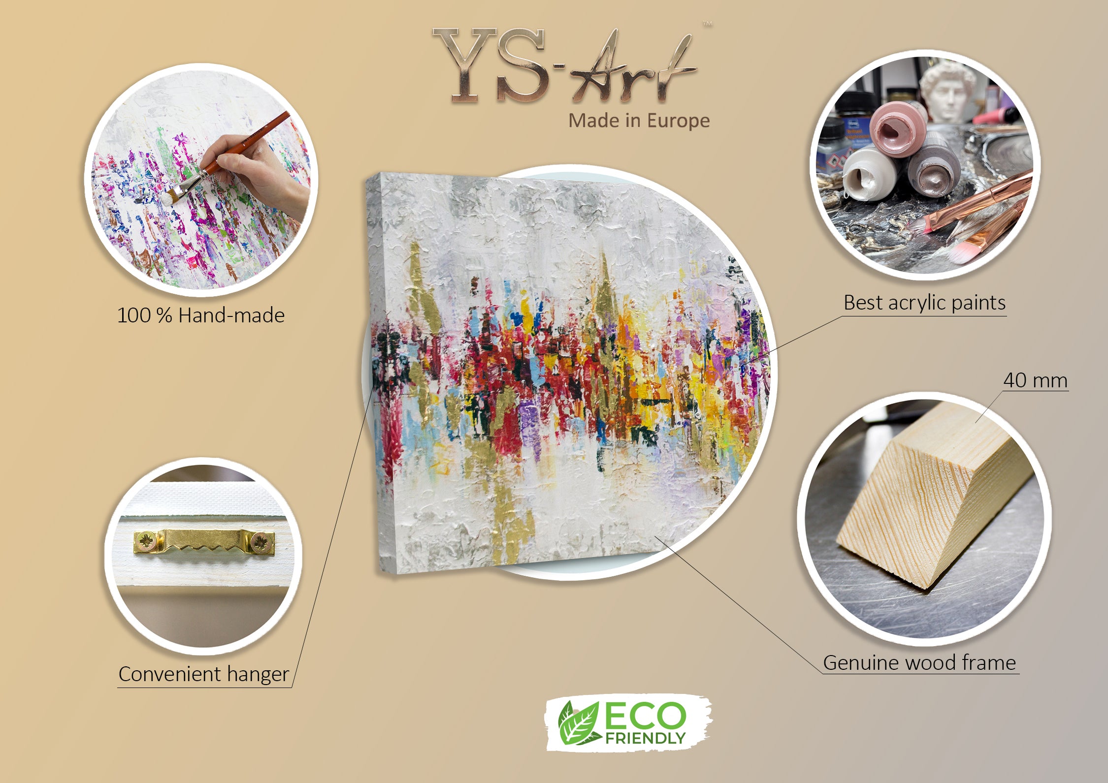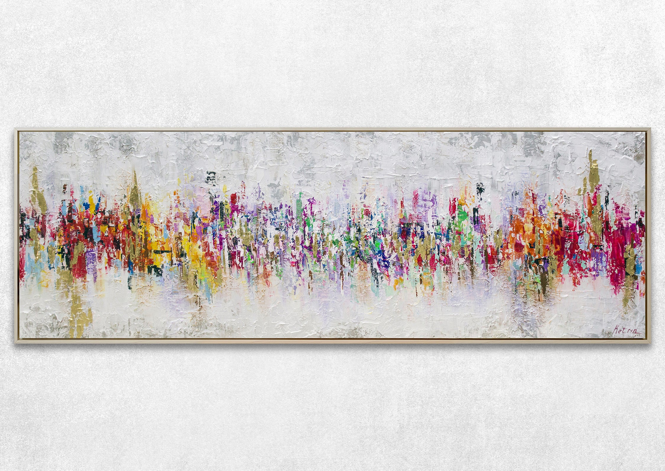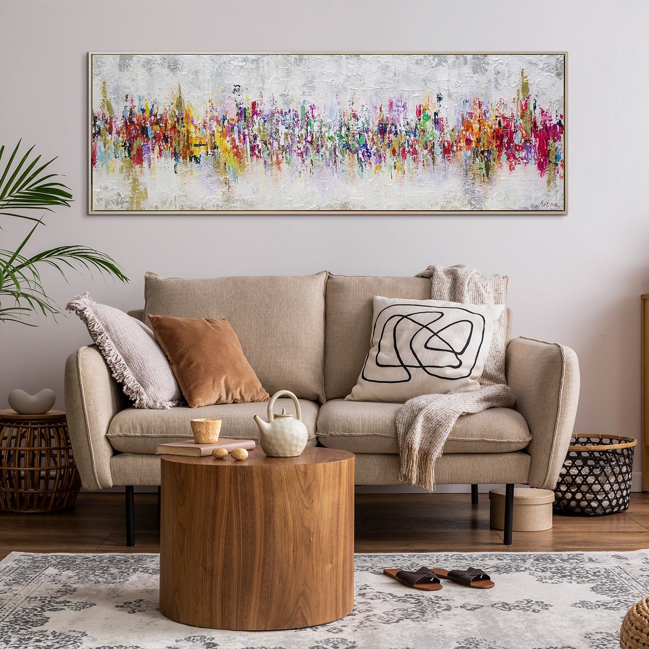 Este cuadro abstracto lleno de color aporta dinamismo y vitalidad a tu hogar. Los tonos vibrantes de la pintura acrílica sobre lienzo capturan la energía y la creatividad de un paisaje urbano moderno. Con toques intensos de rojo, amarillo, verde y azul, esta obra se convierte en el centro de atención en cualquier espacio.