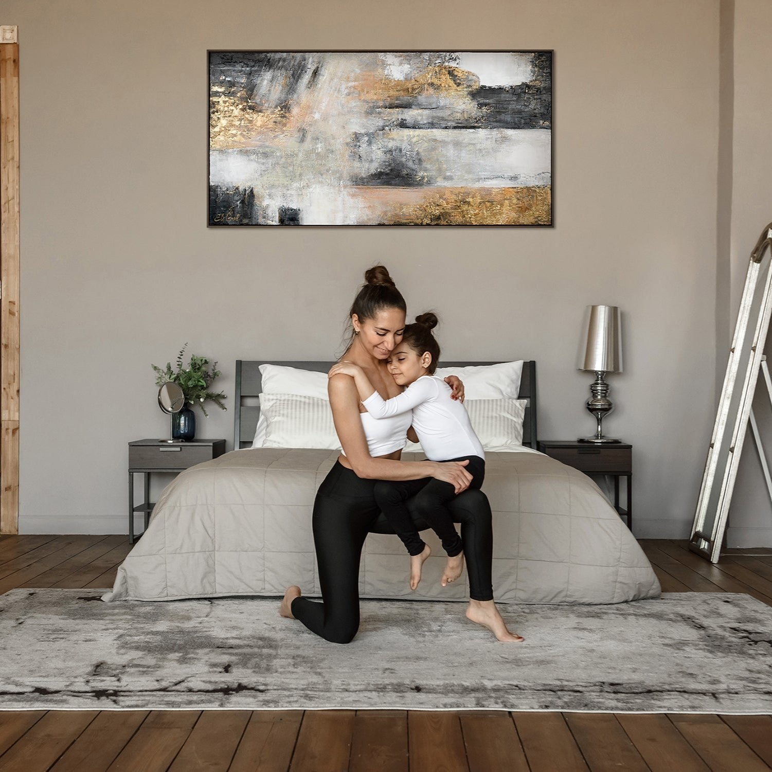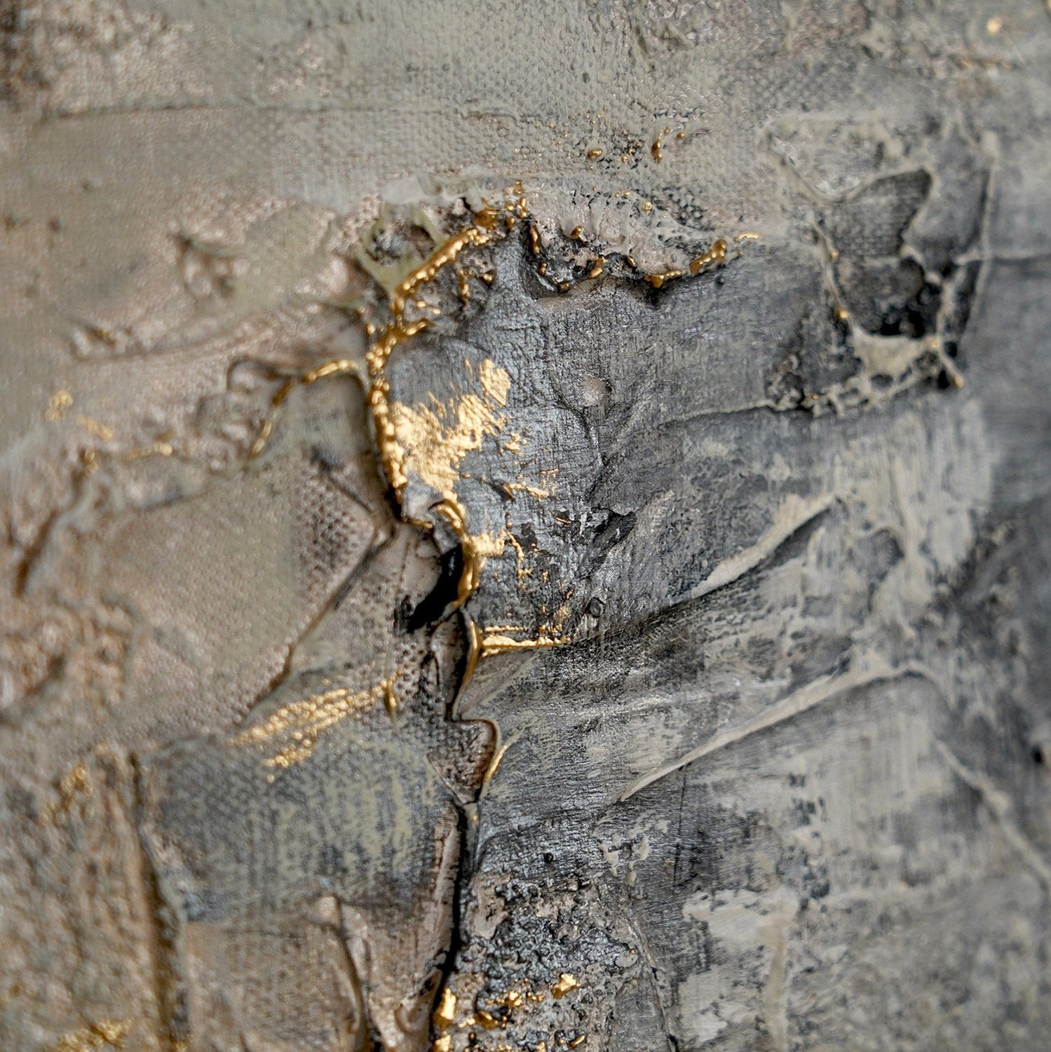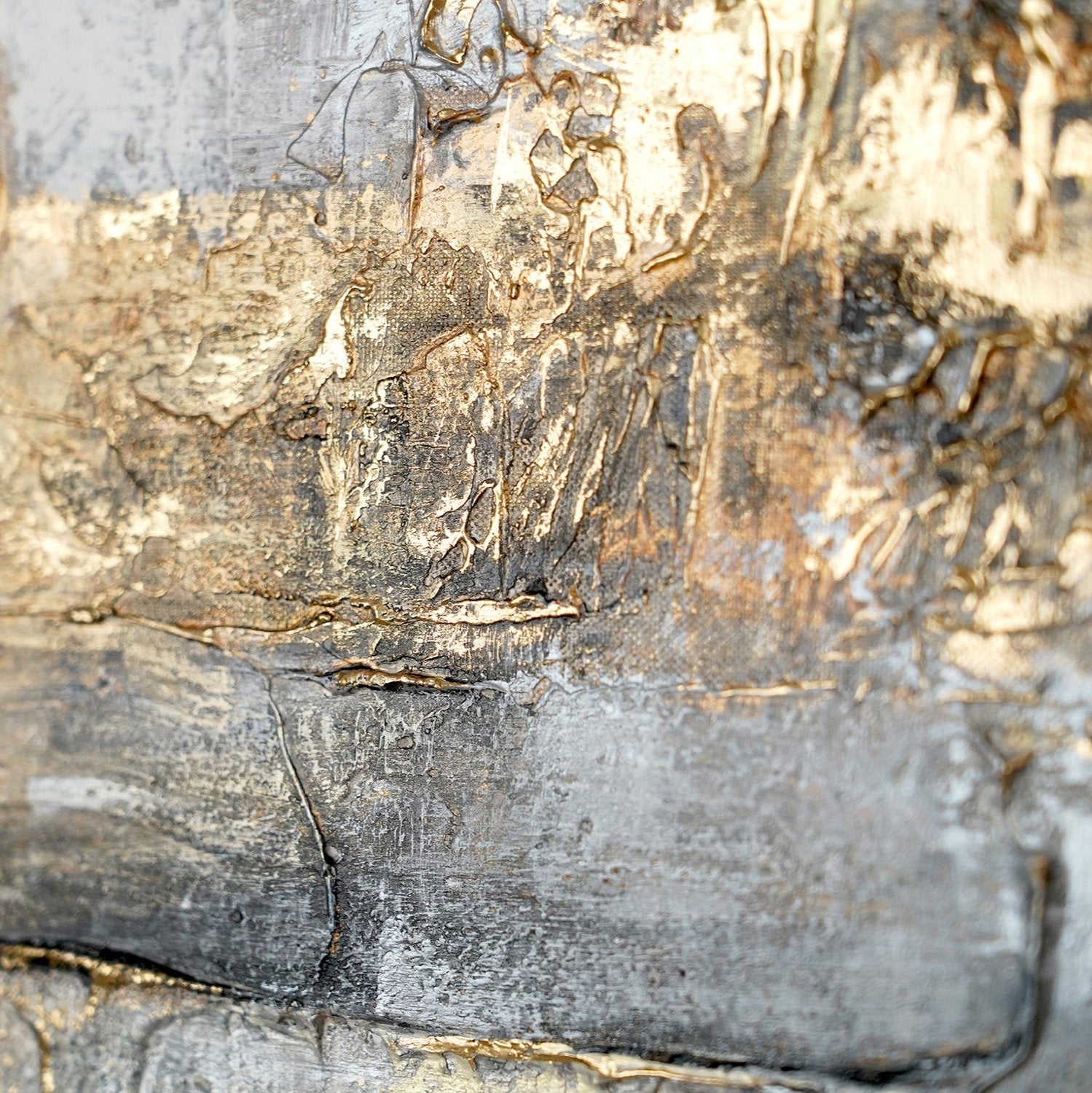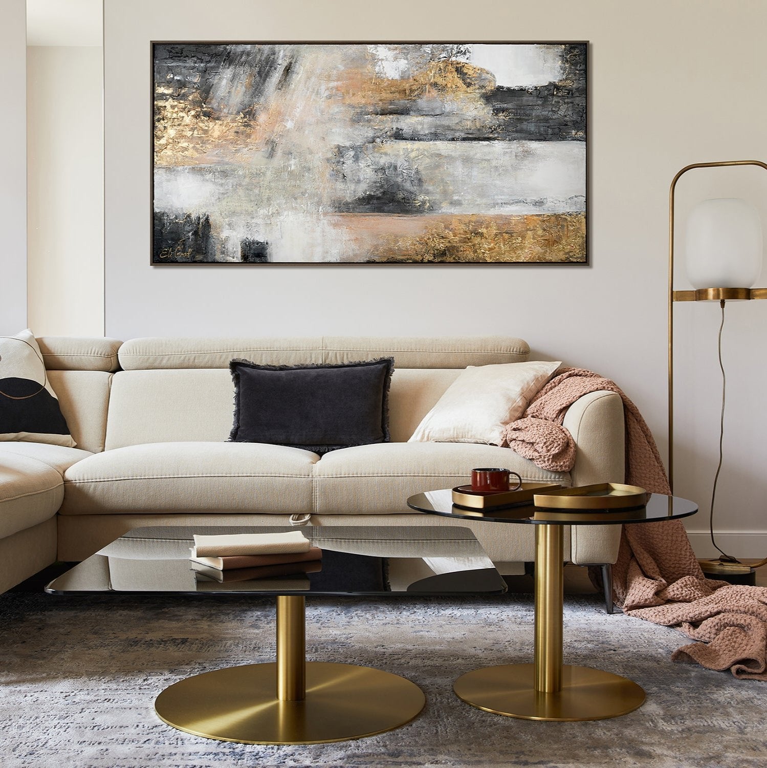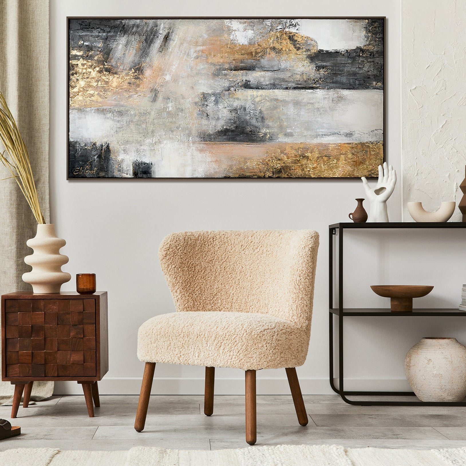 Esta pintura abstracta moderna sobre lienzo aporta una elegancia atemporal a cualquier espacio. La combinación armoniosa de tonos neutros, acentos dorados y una textura dinámica crea una sensación de profundidad y equilibrio visual que transforma el ambiente de la estancia.