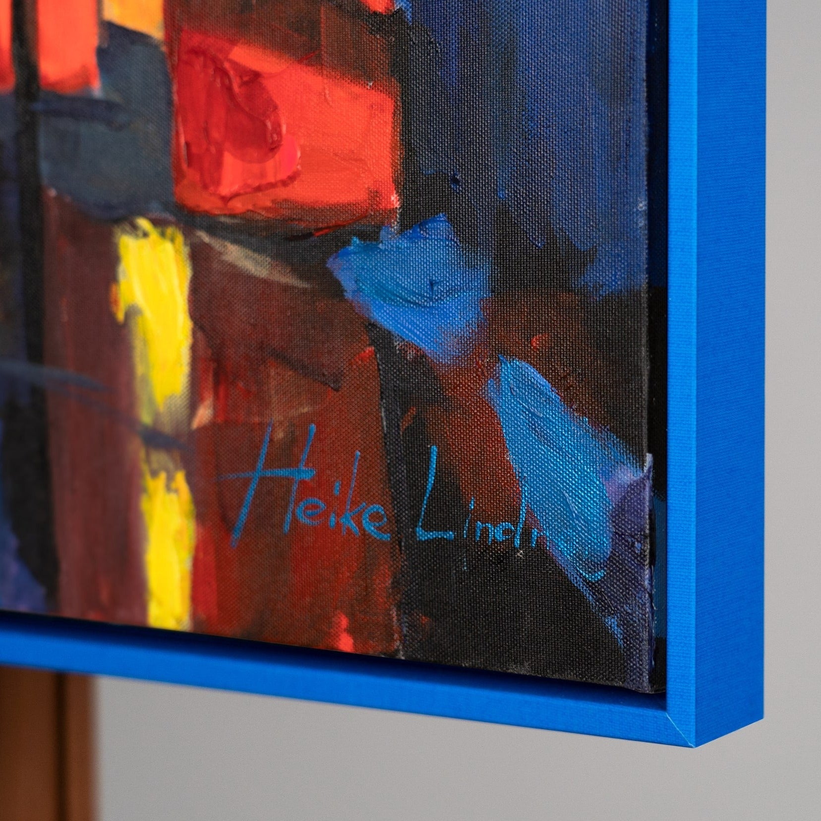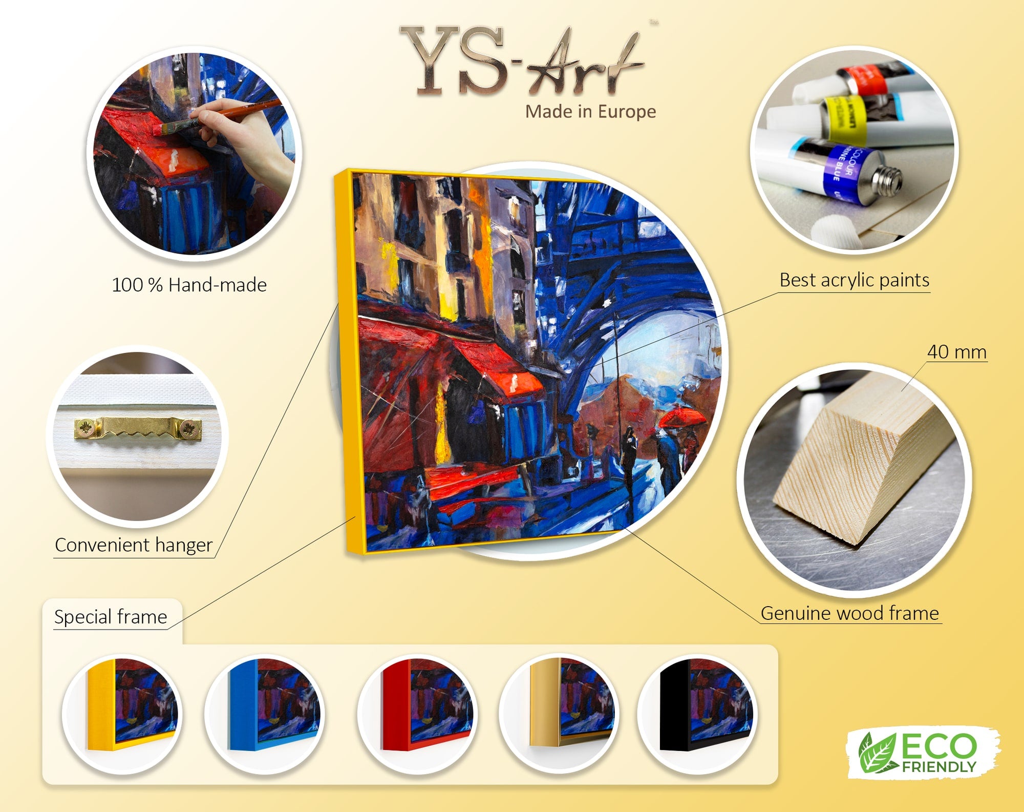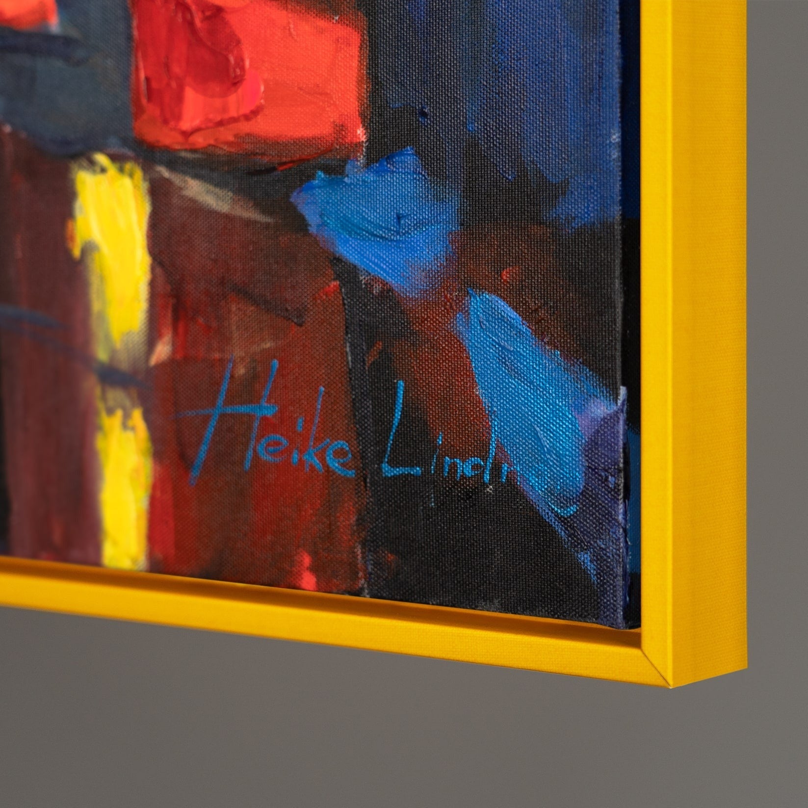 Enriquezca su hogar con esta pintura abstracta colorida que representa las animadas calles de París por la noche. El cuadro destaca por sus tonos intensos y pinceladas expresivas. Está 100% pintado a mano y realzado con un elegante marco amarillo moderno.