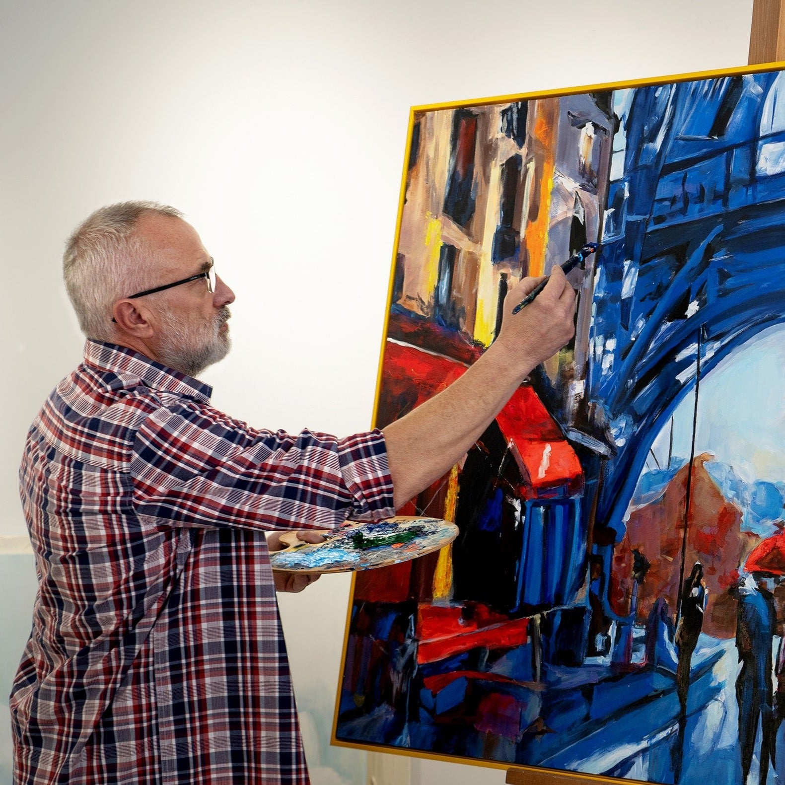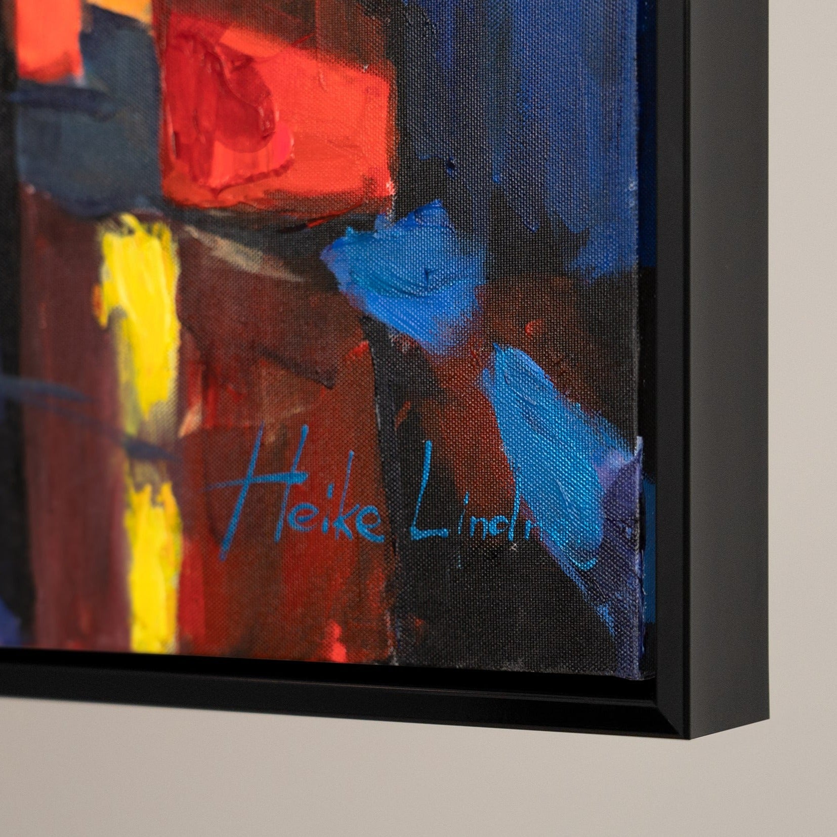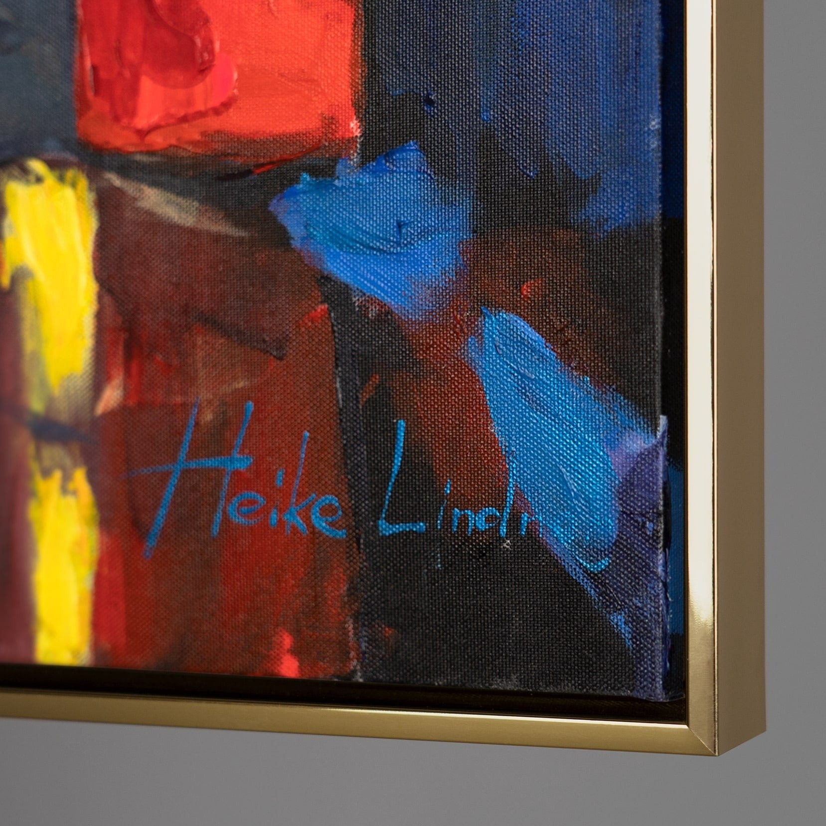 Enriquezca su hogar con esta pintura abstracta colorida que representa las animadas calles de París por la noche. El cuadro destaca por sus tonos intensos y pinceladas expresivas. Está 100% pintado a mano y realzado con un elegante marco amarillo moderno.