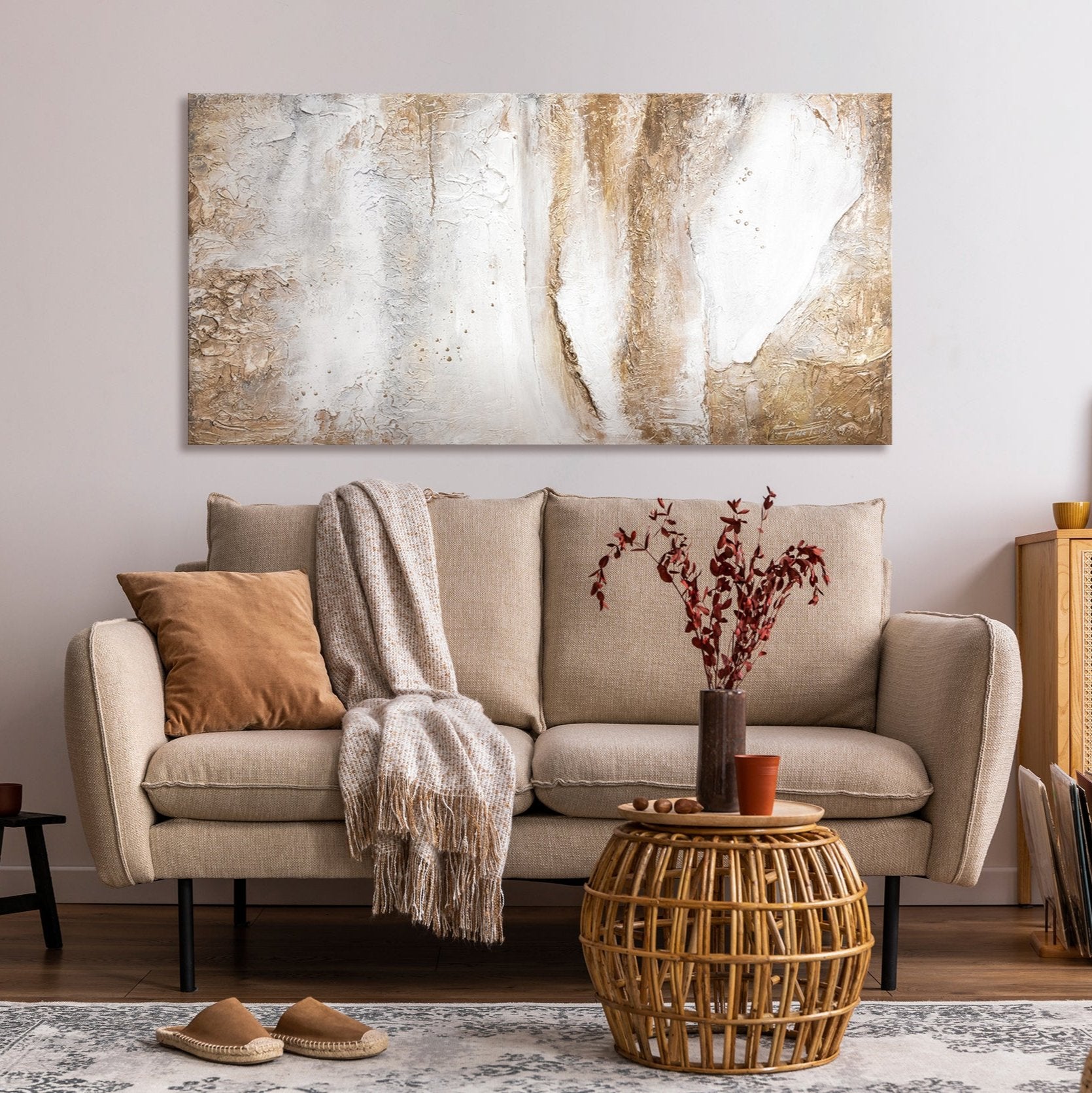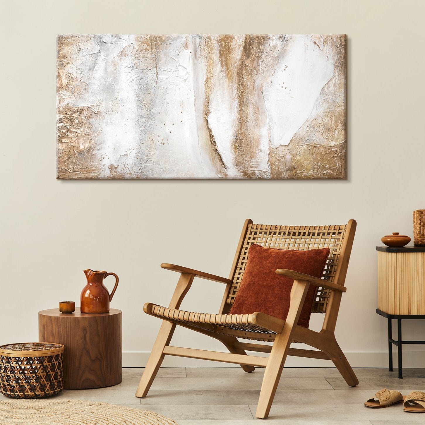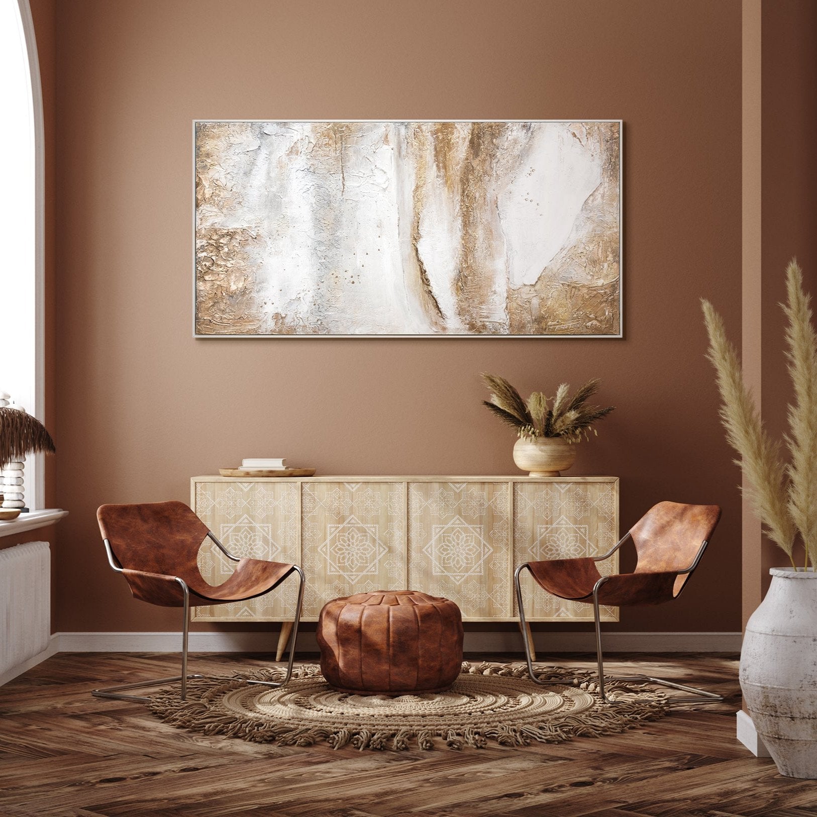 Esta pintura acrílica abstracta hecha a mano combina elegancia y estilo moderno en una obra impresionante. Con sutiles acentos dorados y una superficie con textura, añade un toque de lujo a cualquier estancia. Los tonos dorados cálidos armonizan con los matices claros y terrosos, creando una atmósfera serena pero cautivadora. Ideal para salones, oficinas o cualquier espacio donde el arte inspire y embellezca.