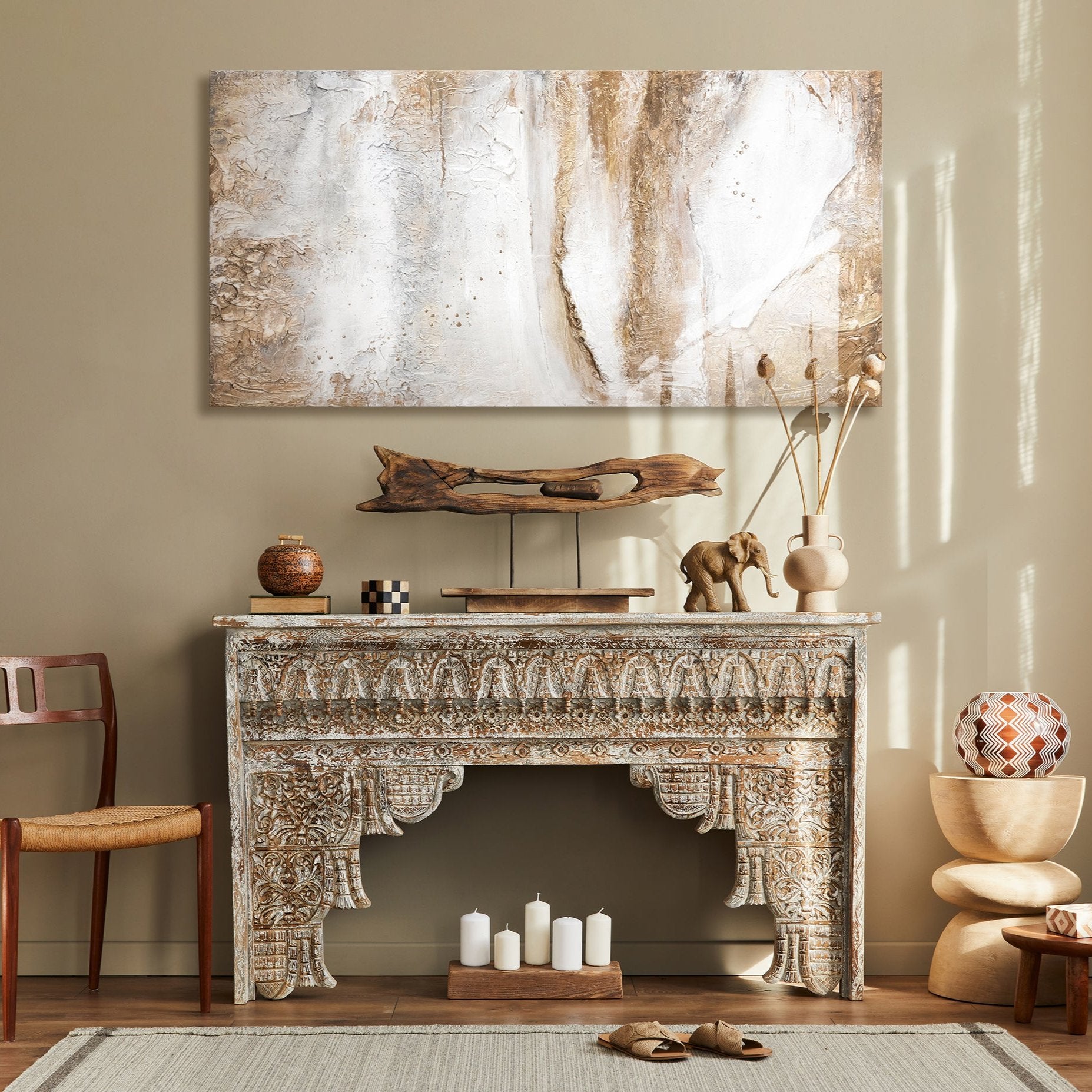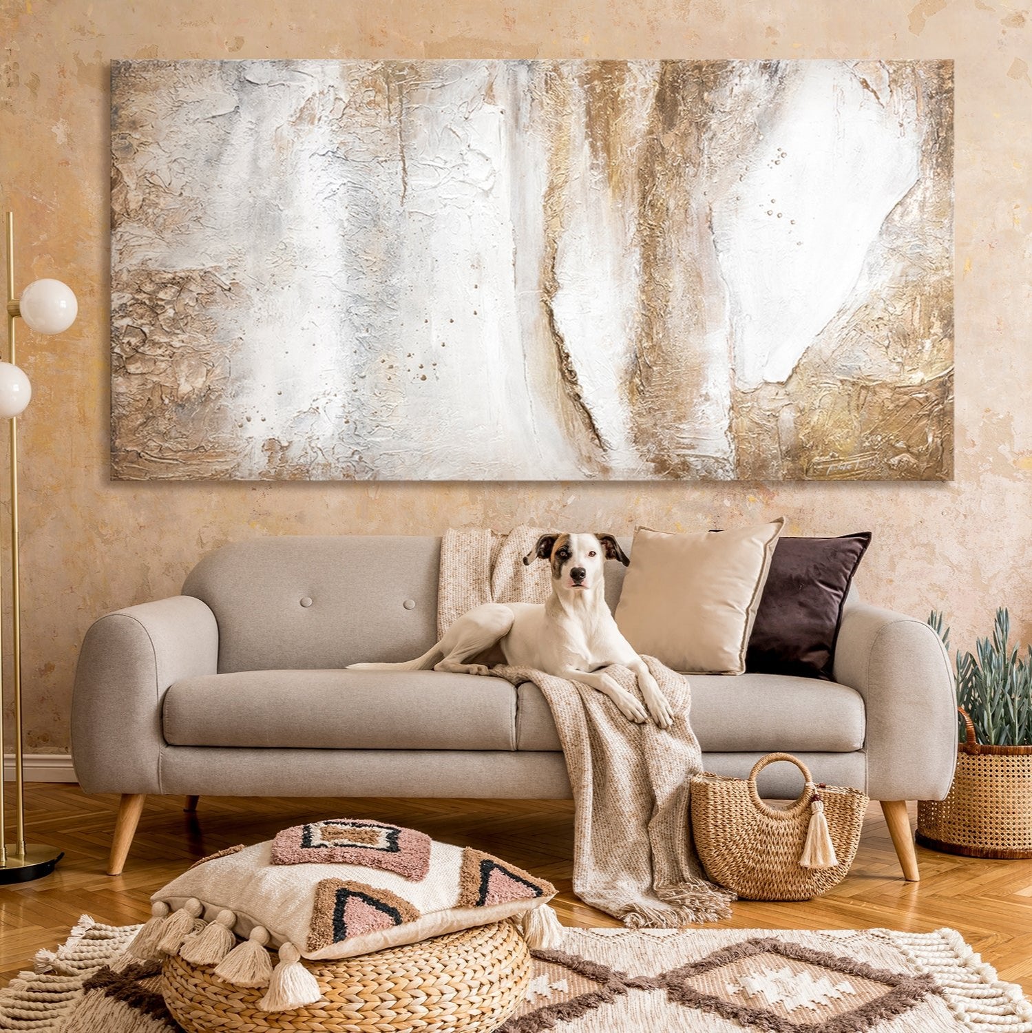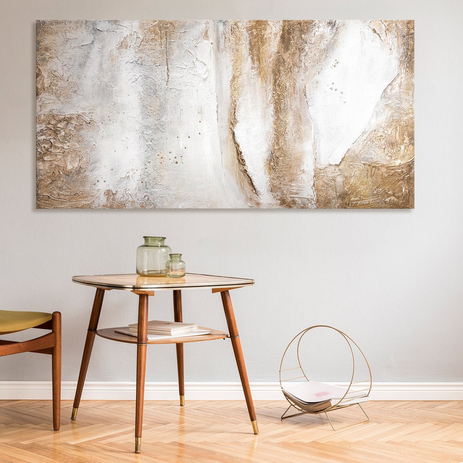 Esta pintura acrílica abstracta hecha a mano combina elegancia y estilo moderno en una obra impresionante. Con sutiles acentos dorados y una superficie con textura, añade un toque de lujo a cualquier estancia. Los tonos dorados cálidos armonizan con los matices claros y terrosos, creando una atmósfera serena pero cautivadora. Ideal para salones, oficinas o cualquier espacio donde el arte inspire y embellezca.
