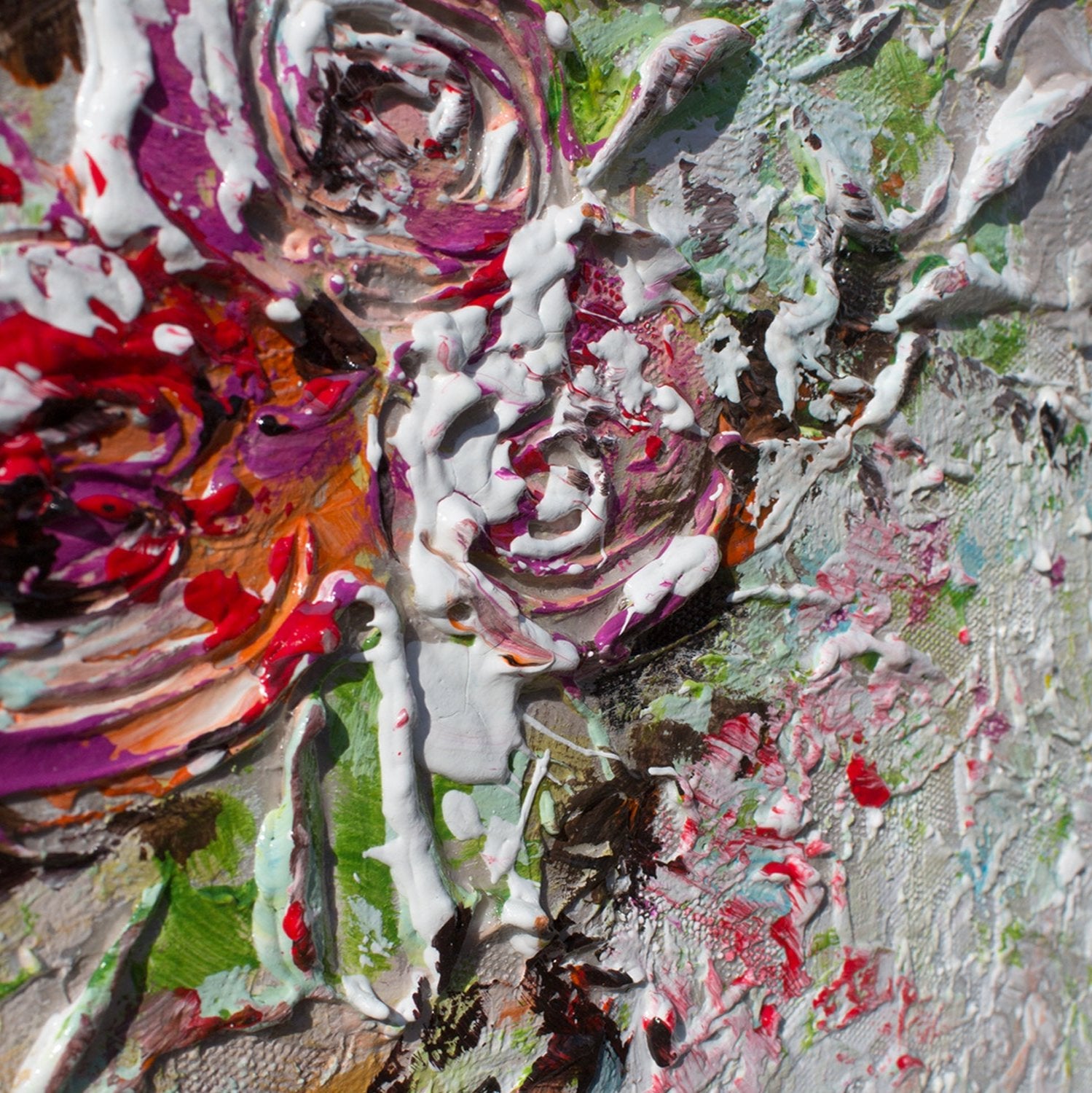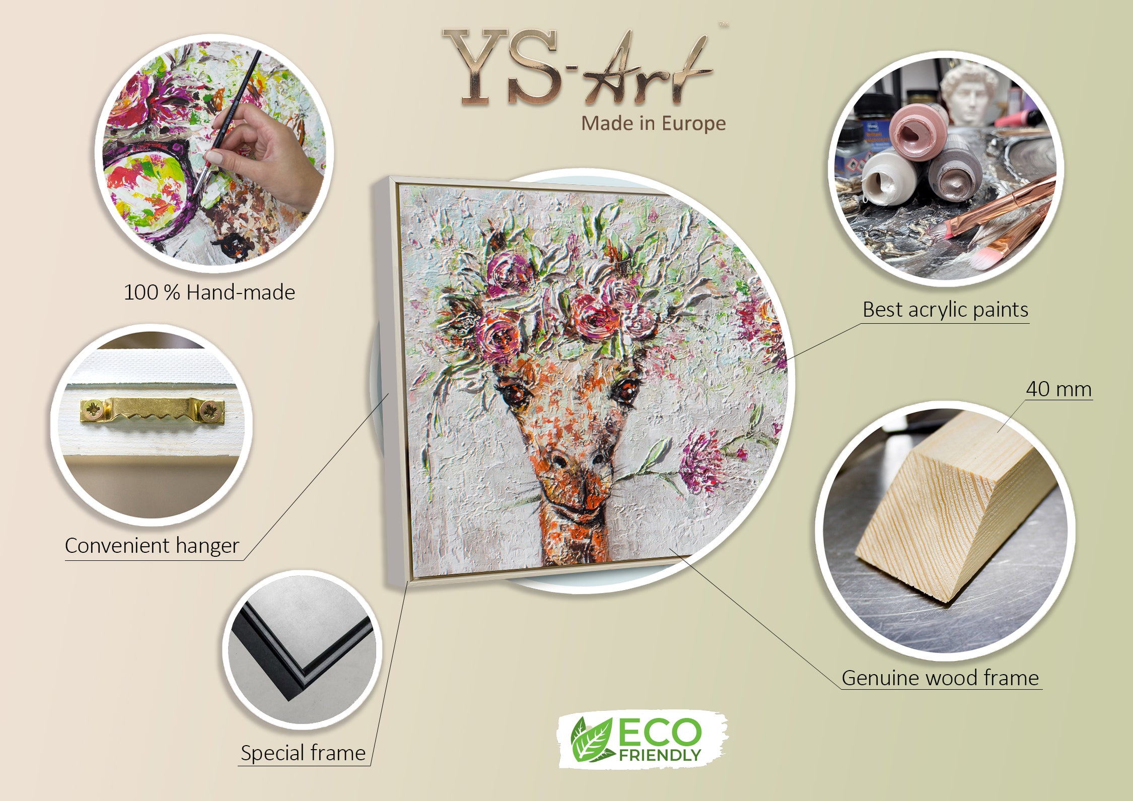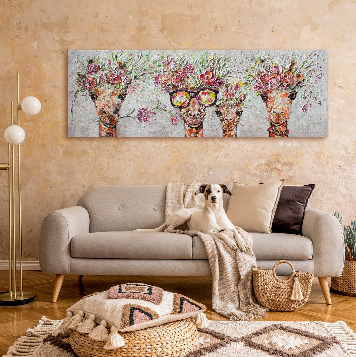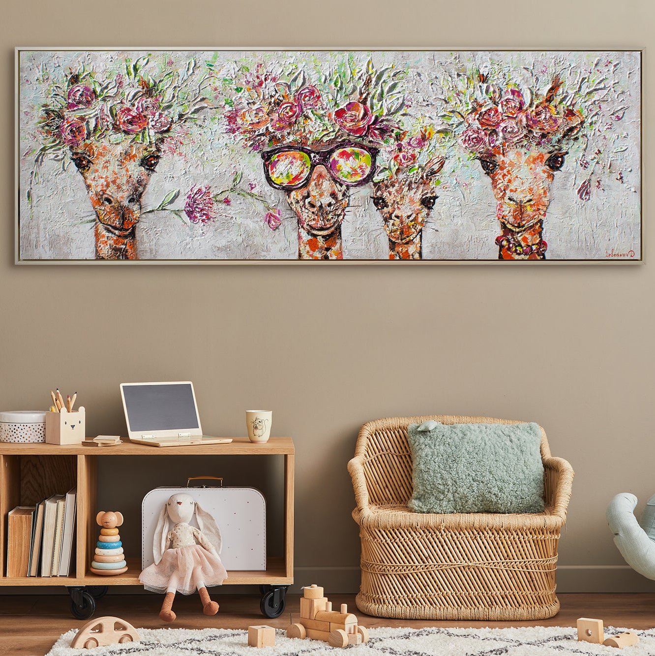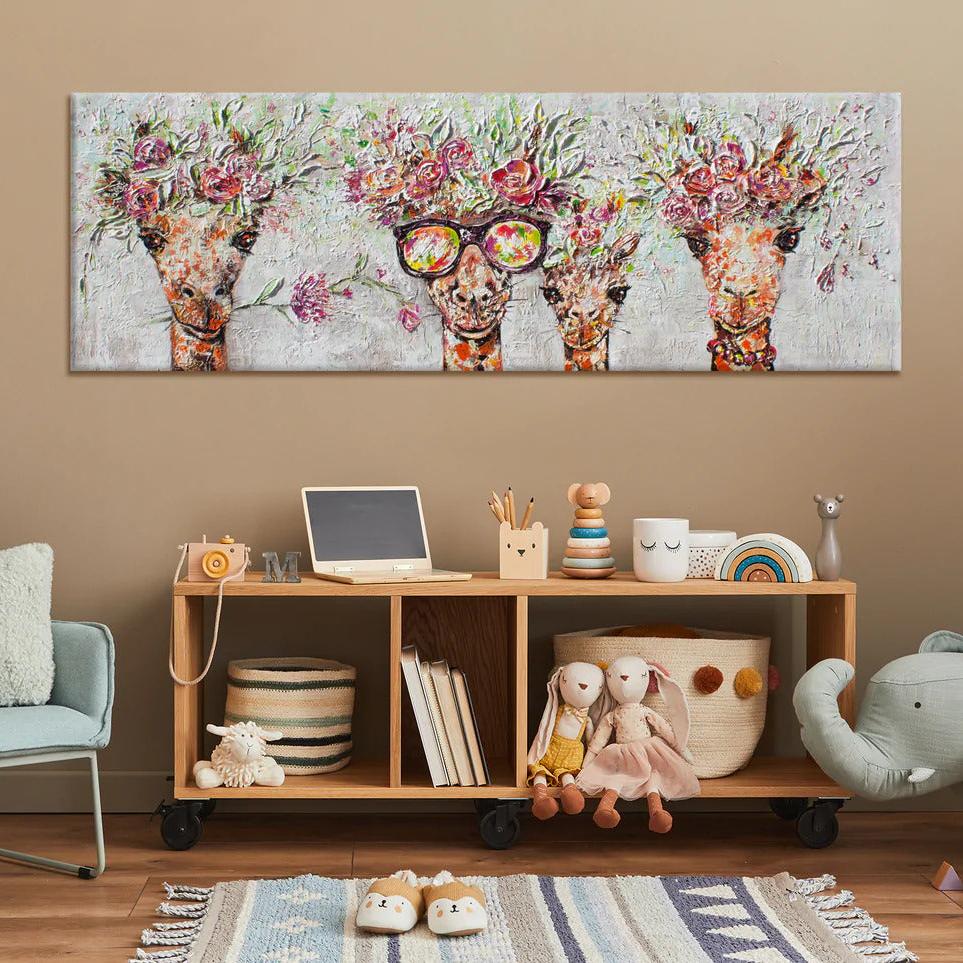 Este cuadro acrílico pintado a mano sobre lienzo aporta una atmósfera alegre y colorida a tu hogar. Tres jirafas adornadas con coronas de flores, una de ellas con gafas de sol, dan a esta obra moderna un encanto único. Los colores vivos y el diseño creativo convierten este cuadro en un verdadero punto focal en cualquier habitación.