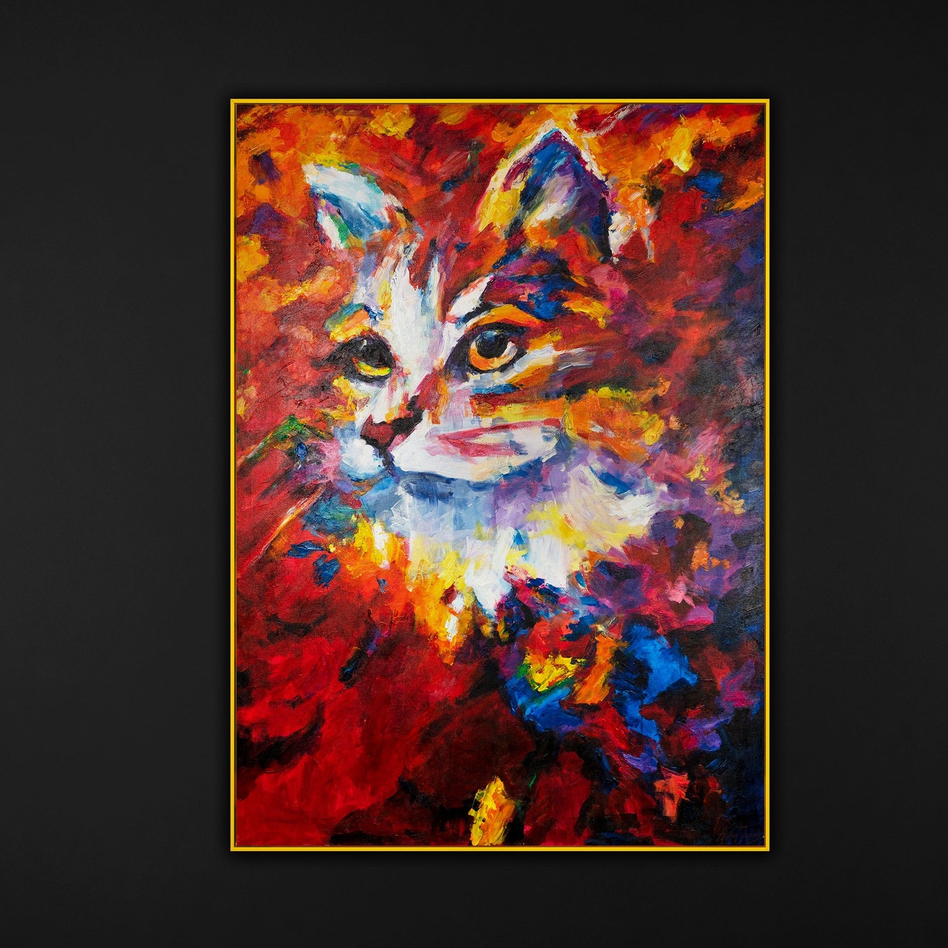 Sumérgete en el mundo del arte moderno con nuestra exclusiva pintura acrílica de un gato. Cada obra de esta serie es una creación única, pintada a mano con colores acrílicos de alta calidad sobre lienzo. Los colores vibrantes y la impresionante textura le otorgan una dimensión realista al arte, cautivando a cada espectador. El marco sólido que rodea la pintura resalta la belleza de la obra y la hace lista para colgar en tu hogar o oficina.