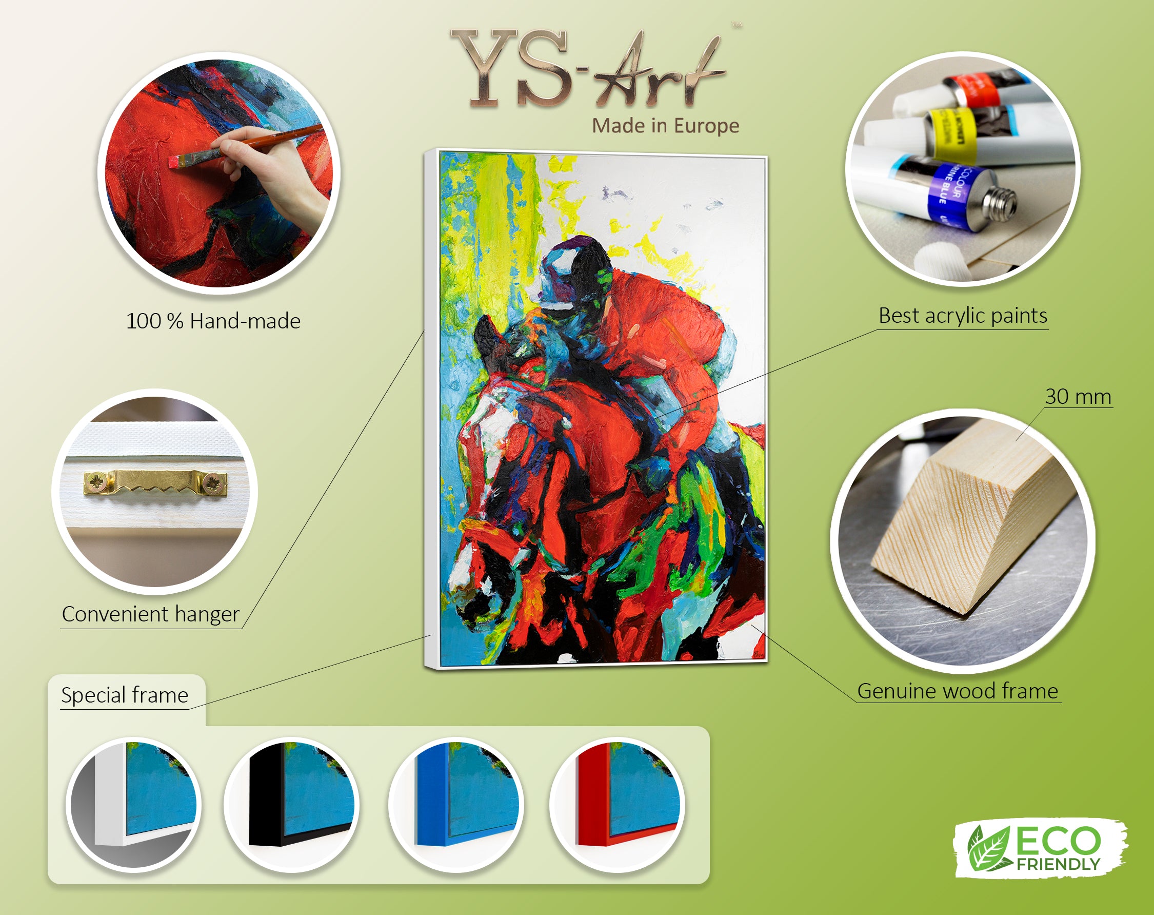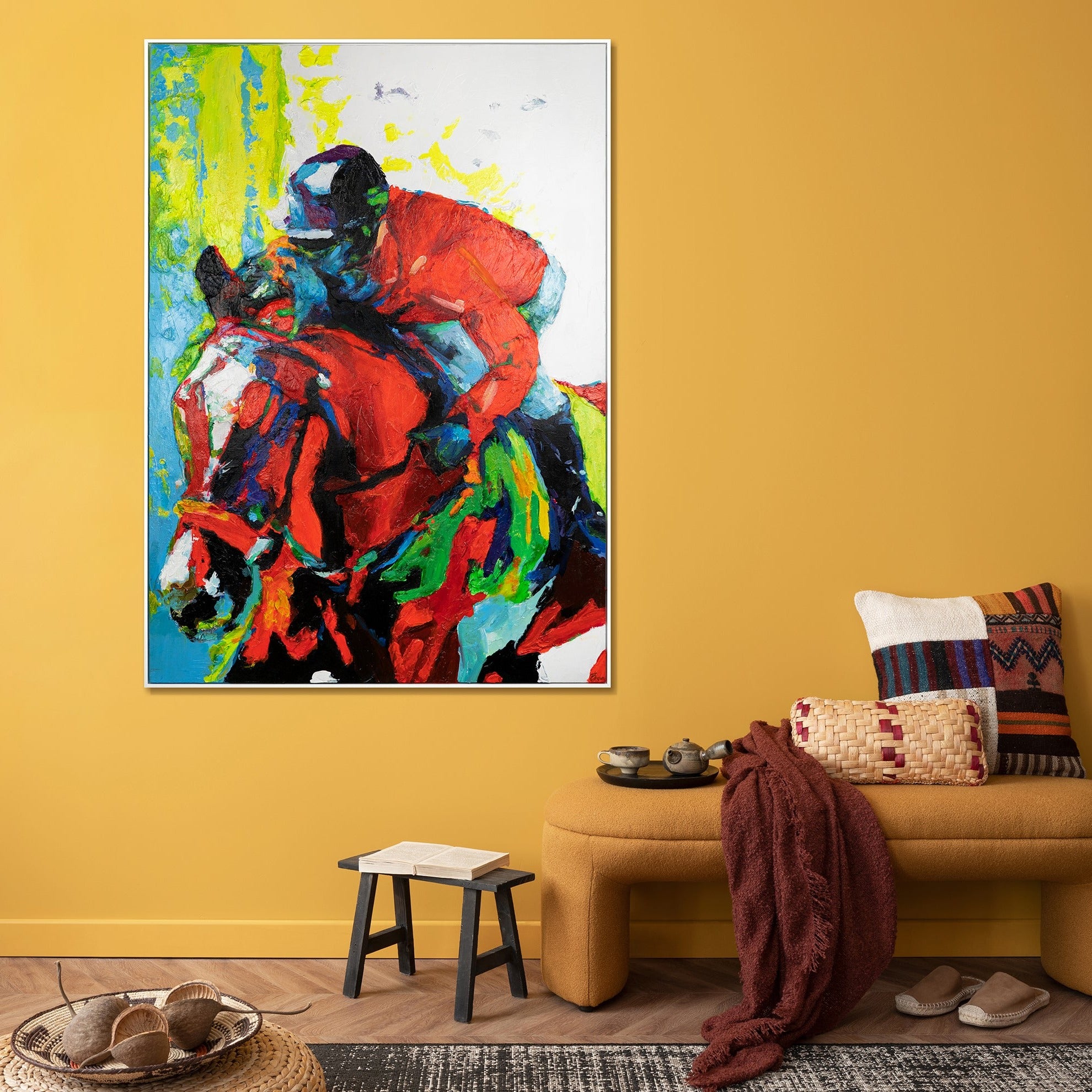 Como oferta especial, esta pintura acrílica será entregada con envío gratuito directamente a su hogar. No solo es una pieza impresionante para su propio hogar, sino también un regalo pensado para los amantes del arte y los entusiastas de la equitación. Cada obra es empaquetada con seguridad para garantizar su calidad durante el envío. No te pierdas esta pintura acrílica moderna y lleva a tu vida una pieza de elegancia hecha a mano.