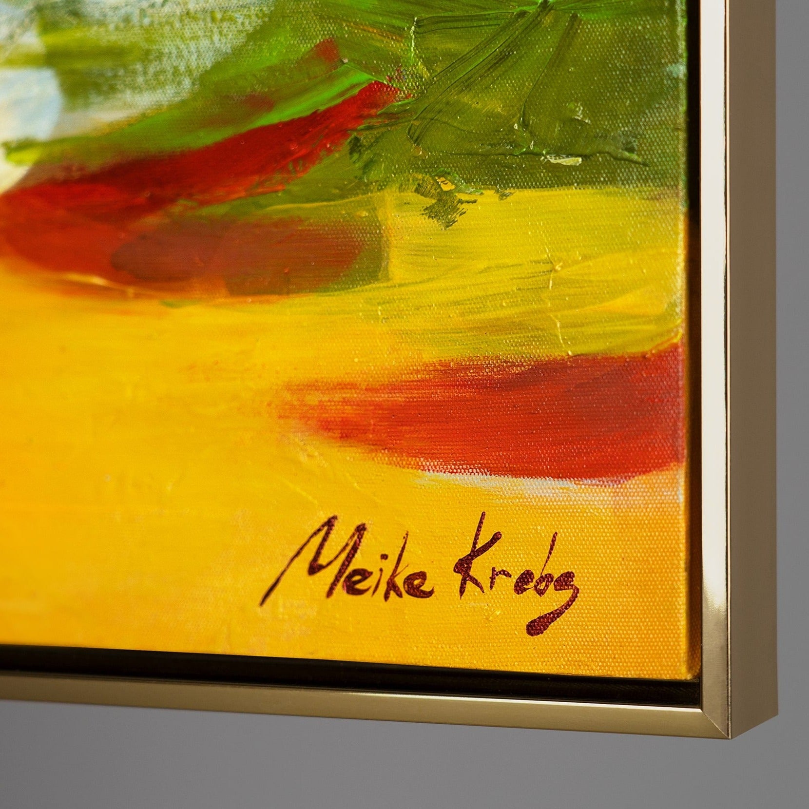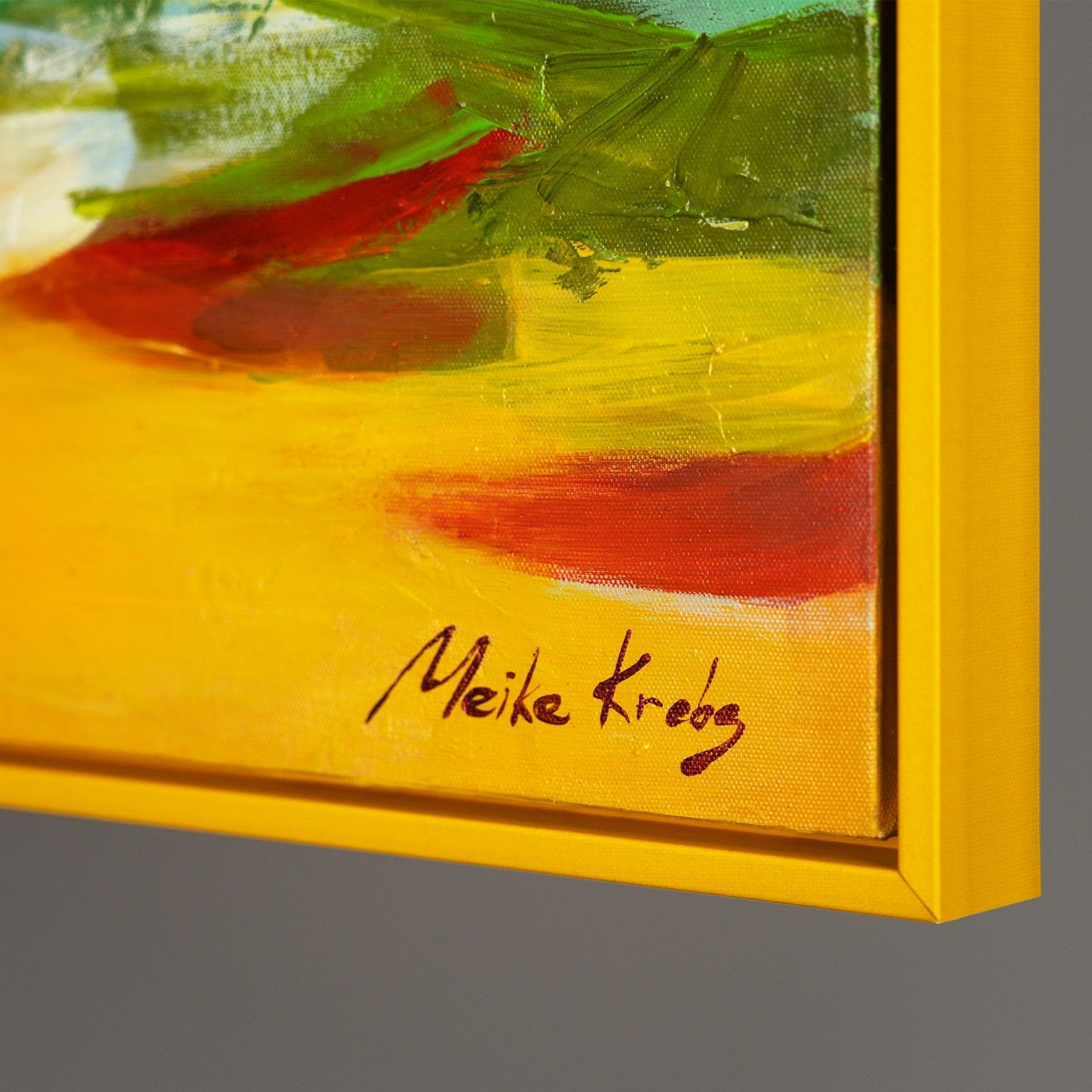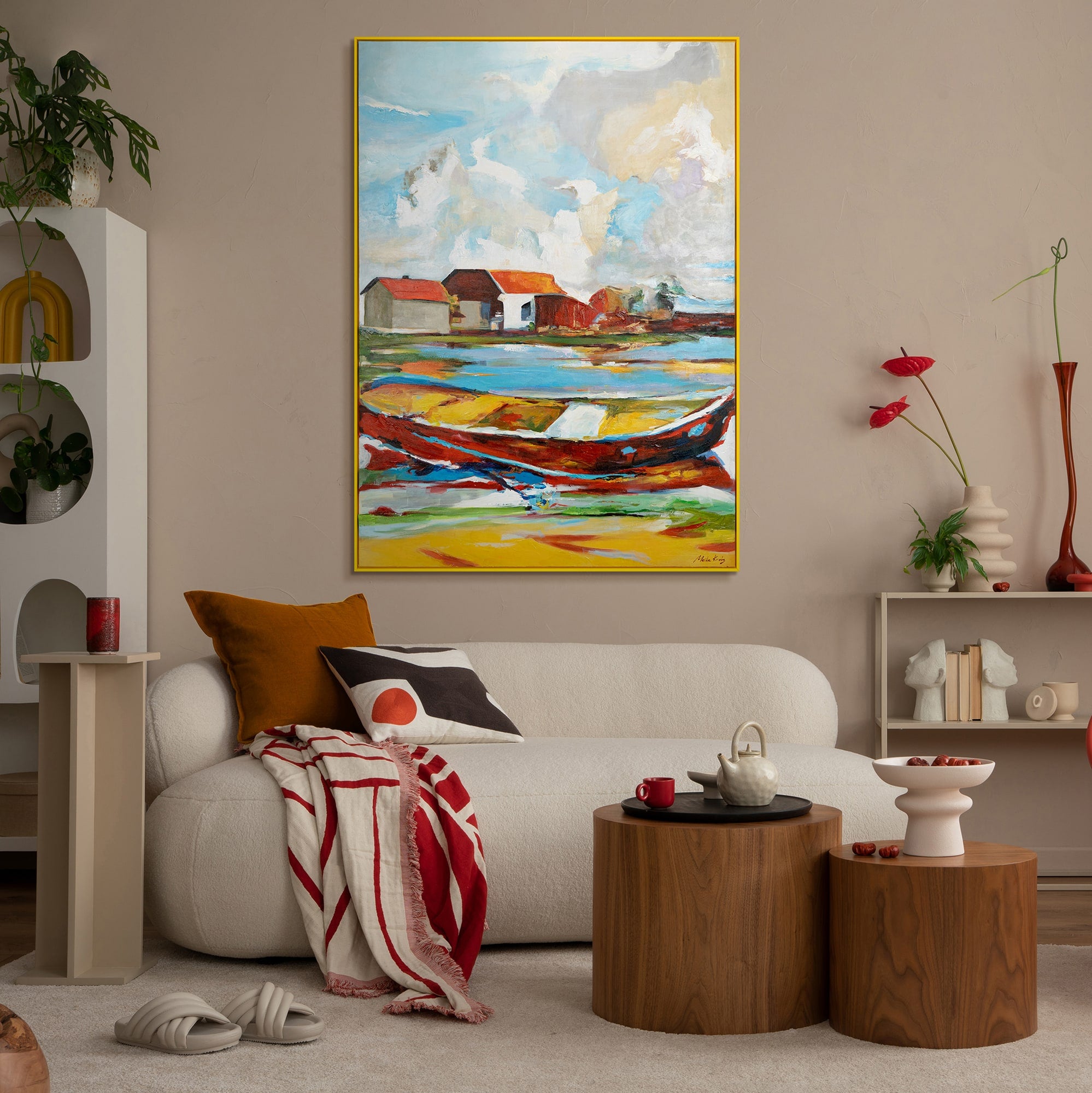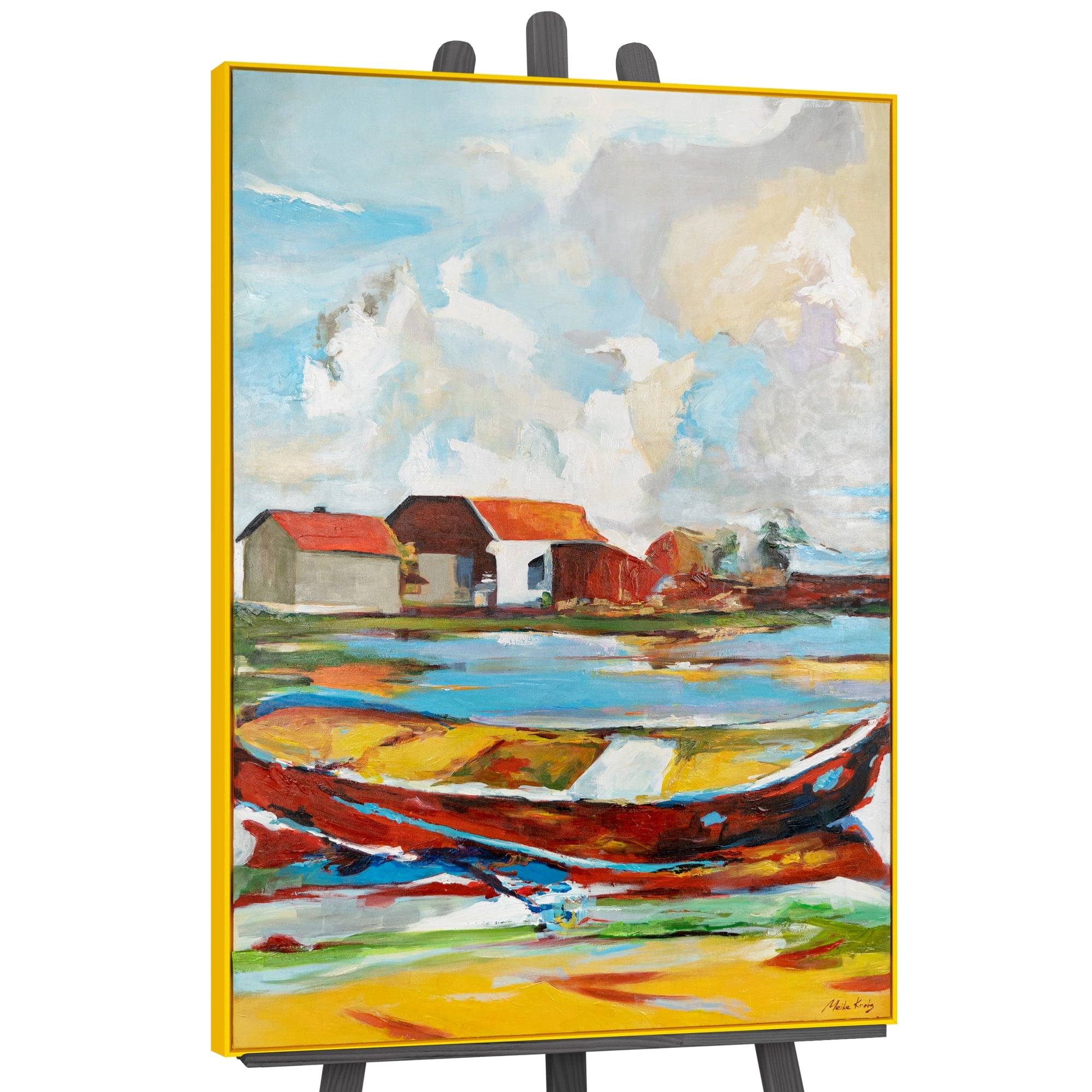 Enriquezca su hogar con esta pintura abstracta colorida que representa un paisaje idílico con barco y casas. El cuadro destaca por sus colores vivos y pinceladas expresivas. Está 100% pintado a mano y realzado con un elegante marco amarillo moderno.