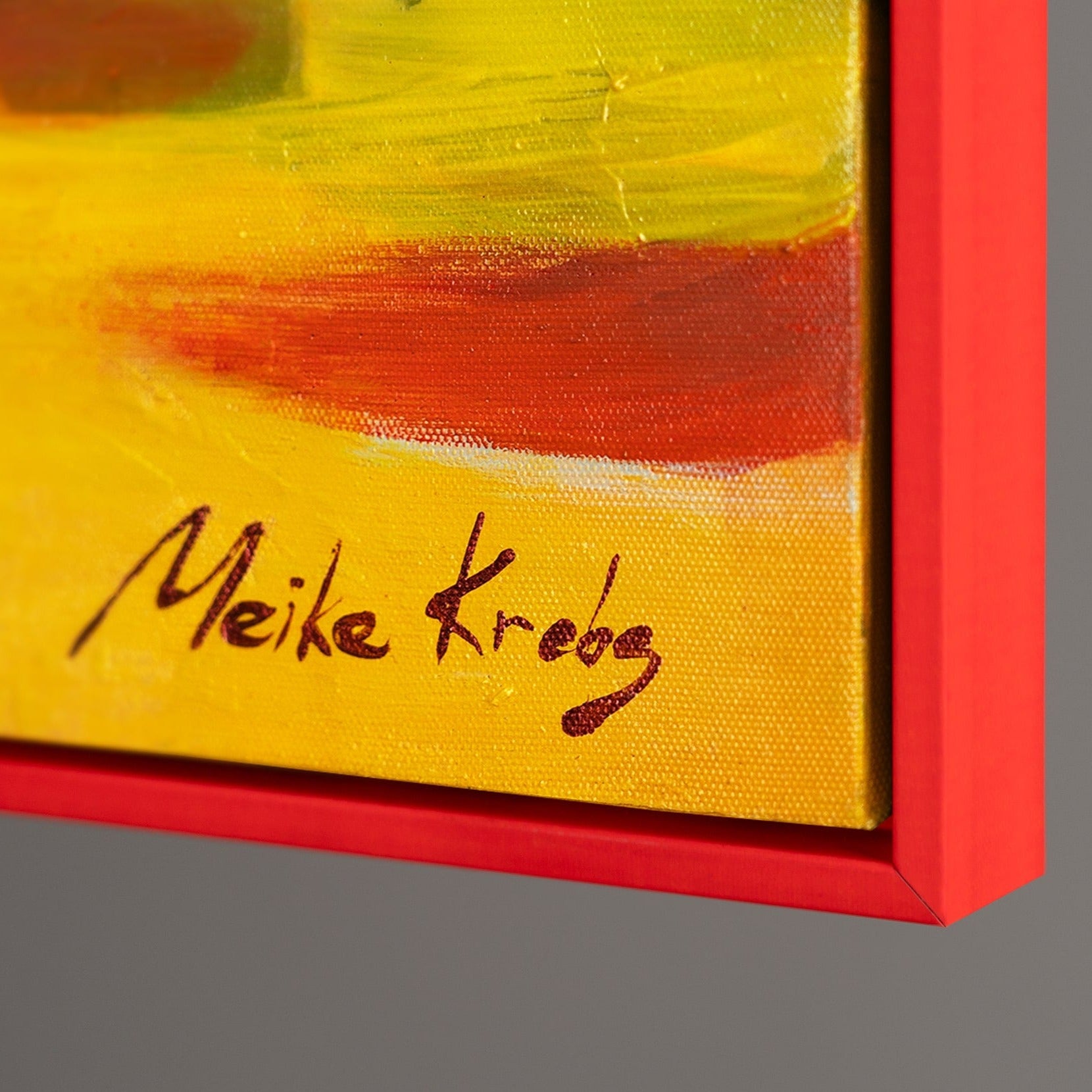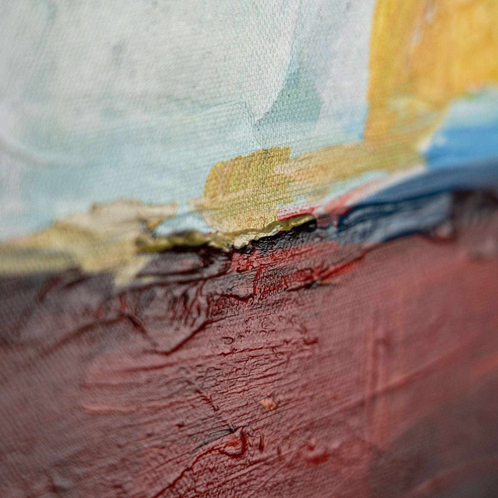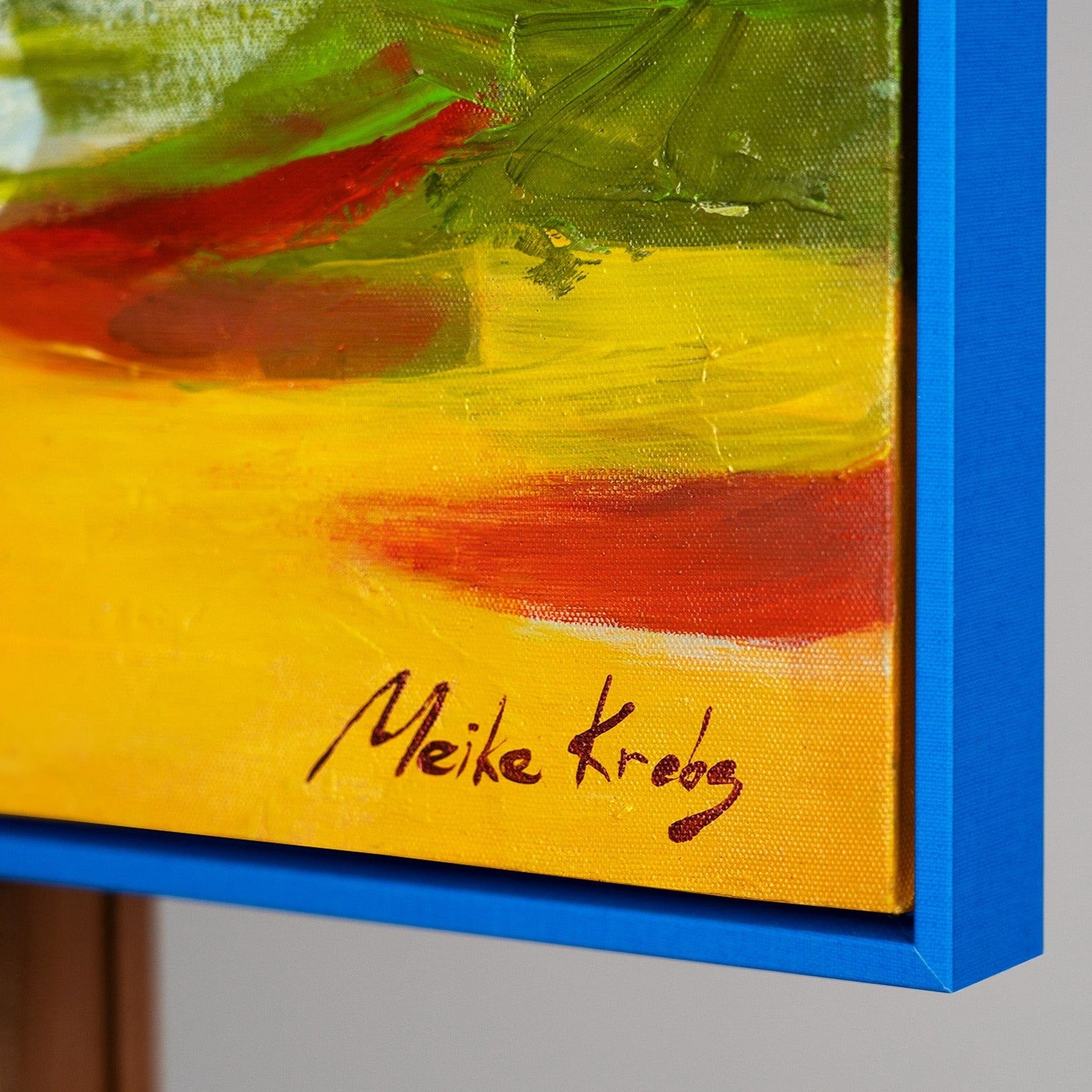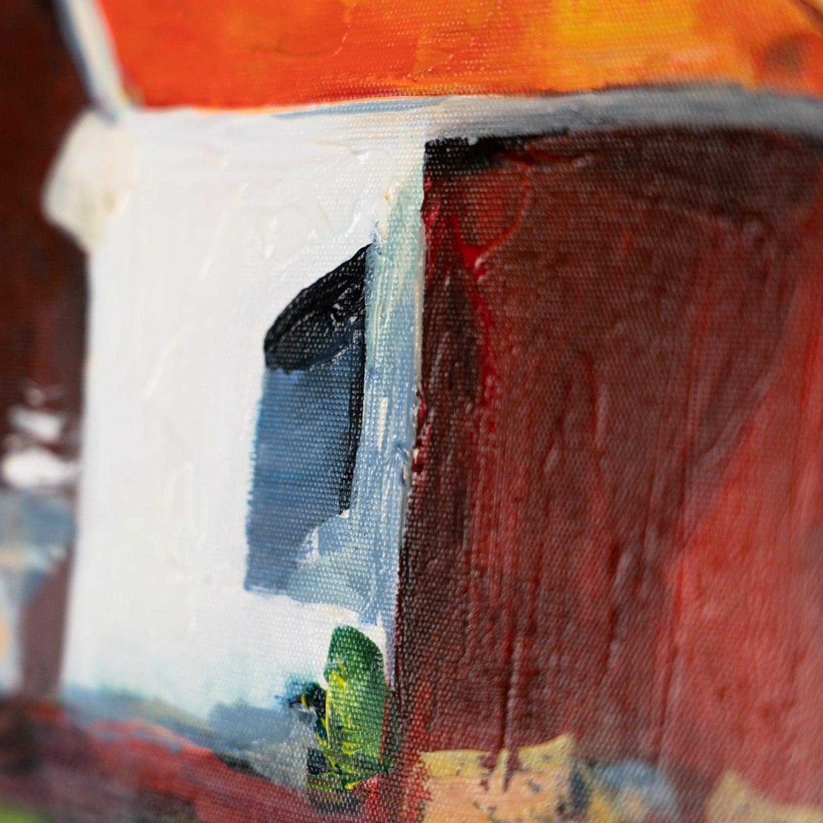 Enriquezca su hogar con esta pintura abstracta colorida que representa un paisaje idílico con barco y casas. El cuadro destaca por sus colores vivos y pinceladas expresivas. Está 100% pintado a mano y realzado con un elegante marco amarillo moderno.