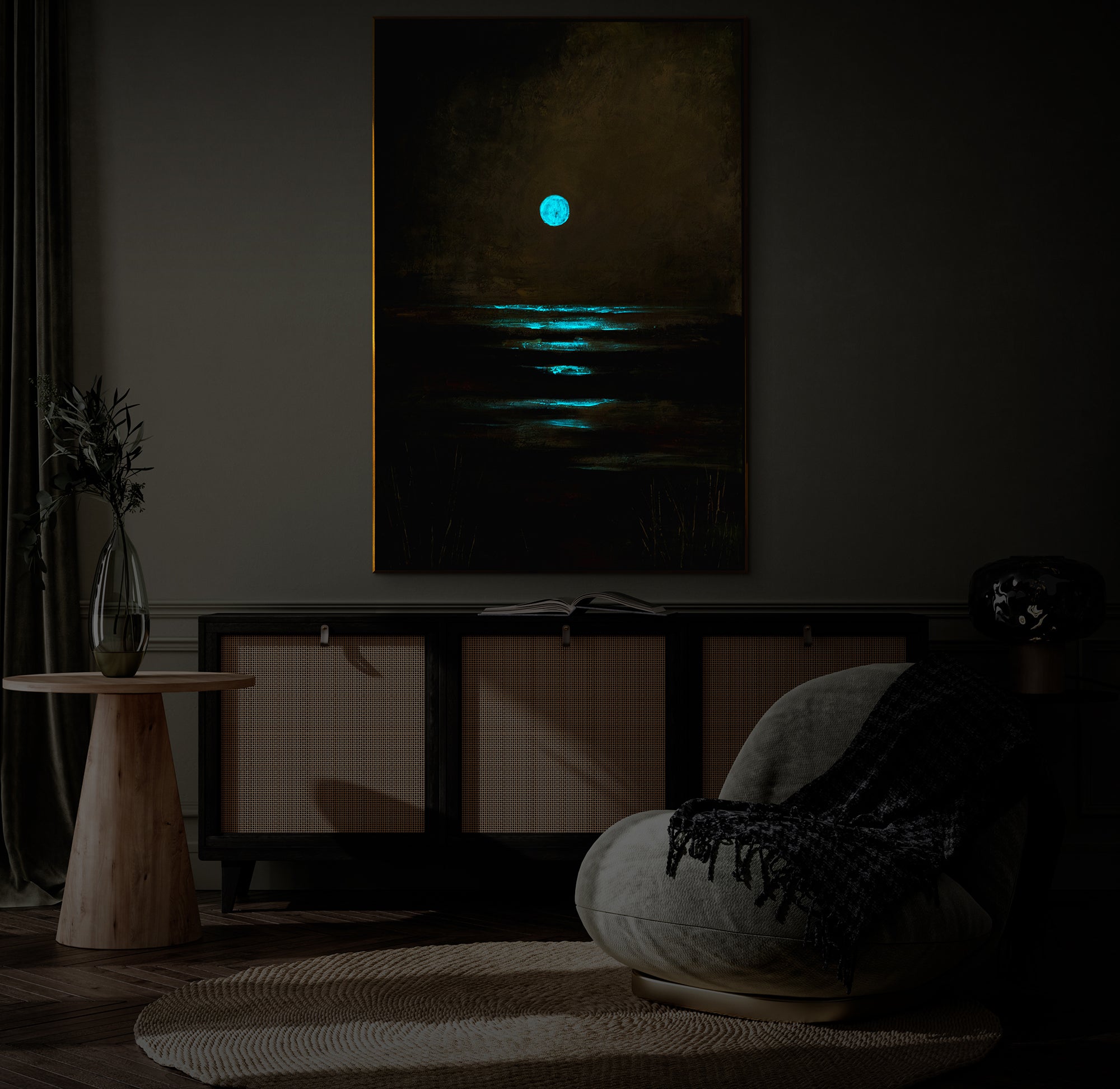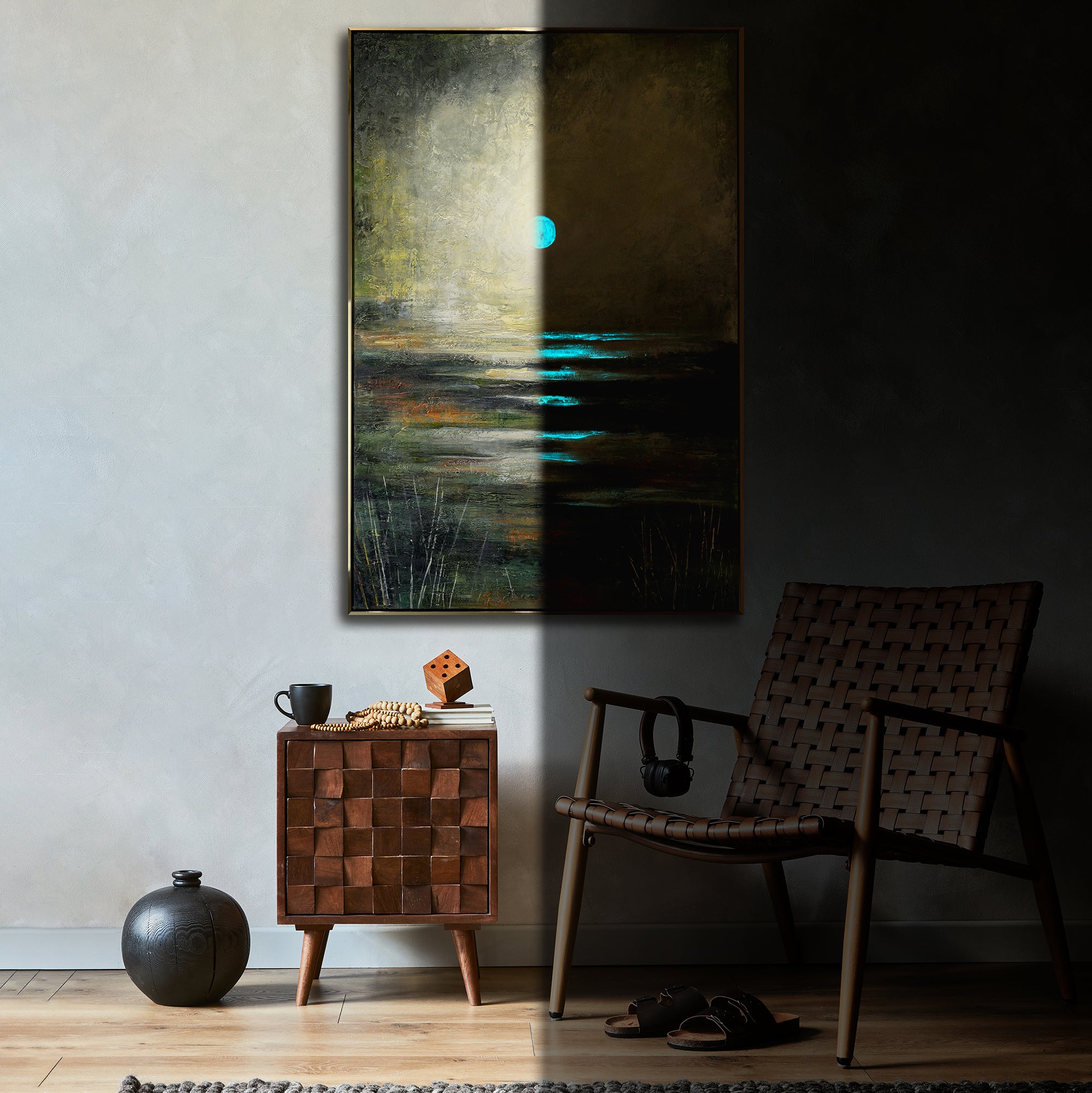 4. El cuadro se envía en un embalaje de alta calidad, asegurando que llegue de manera segura y en perfectas condiciones. Esta propuesta es totalmente innovadora para su interior, ya que hemos trabajado arduamente para crear una pieza que complemente su espacio tanto de día como de noche.