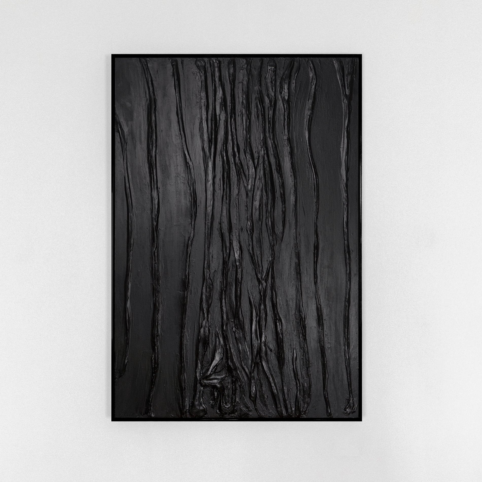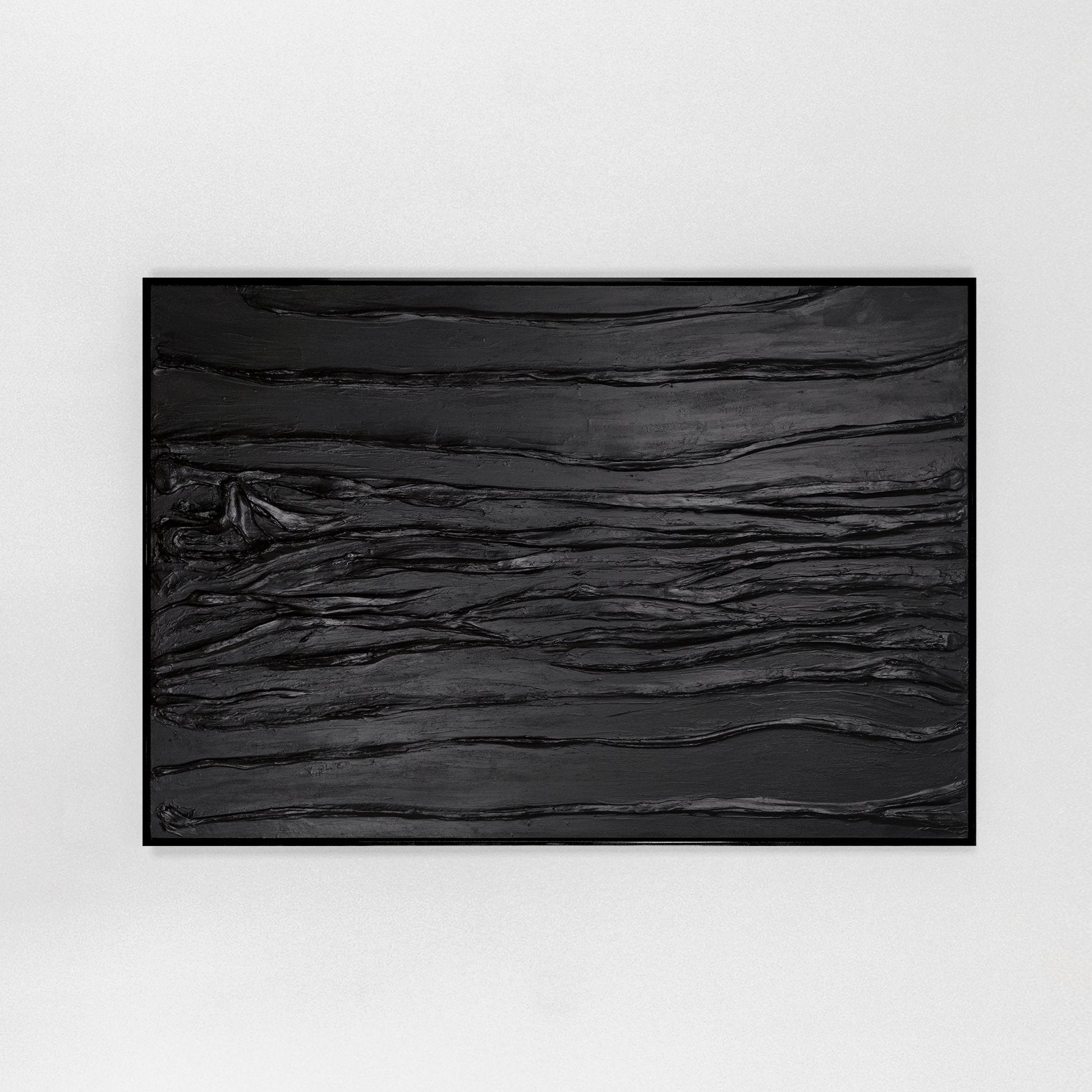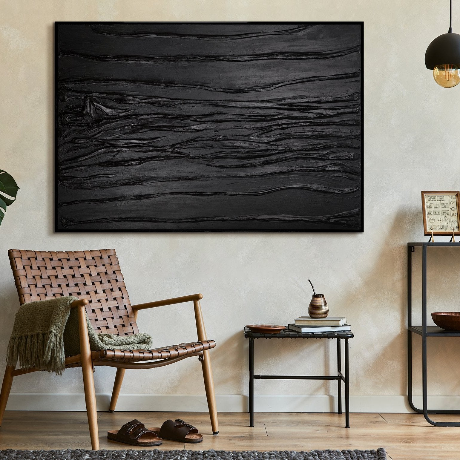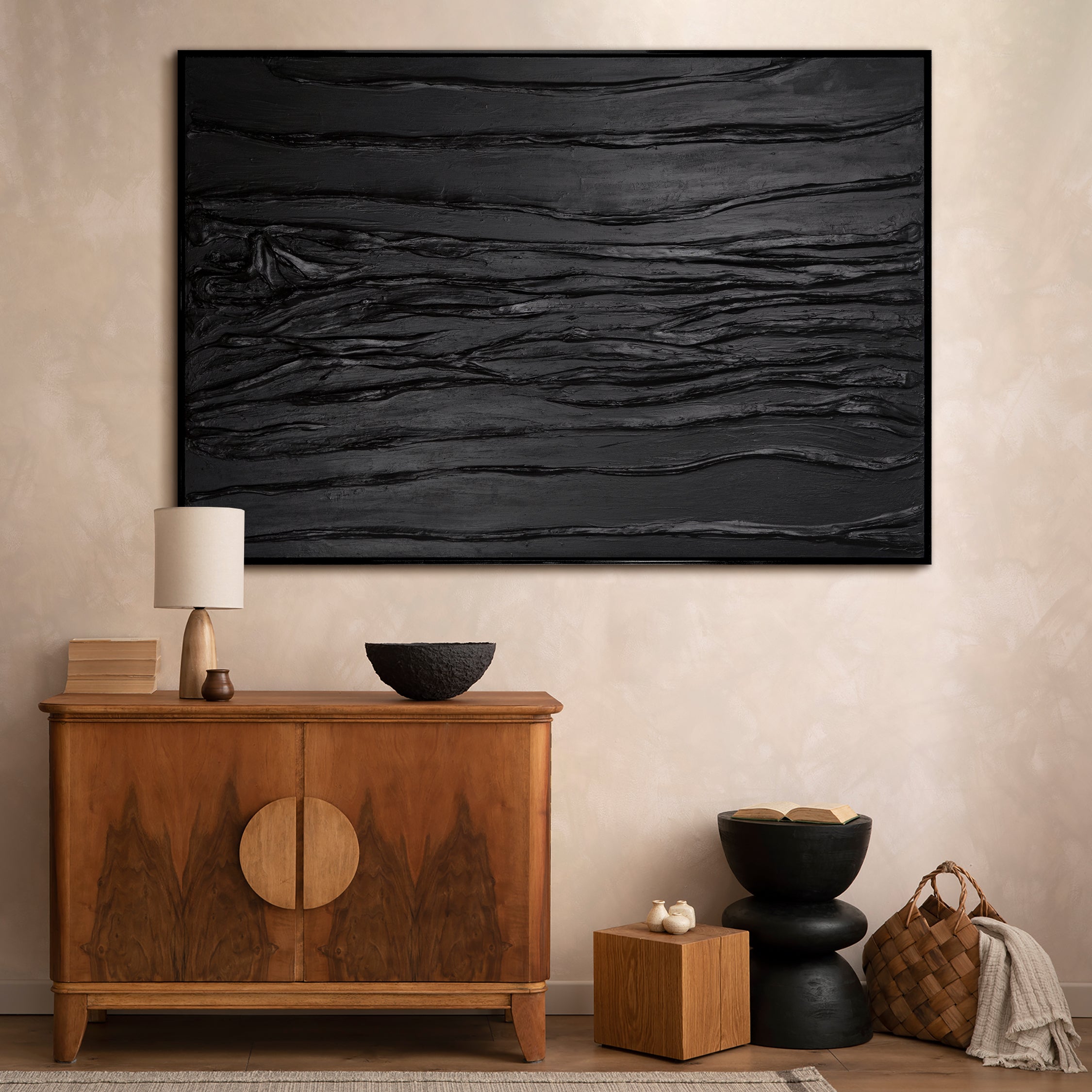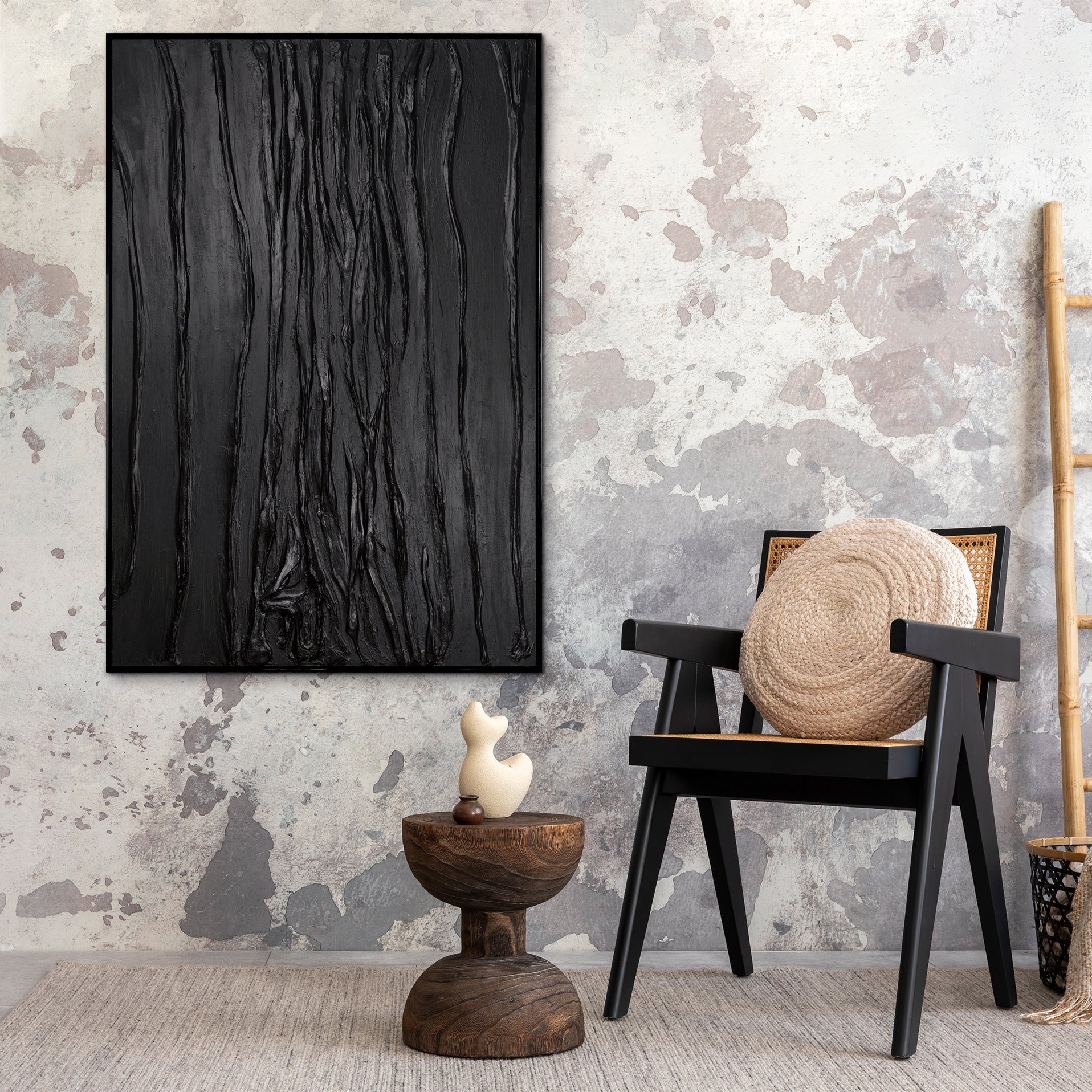 Sumérgete en la profundidad del “Susurro Nocturno”, una pintura acrílica en negro intenso que revela una belleza misteriosa en cada textura. Esta obra hecha a mano sobre lienzo fascina por su color profundo y su superficie dinámica, que captura de forma magistral el juego entre luz y sombra.