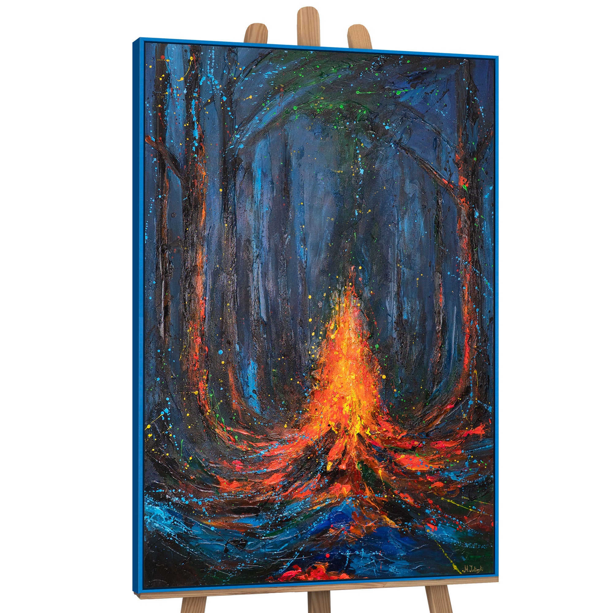 Ein mystisch beleuchteter Wald in tiefem Blau und Schwarz bildet die Kulisse für ein leuchtendes, flammendes Feuer im Zentrum. Die glühend orangen und roten Pinselstriche tanzen wie Funken durch die Dunkelheit und erzeugen ein dramatisches Lichtspiel. Fluoreszierende Farbsprenkel verleihen dem Kunstwerk eine geheimnisvolle, fast magische Atmosphäre – besonders eindrucksvoll bei Dunkelheit.