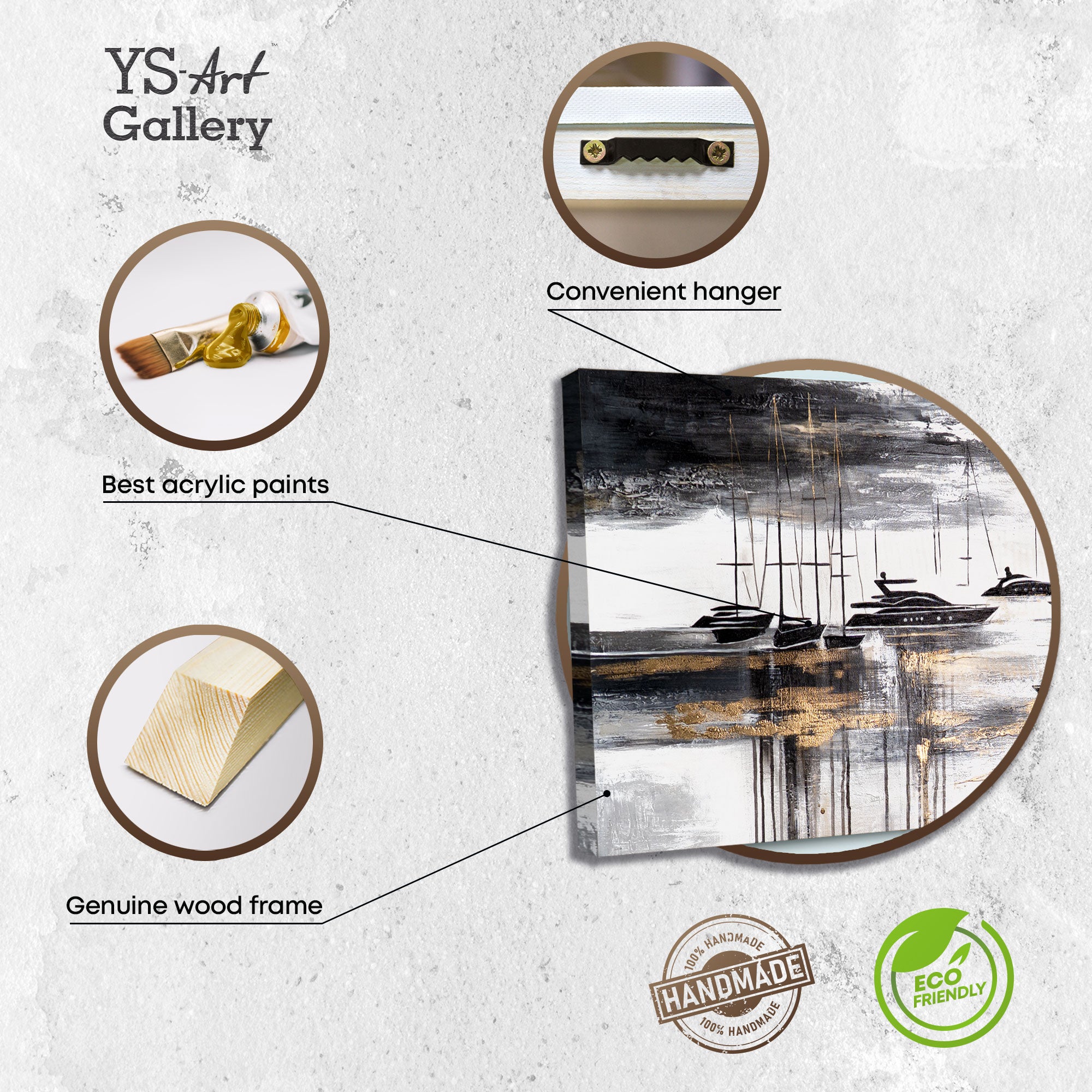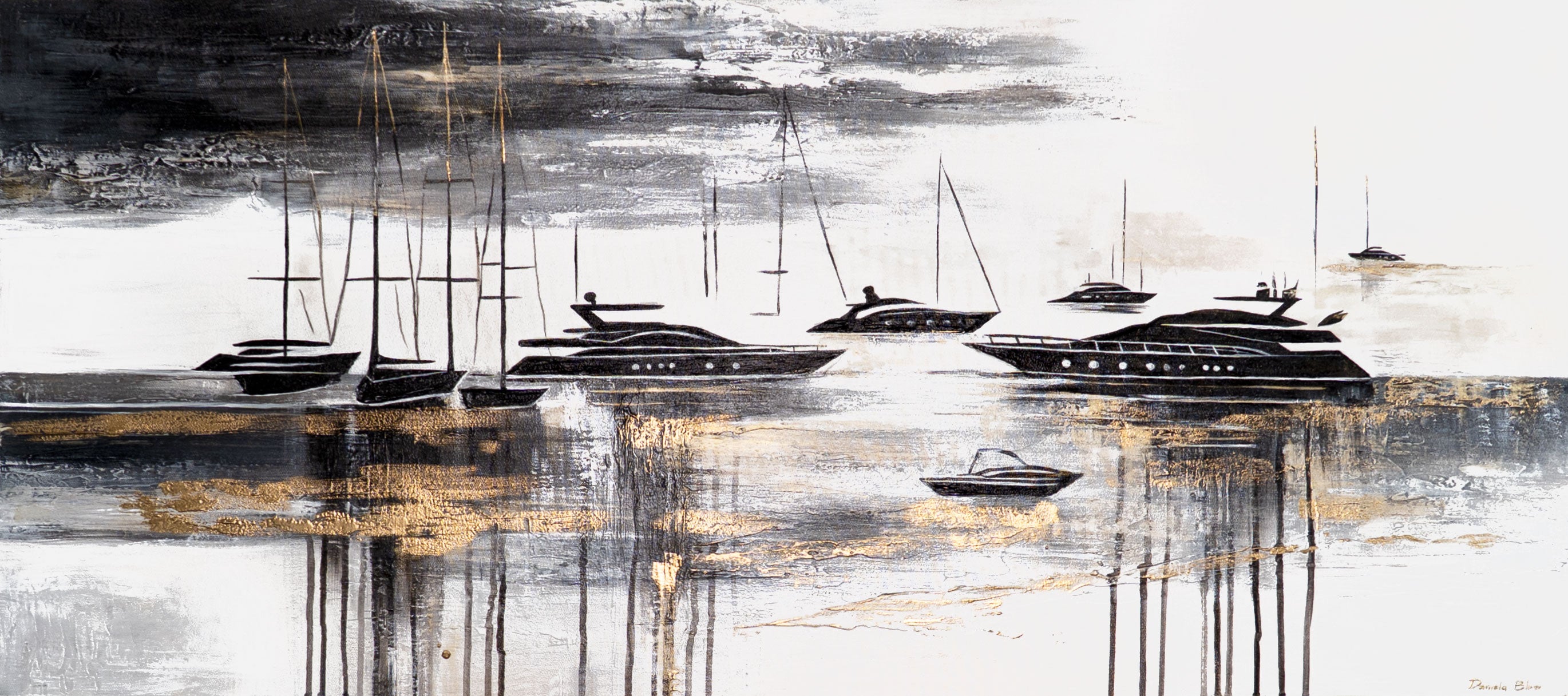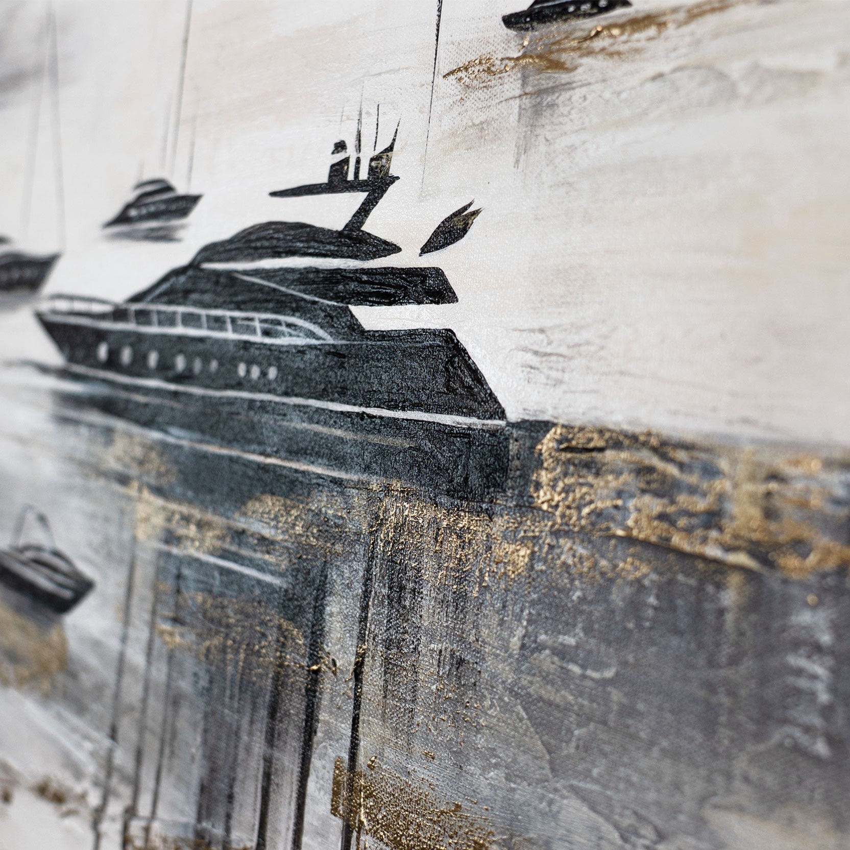 „Yachten“ ist ein stilvolles, handgemaltes Acrylbild auf Leinwand, das eine ruhige maritime Szene mit eleganten Yachten in Schwarz, Weiß und Gold zeigt. Die strukturierte Malweise verleiht der Darstellung Tiefe und Glanz, während der monochrome Kontrast mit goldenen Akzenten eine moderne, luxuriöse Atmosphäre schafft.
